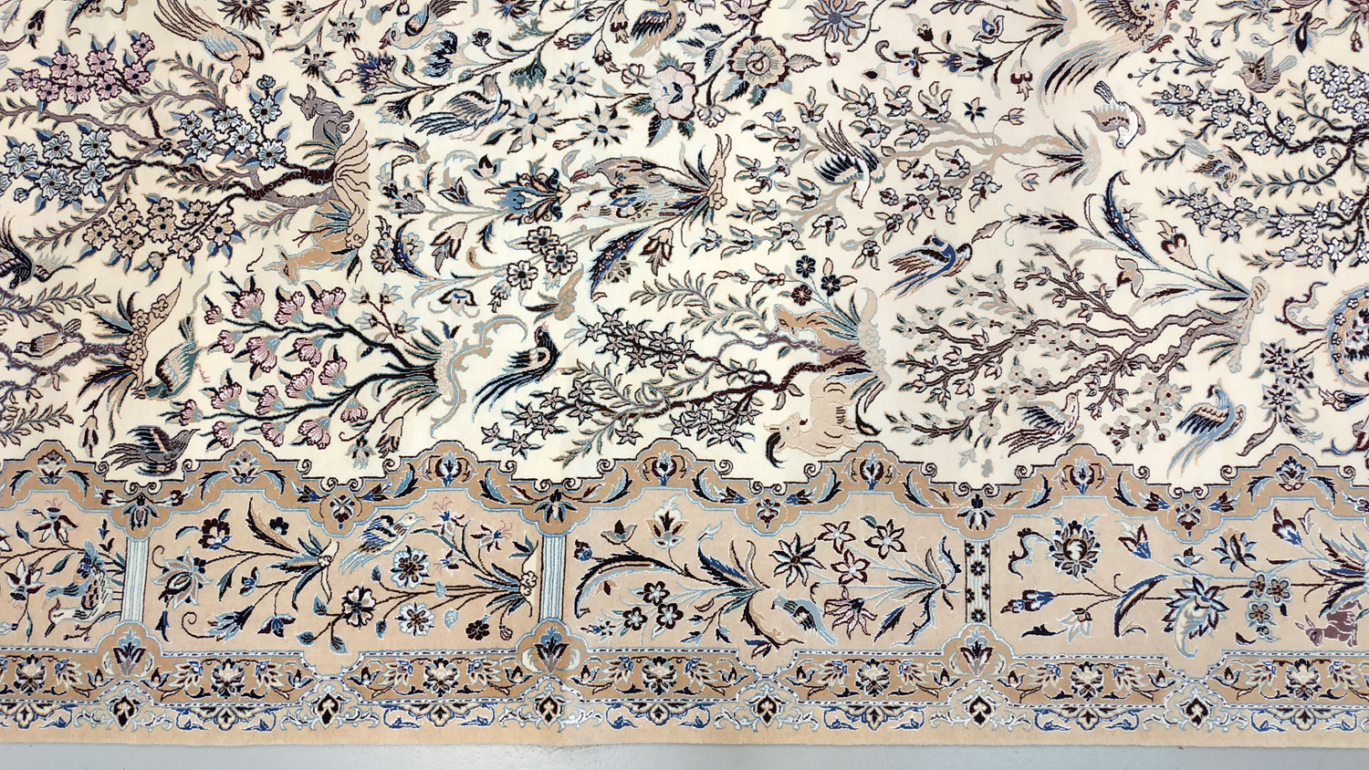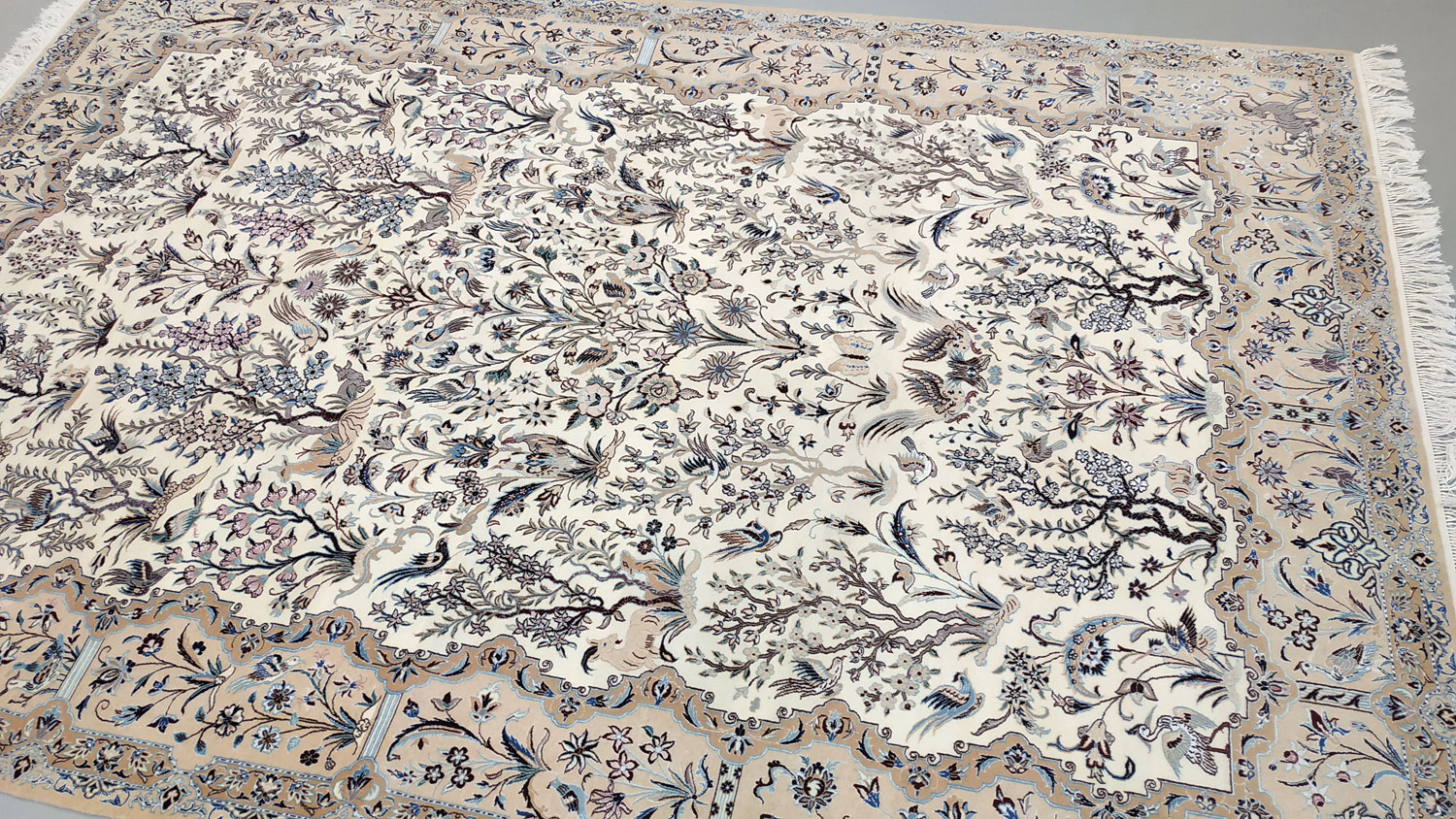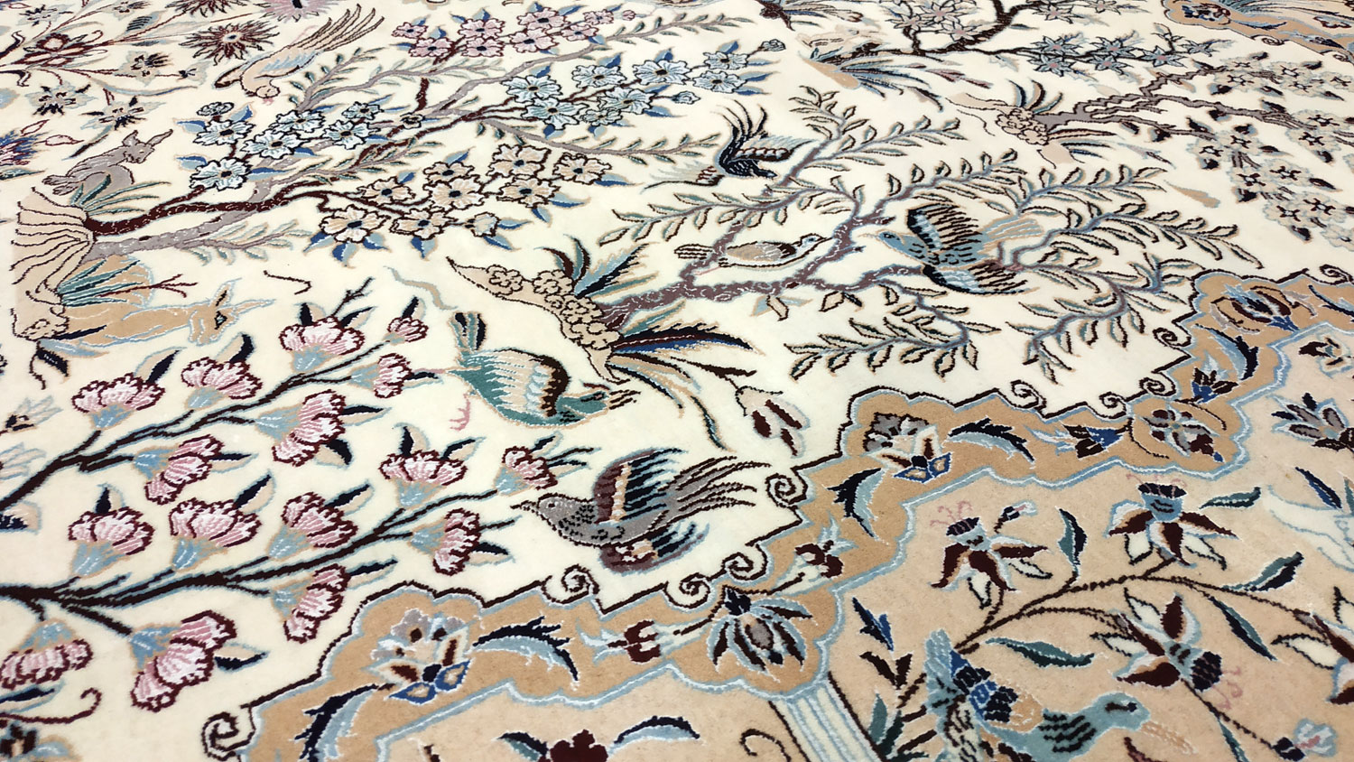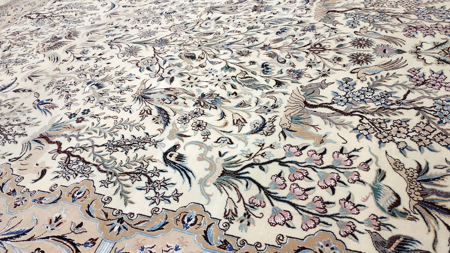 Dimensions : 298 x 207 cm -laine et soie- Pays Iran - Épaisseur : 8 mm - Densité de nouage : 800.000 Nœuds au m² - Surface : 6.17 m² - Poids : 15.42 Kgs - Age : contemporain - Confection : Noué main - Forme : Tapis de salon - Type : Tapis persan