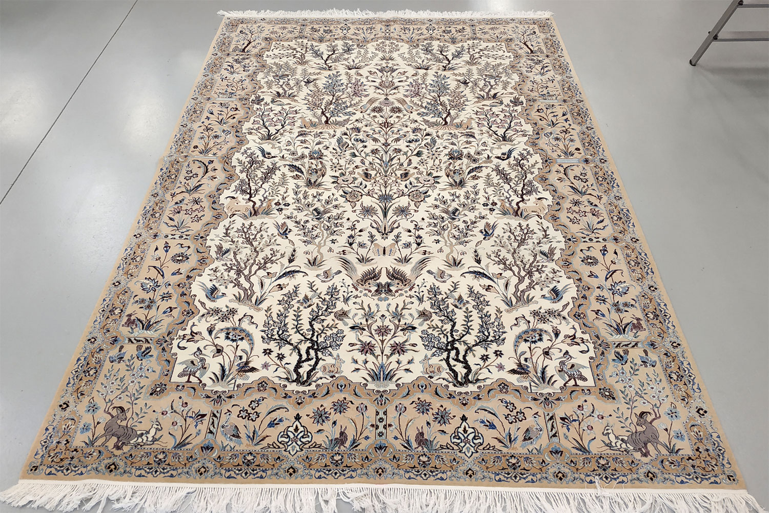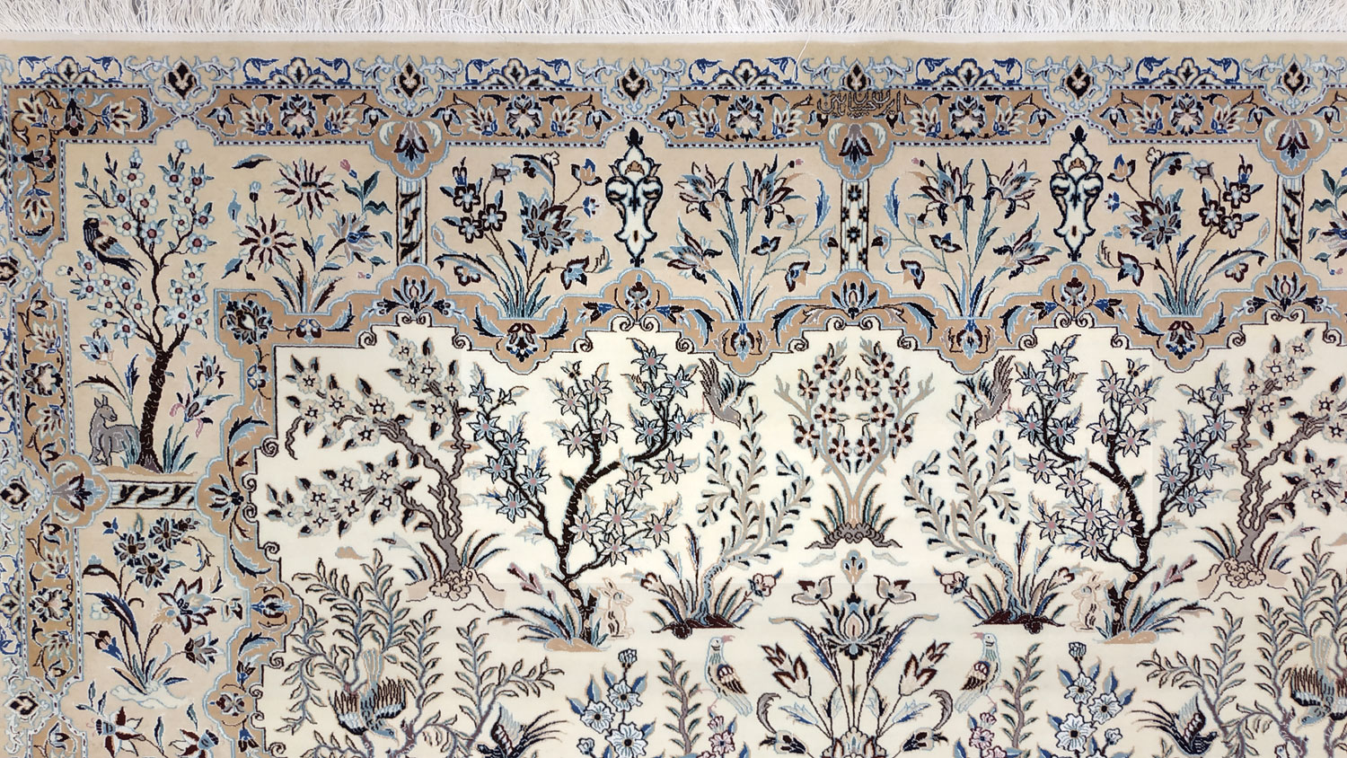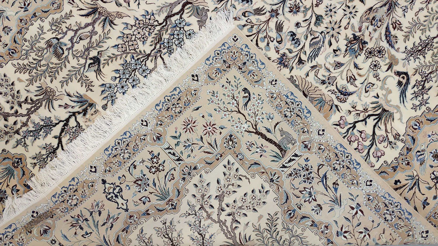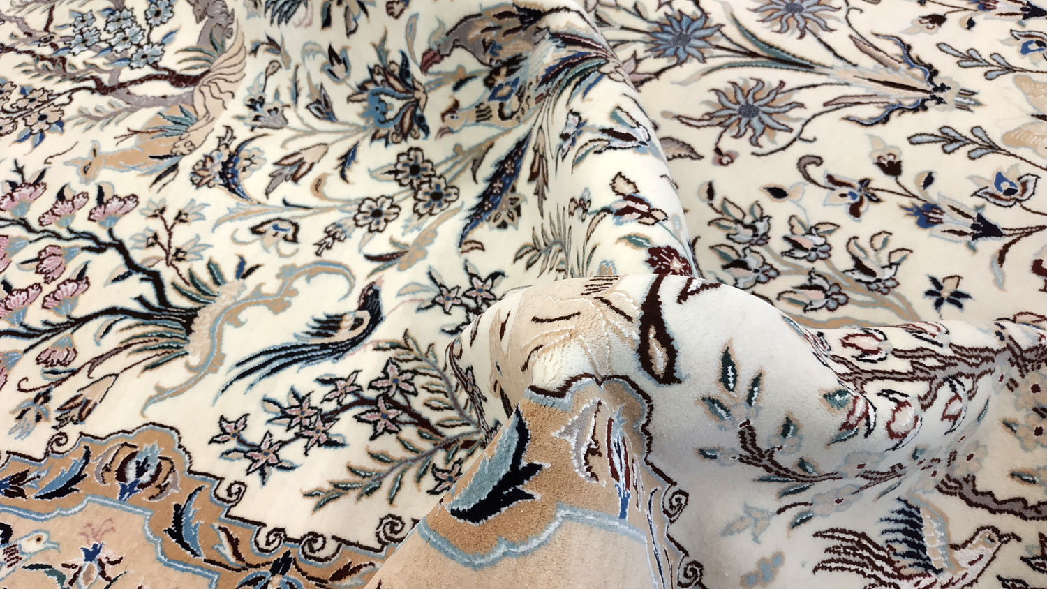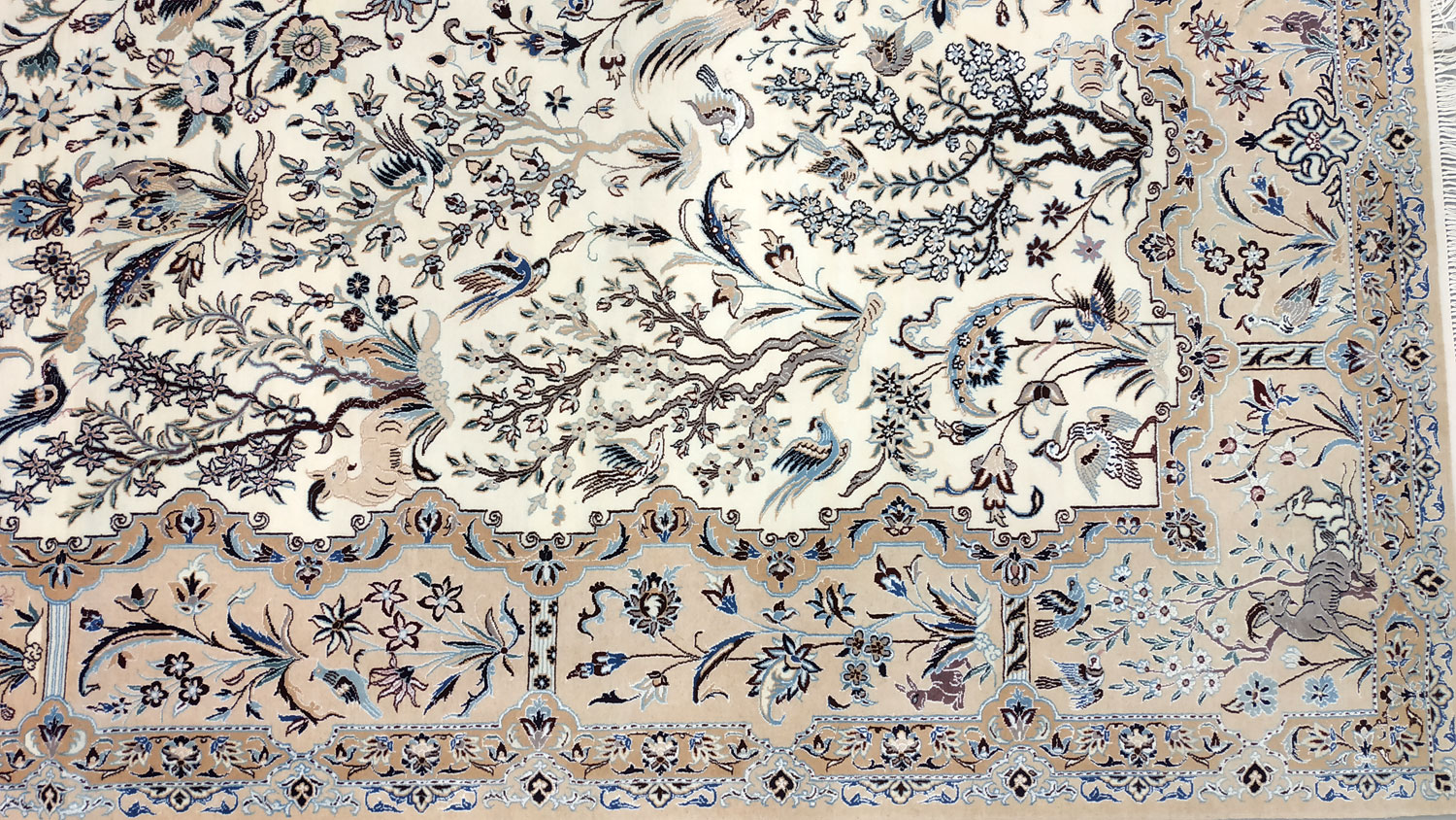 Dimensions : 298 x 207 cm -laine et soie- Pays Iran - Épaisseur : 8 mm - Densité de nouage : 800.000 Nœuds au m² - Surface : 6.17 m² - Poids : 15.42 Kgs - Age : contemporain - Confection : Noué main - Forme : Tapis de salon - Type : Tapis persan