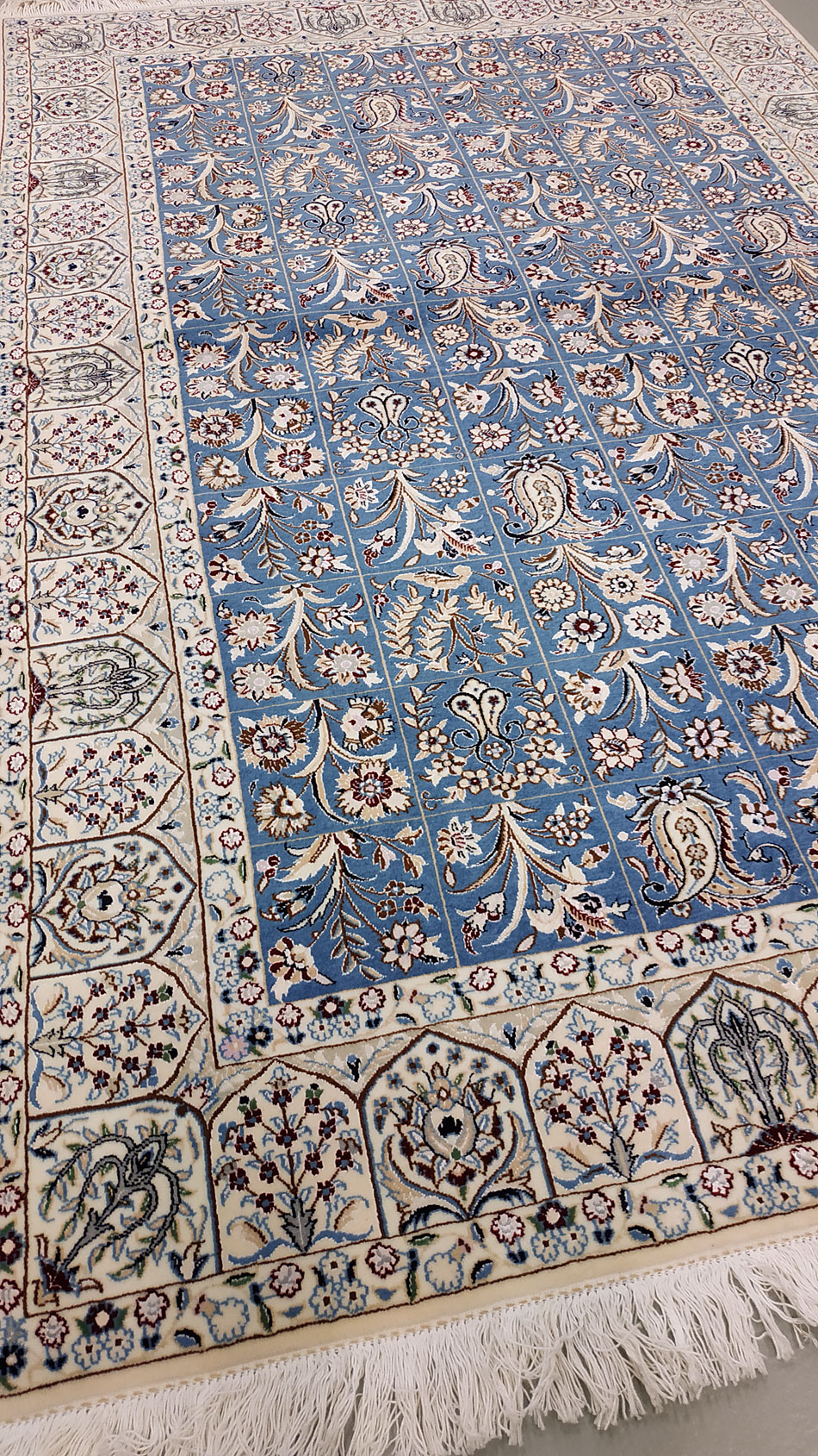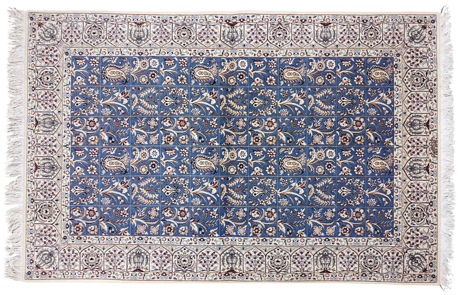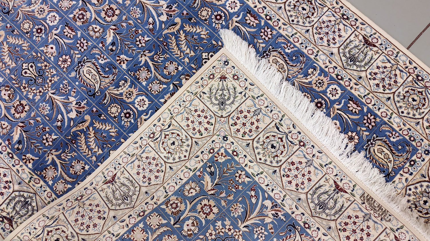 Dimensions : 190 x 128 cm -laine et soie- Pays Iran - Épaisseur : 8 mm - Densité de nouage : 800.000 Nœuds au m² - Surface : 2.43 m² - Poids : 6.08 Kgs - Age : contemporain - Confection : Noué main - Forme : Tapis de chambre - Type : Tapis persan