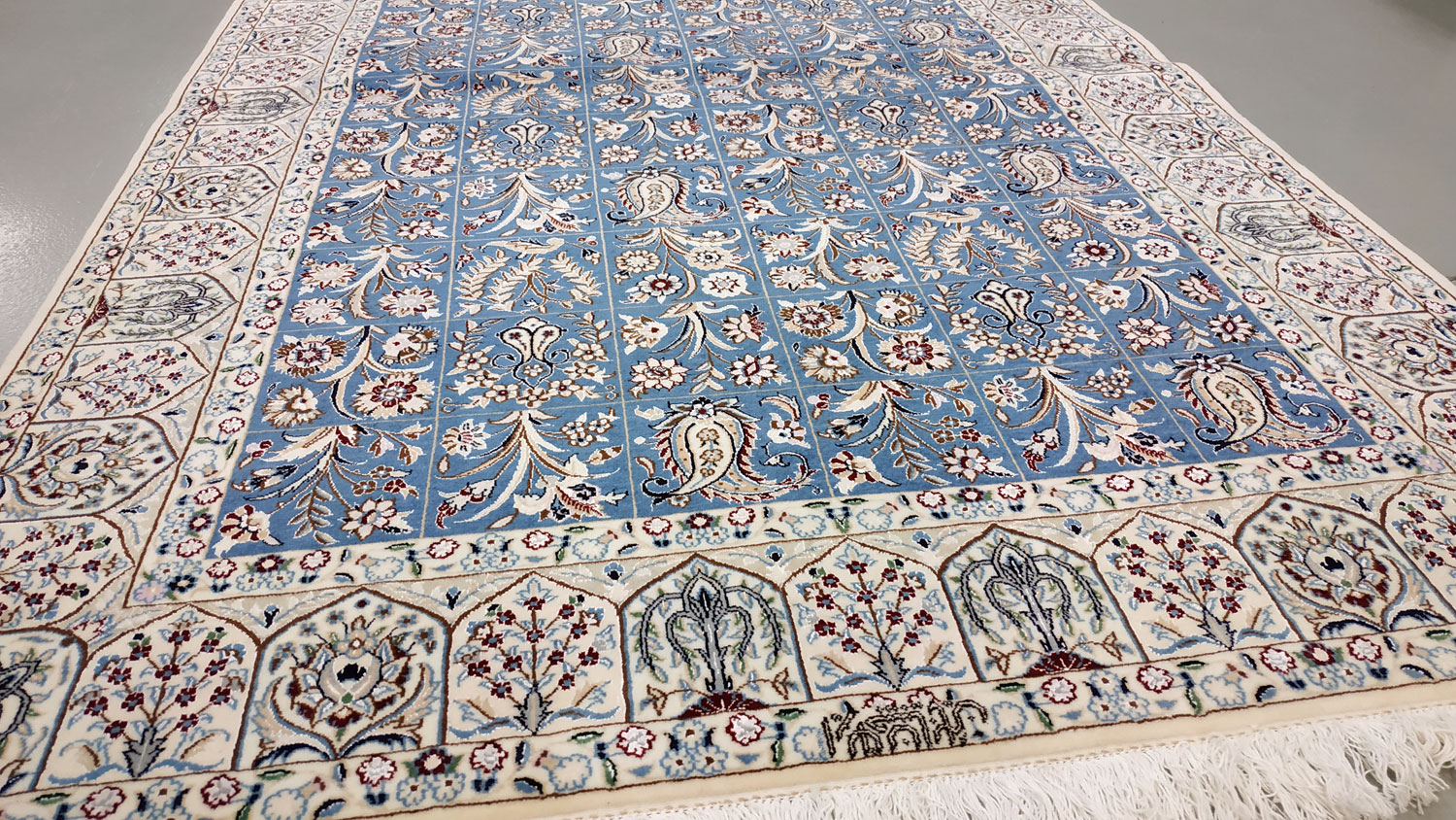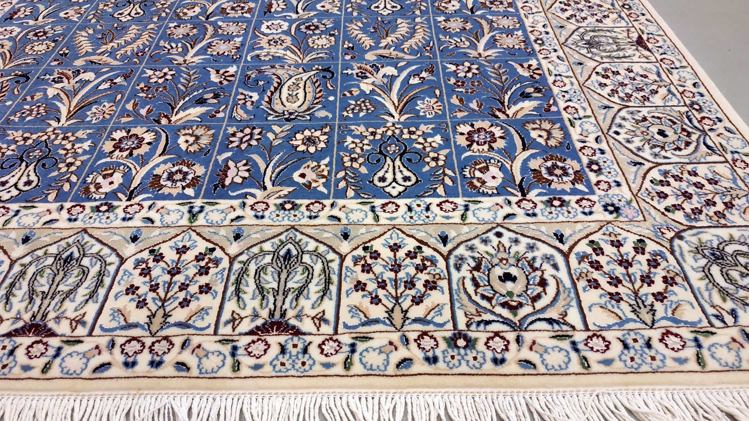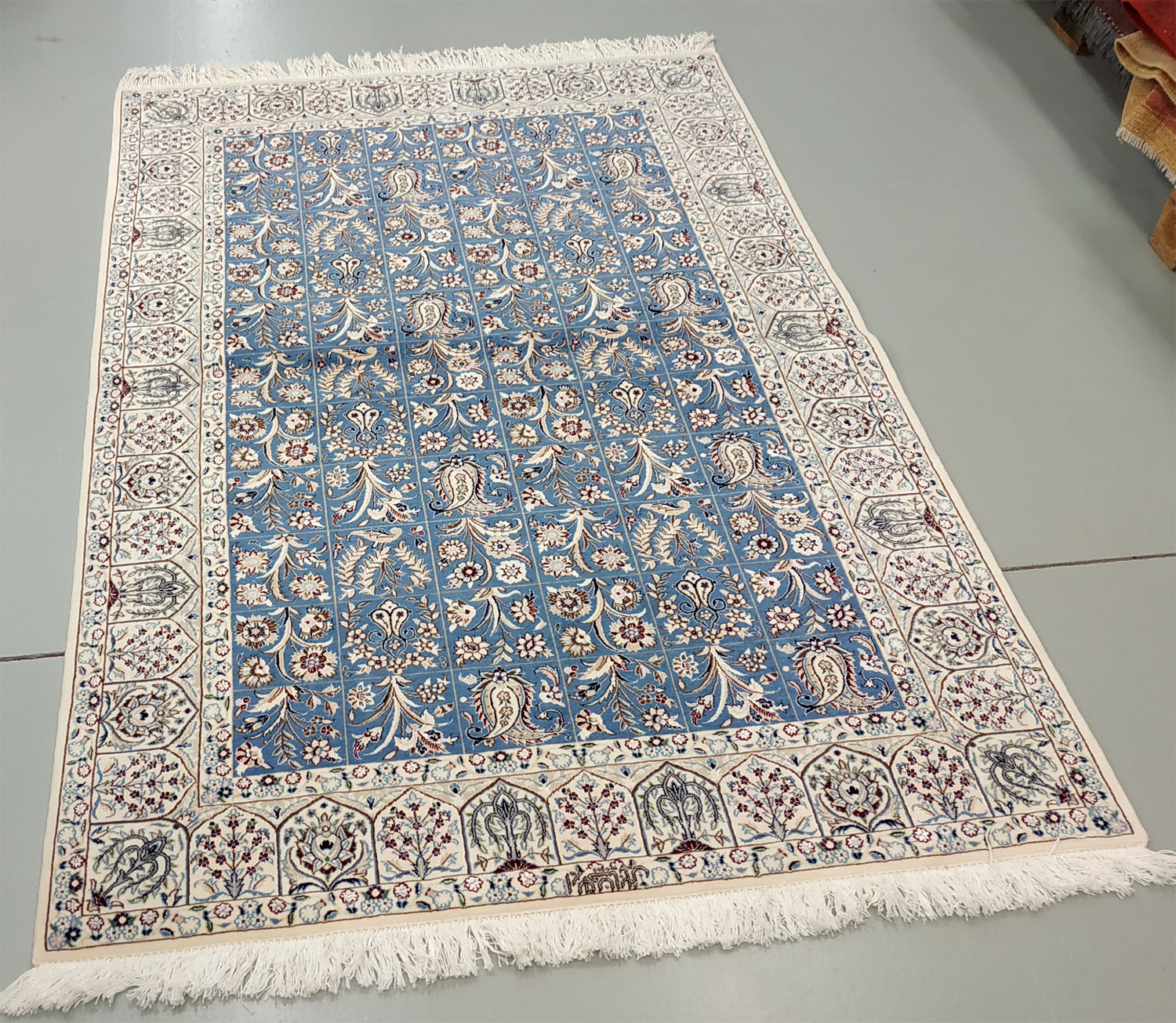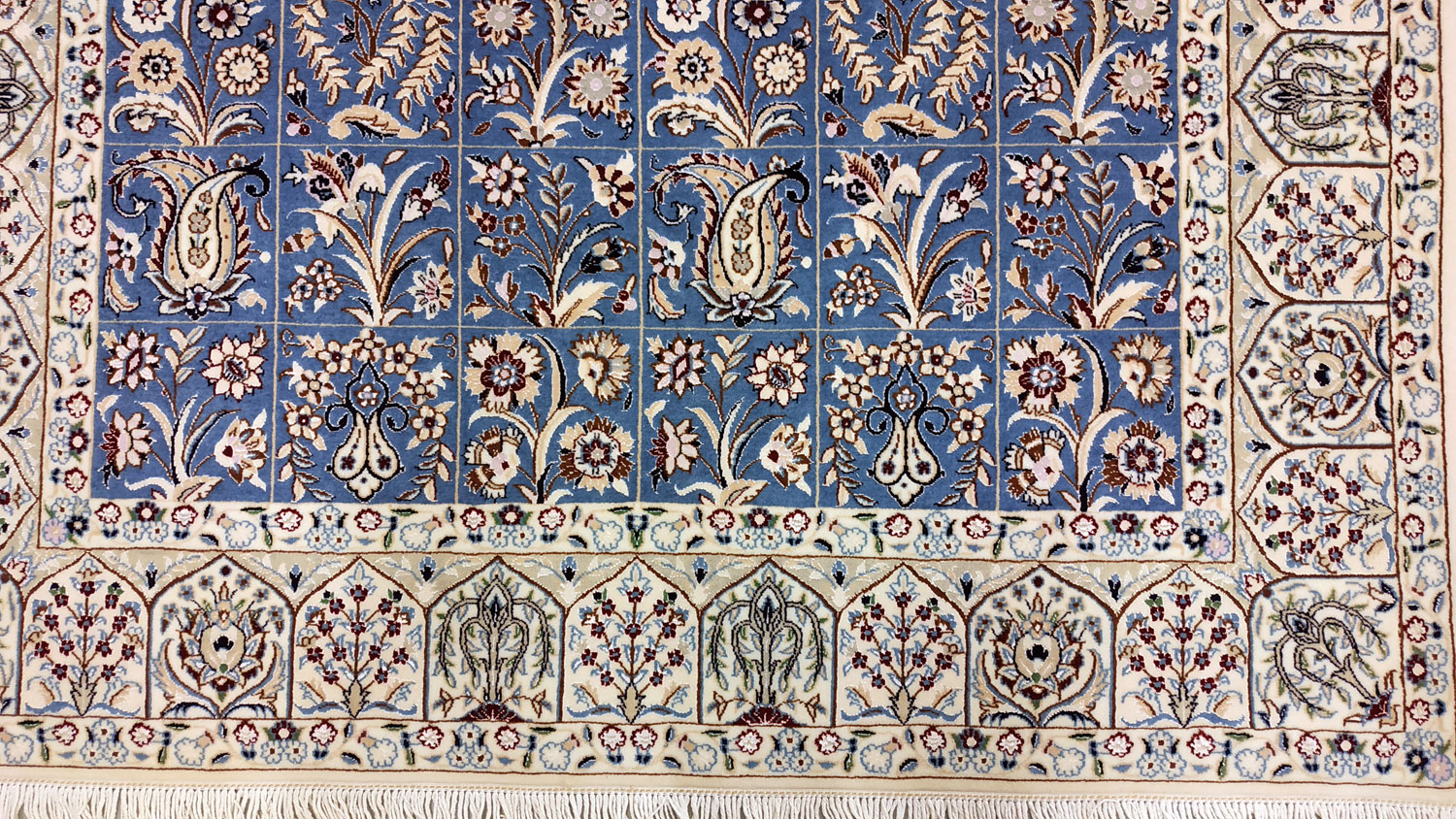 Dimensions : 183 x 124 cm -laine et soie- Pays Iran - Épaisseur : 8 mm - Densité de nouage : 800.000 Nœuds au m² - Surface : 2.27 m² - Poids : 5.67 Kgs - Age : contemporain - Confection : Noué main - Forme : Tapis de chambre - Type : Tapis persan