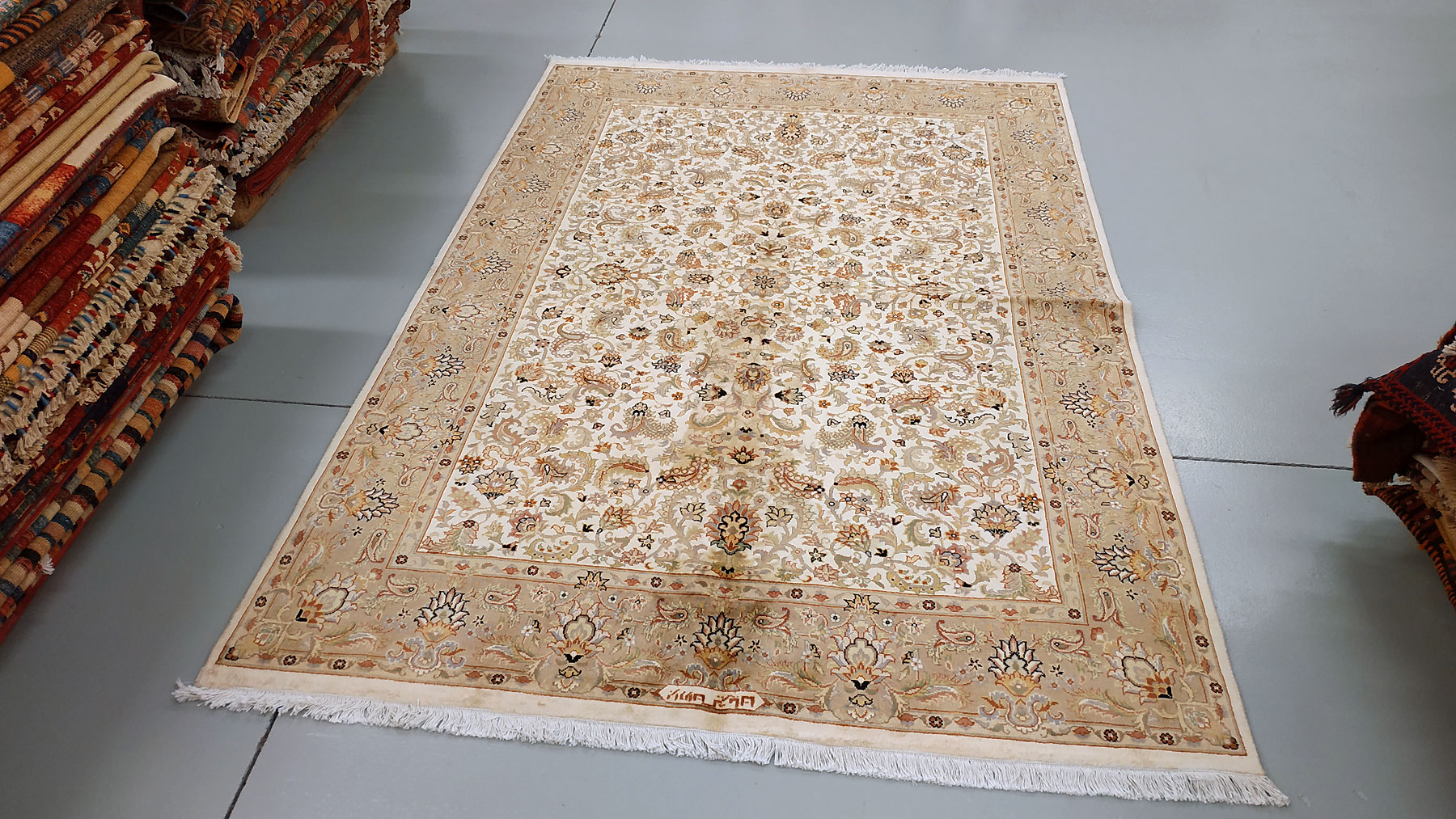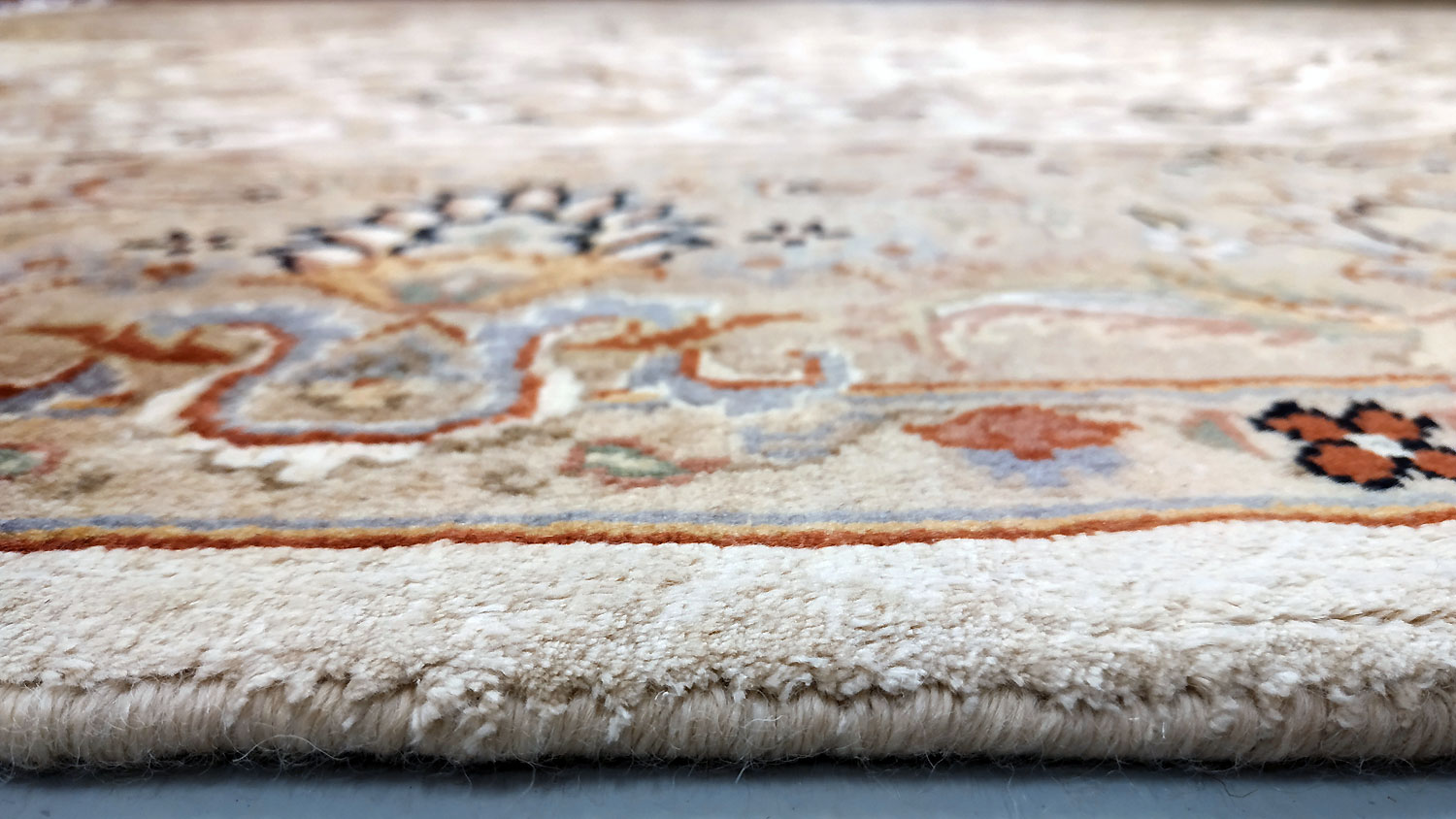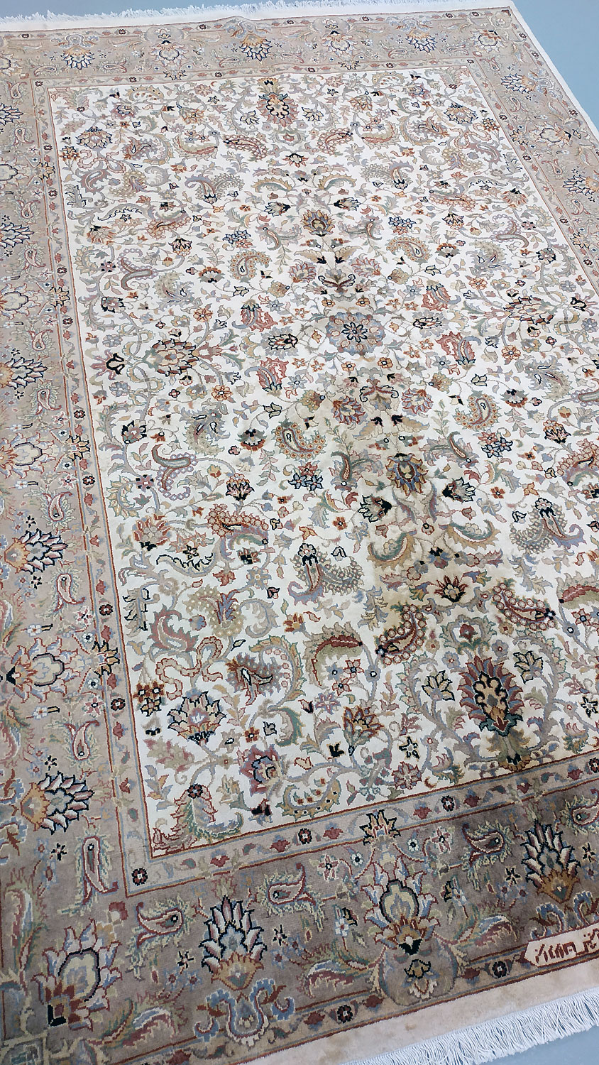 Dimensions : 241 x 171 cm -laine et soie- Pays Inde - Épaisseur : 10 mm - Densité de nouage : 500.000 Nœuds au m² - Surface : 4.12 m² - Poids : 10.3 Kgs - Age : contemporain - Confection : Noué main - Forme : Tapis de chambre - Type : Tapis Oriental