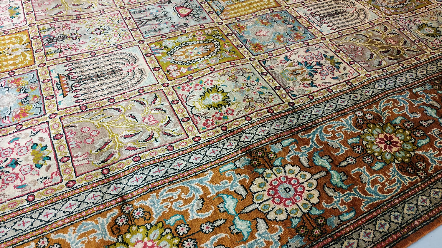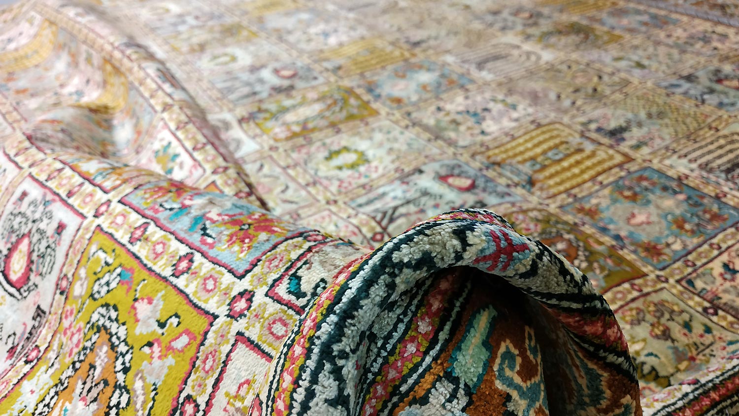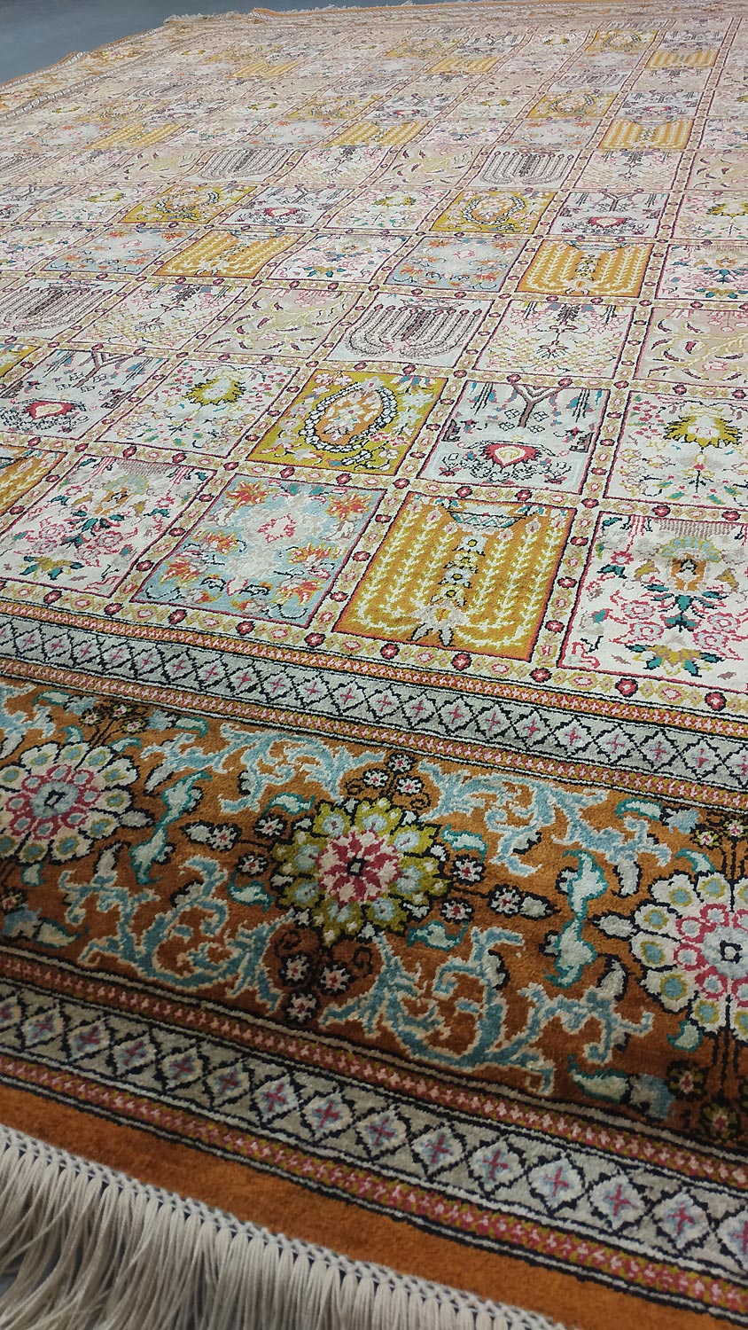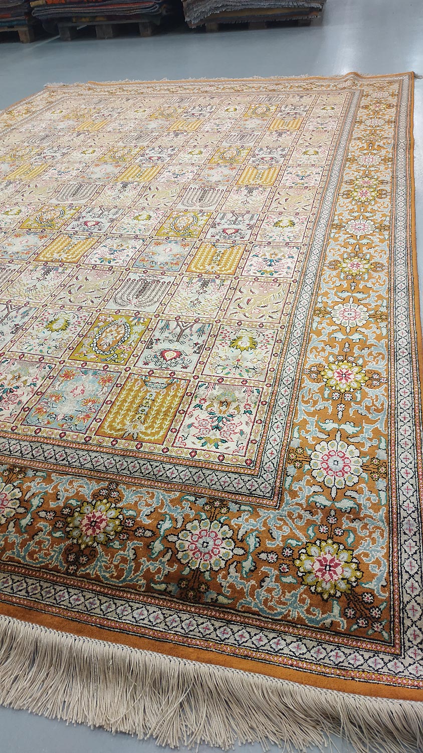 Dimensions : 293 x 194 cm -soie- Pays Iran - Épaisseur : 3 mm - Densité de nouage : 1.000.000 Nœuds au m² - Surface : 5.68 m² - Poids : 11.37 Kgs - Age : contemporain - Confection : Noué main - Forme : Tapis de salon - Type : Tapis persan