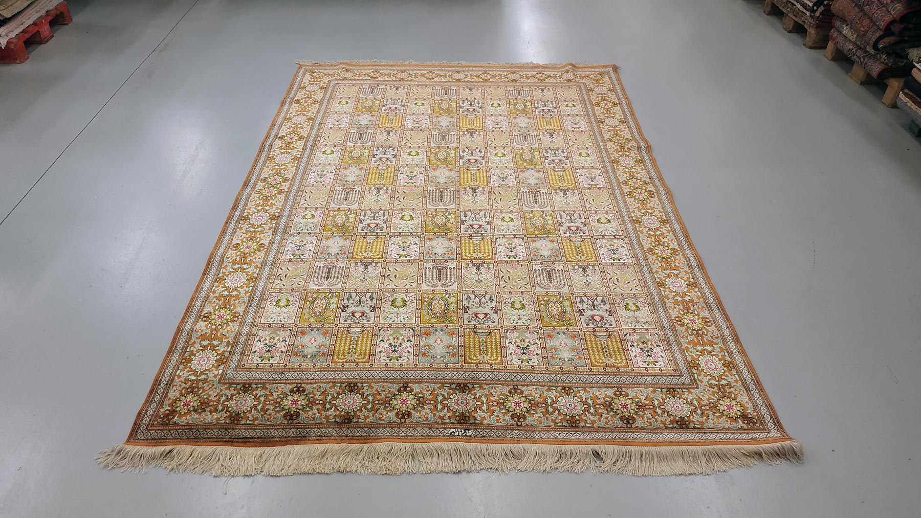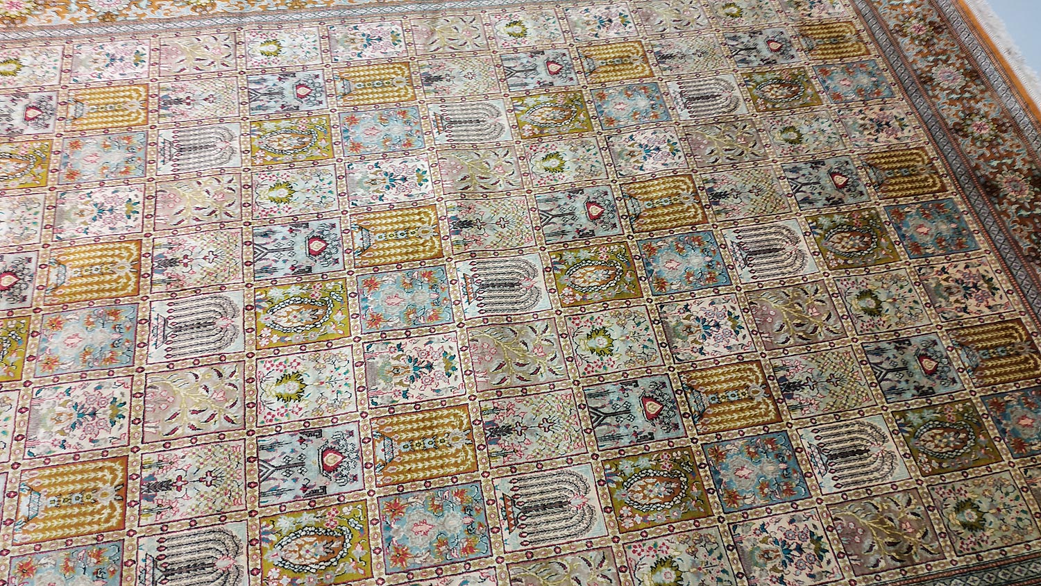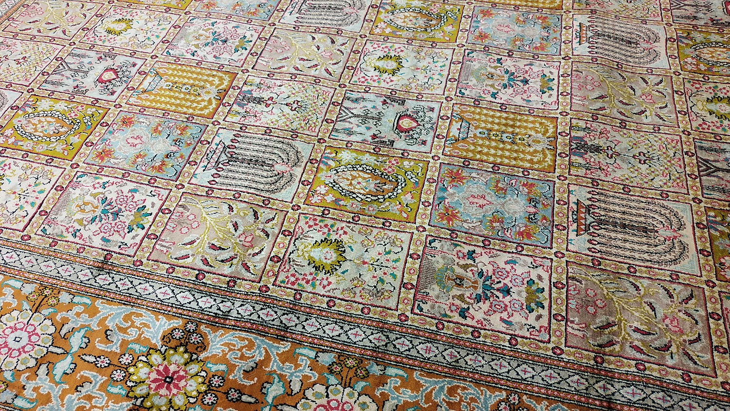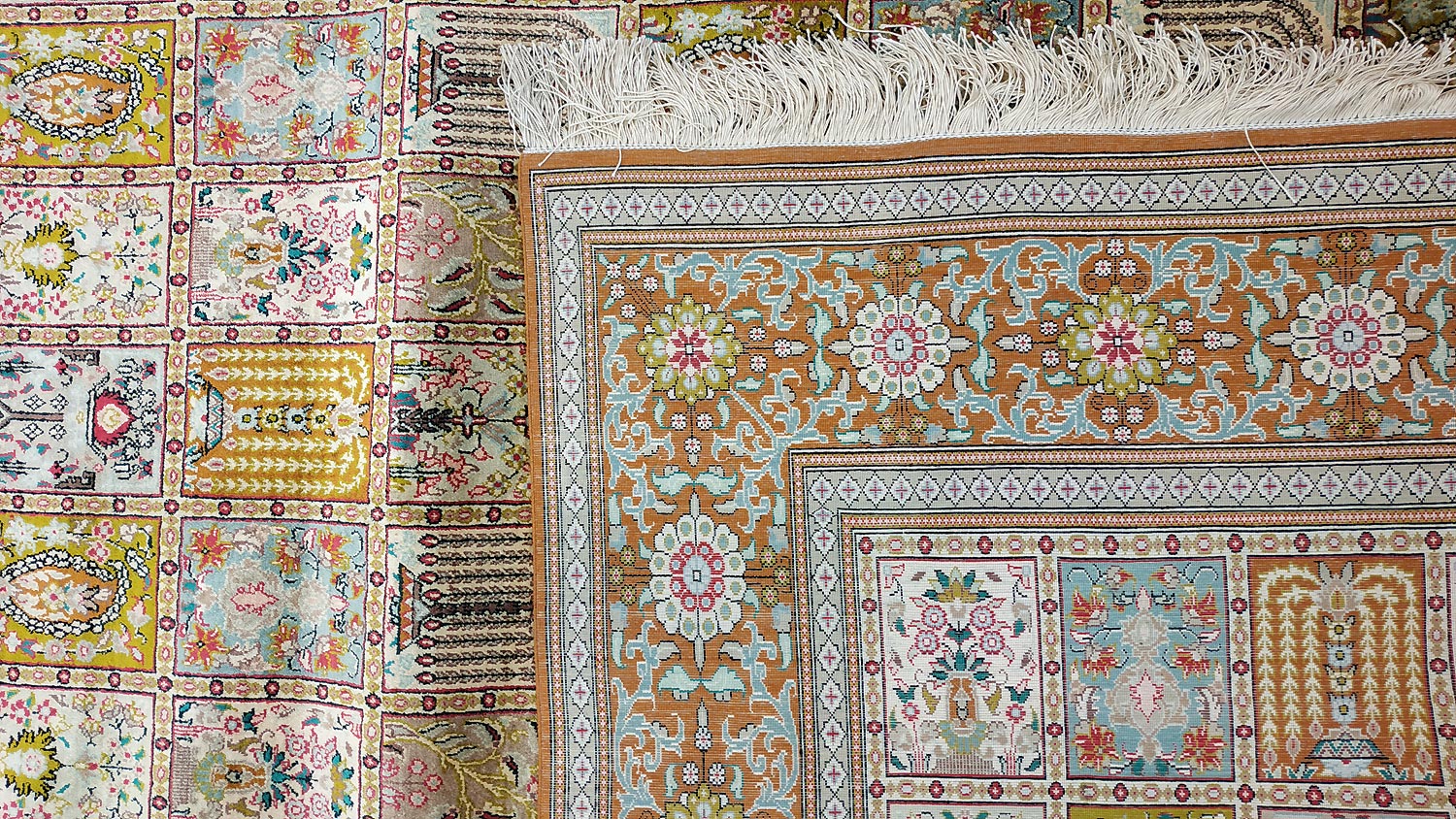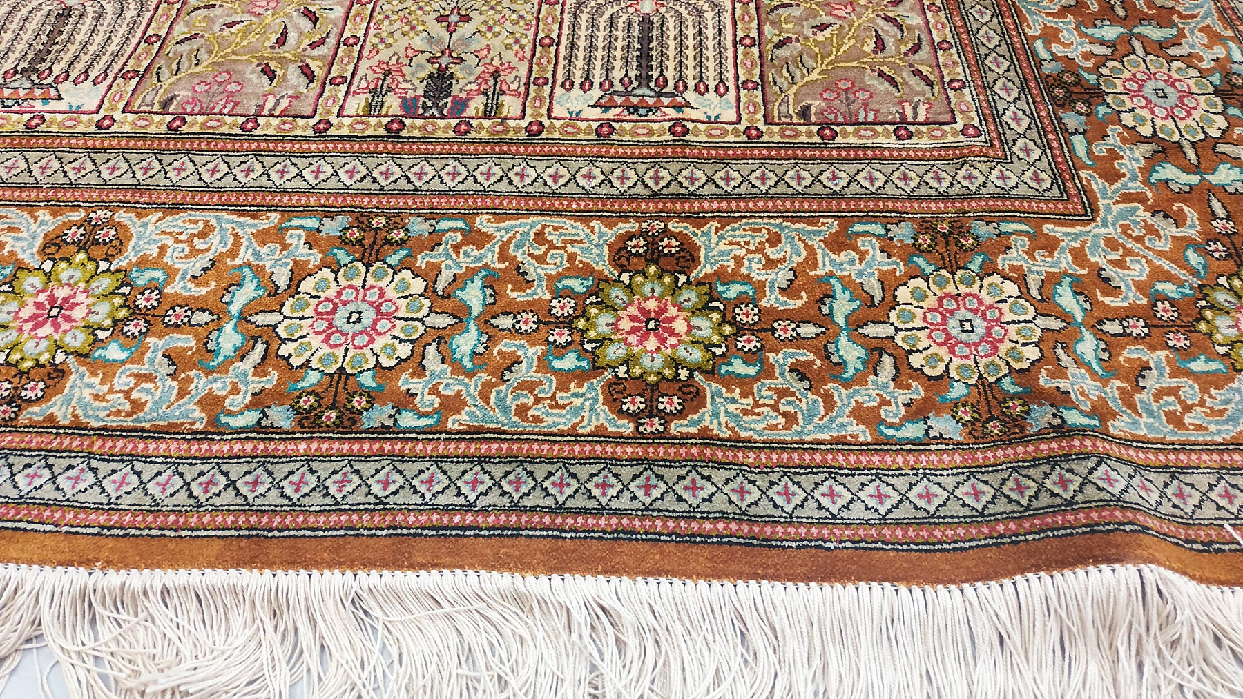Dimensions : 293 x 194 cm -soie- Pays Iran - Épaisseur : 3 mm - Densité de nouage : 1.000.000 Nœuds au m² - Surface : 5.68 m² - Poids : 11.37 Kgs - Age : contemporain - Confection : Noué main - Forme : Tapis de salon - Type : Tapis persan