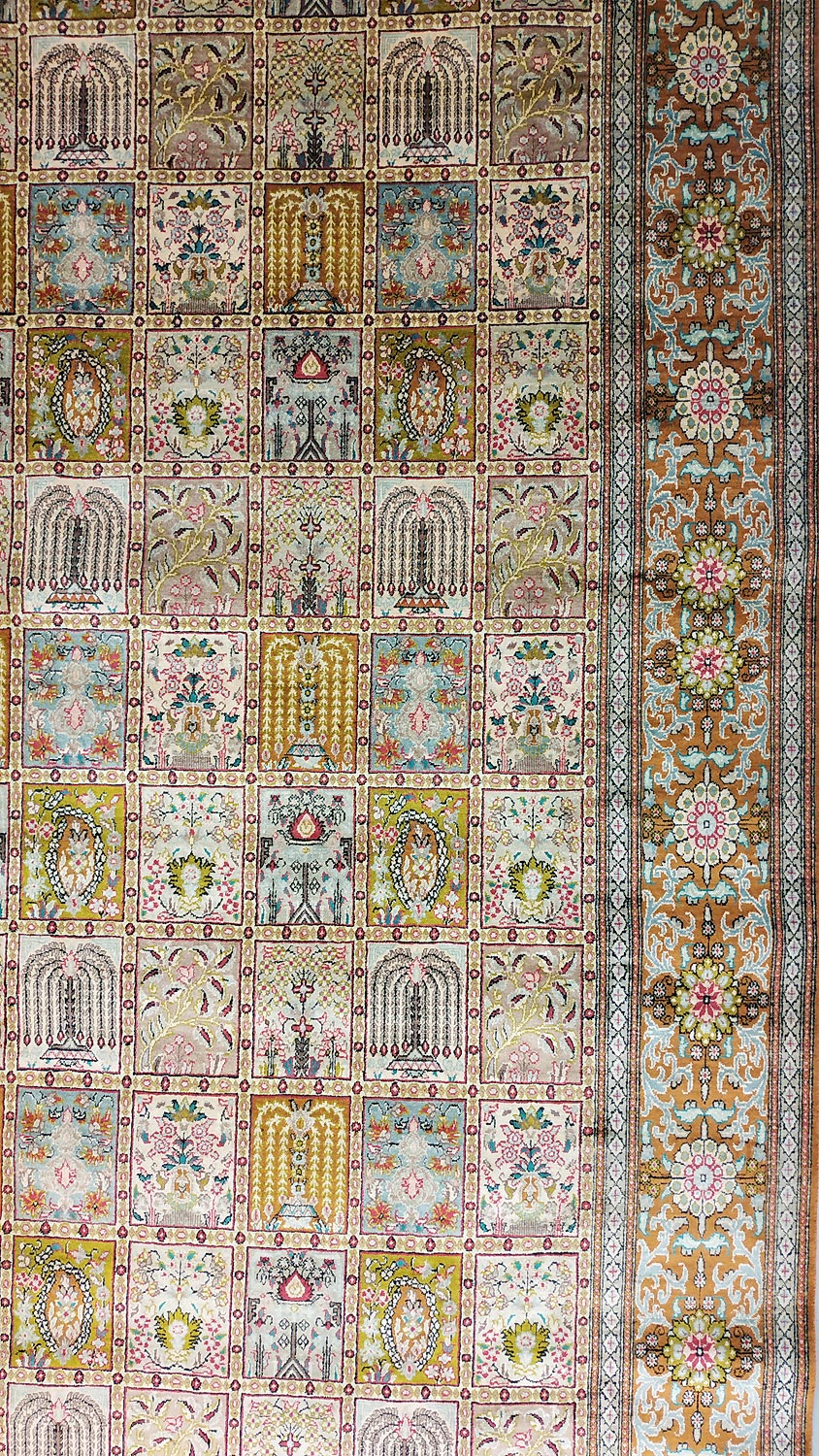 Dimensions : 293 x 198 cm -soie- Pays Iran - Épaisseur : 3 mm - Densité de nouage : 1.000.000 Nœuds au m² - Surface : 5.8 m² - Poids : 11.6 Kgs - Age : contemporain - Confection : Noué main - Forme : Tapis de salon - Type : Tapis persan