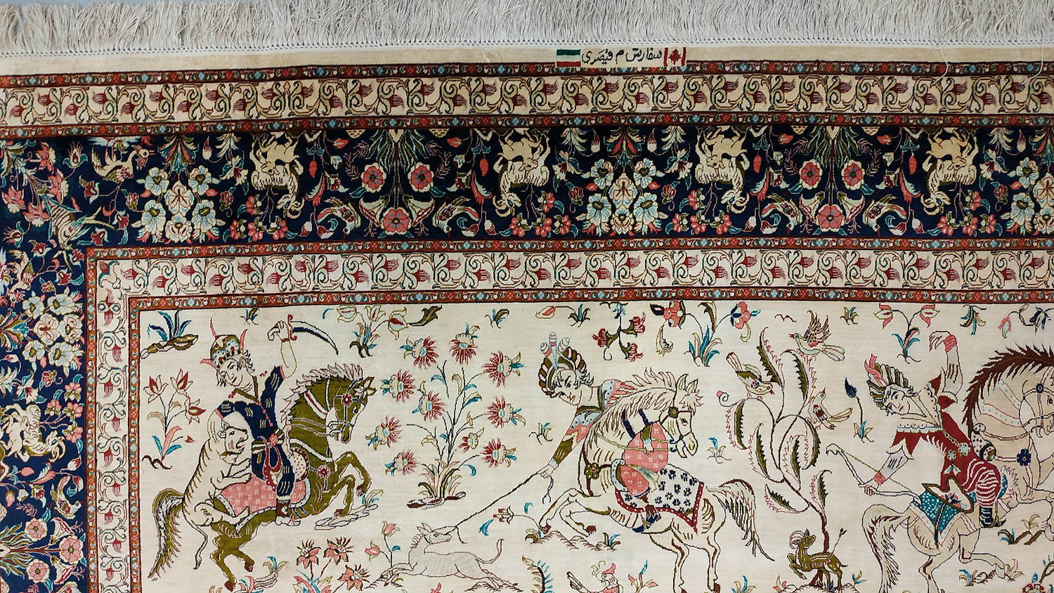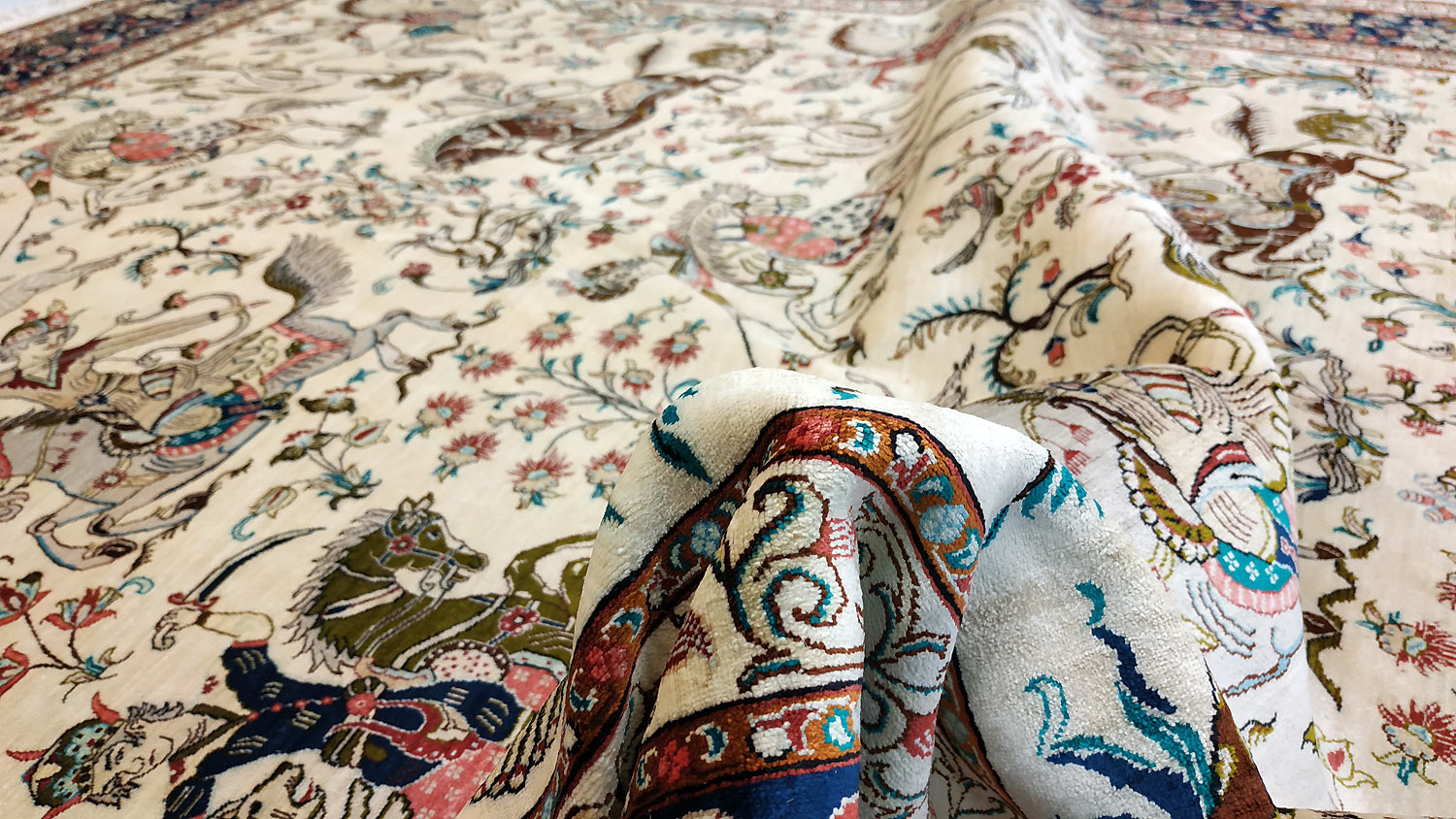 Dimensions : 293 x 194 cm -soie- Pays Iran - Épaisseur : 3 mm - Densité de nouage : 1.000.000 Nœuds au m² - Surface : 5.68 m² - Poids : 11.37 Kgs - Age : contemporain - Confection : Noué main - Forme : Tapis de salon - Type : Tapis persan