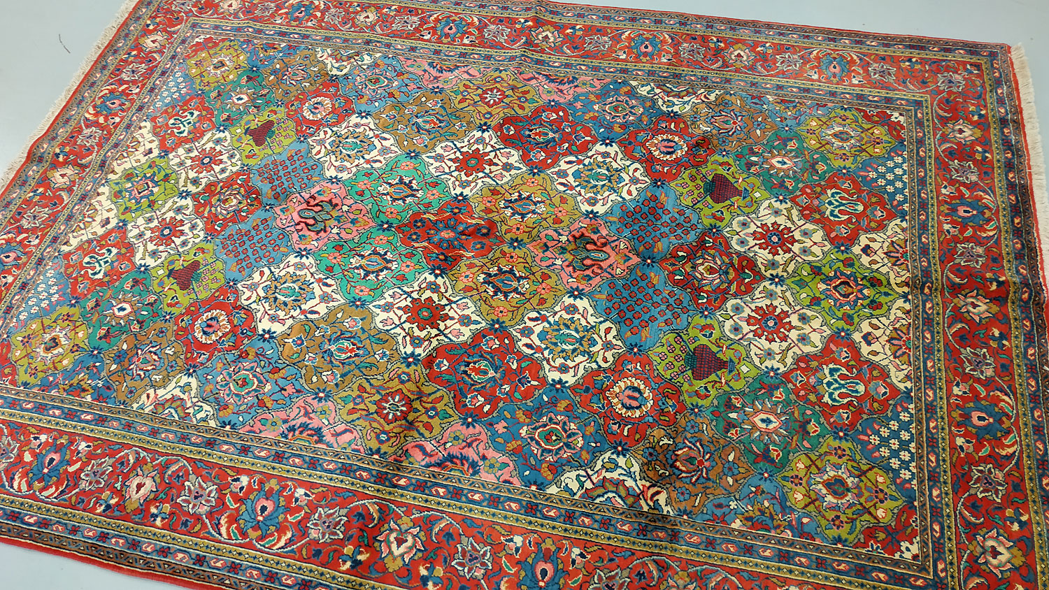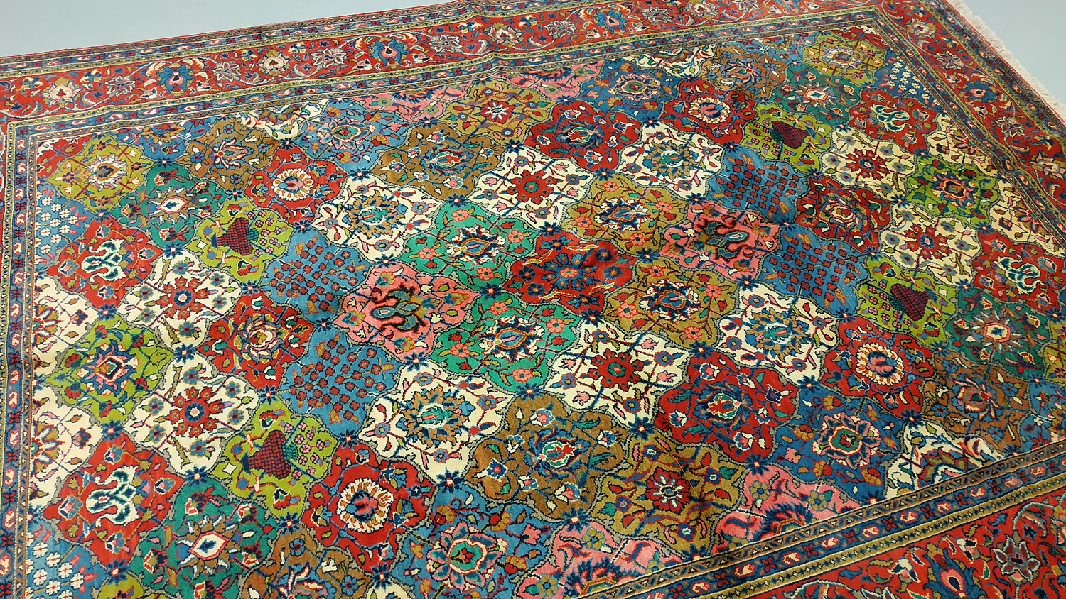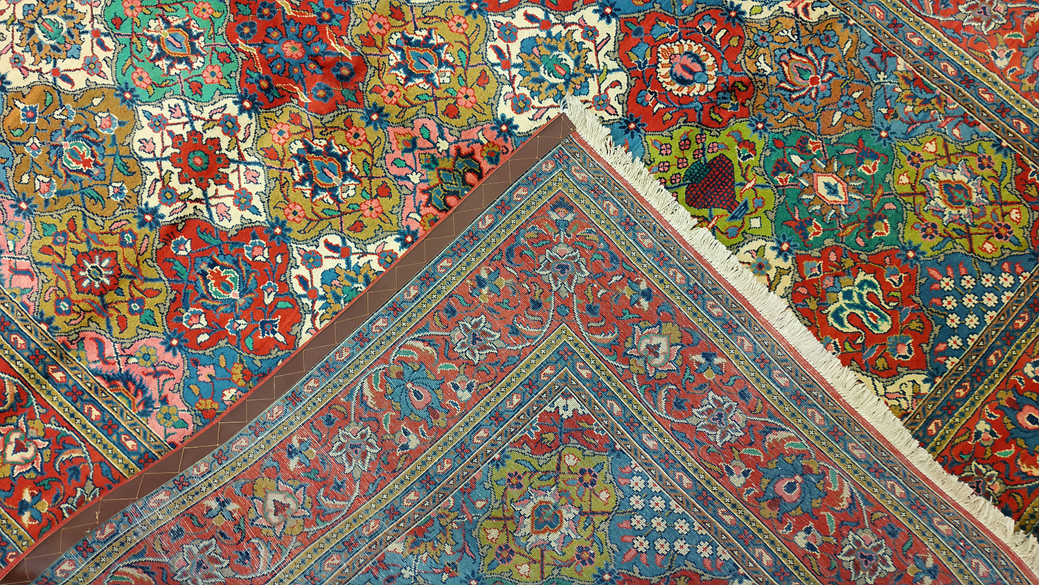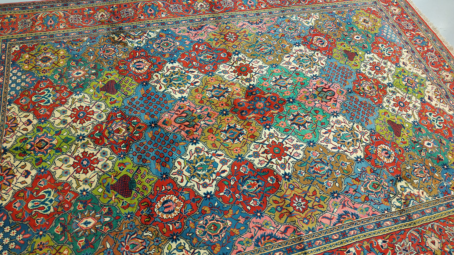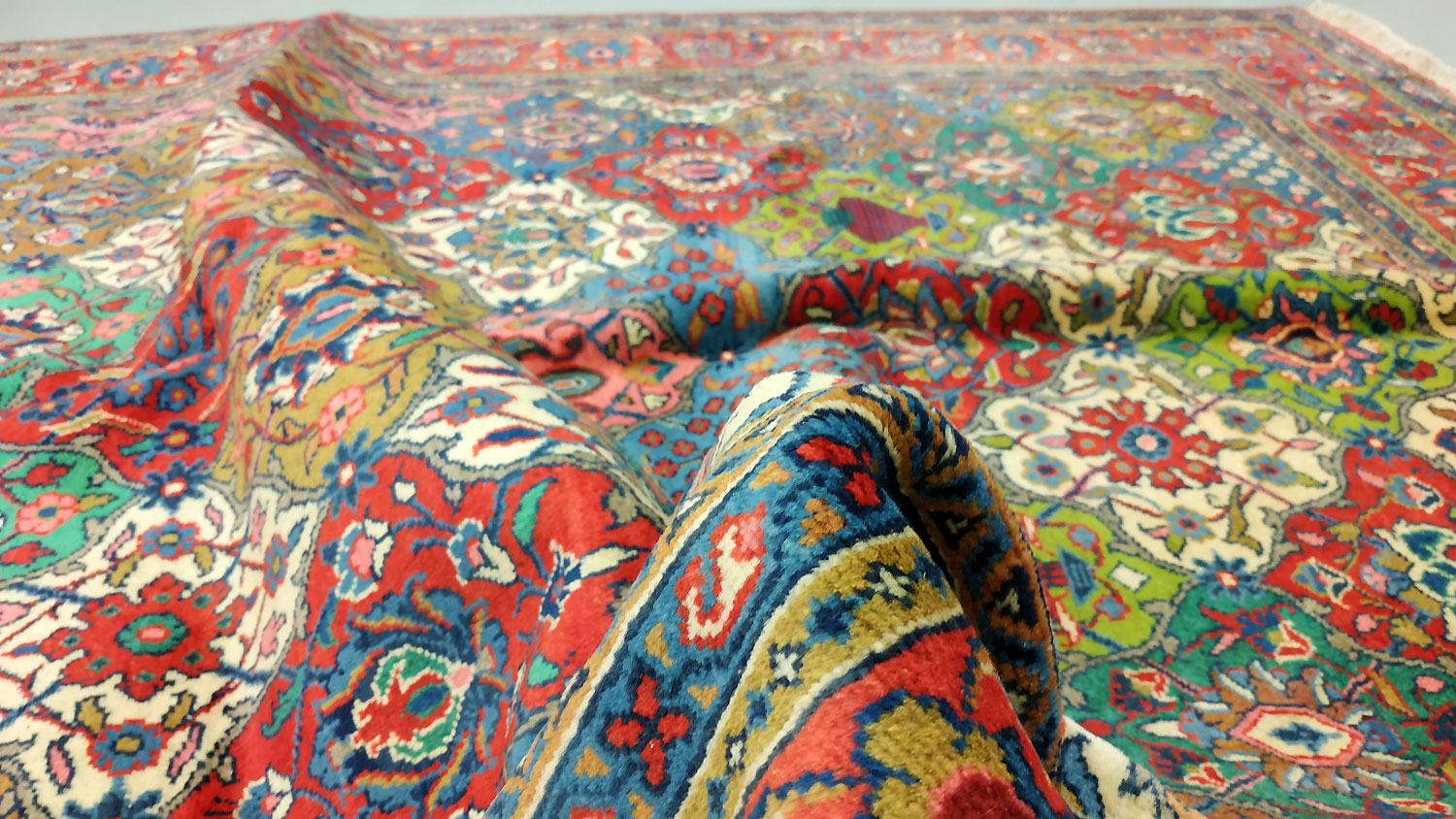 Dimensions : 310 x 203 cm -laine et soie- Pays Iran - Épaisseur : mm - Densité de nouage : Nœuds au m² - Surface : 0 m² - Poids : 0 Kgs - Age : - Confection : - Forme : - Type :