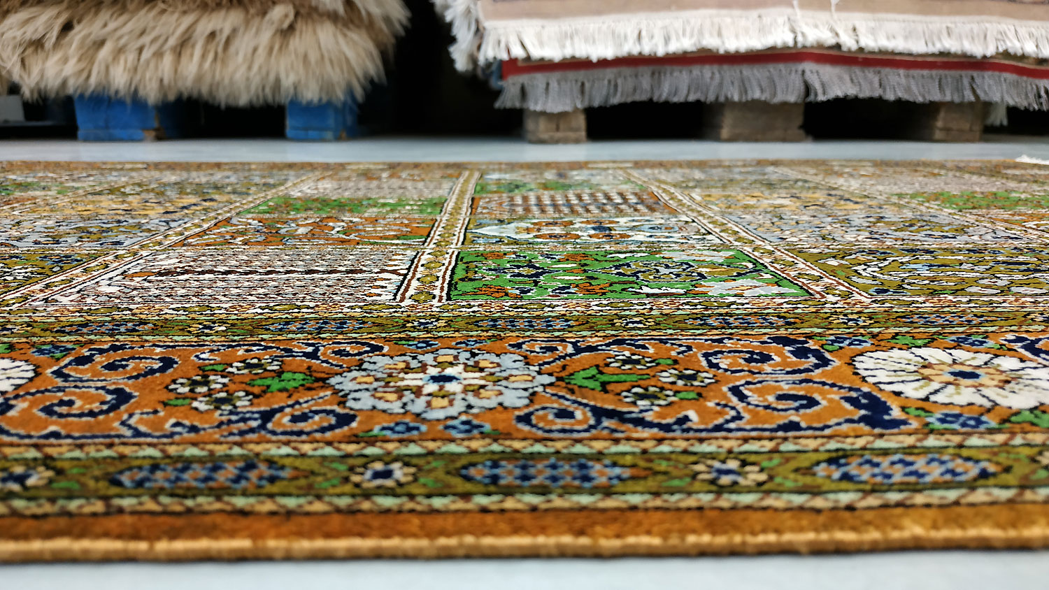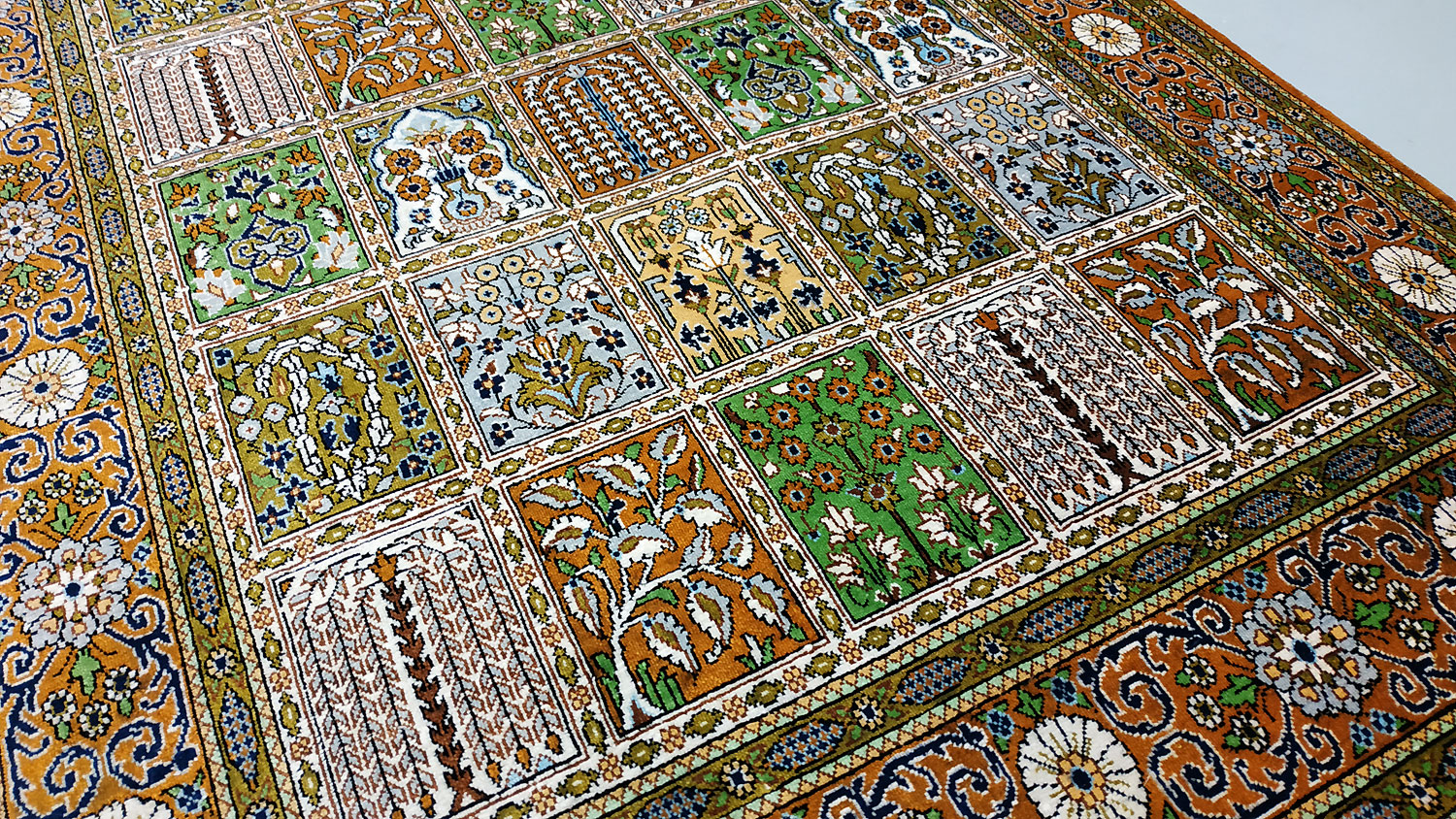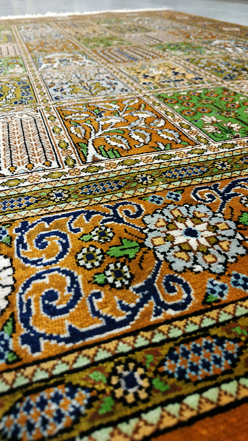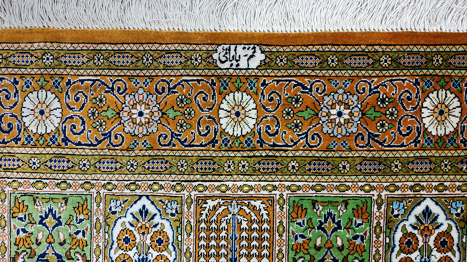 Dimensions : 120 x 78 cm -soie- Pays Iran - Épaisseur : 3 mm - Densité de nouage : 1.000.000 Nœuds au m² - Surface : 0.94 m² - Poids : 1.87 Kgs - Age : contemporain - Confection : Noué main - Forme : Tapis de chambre - Type : Tapis persan