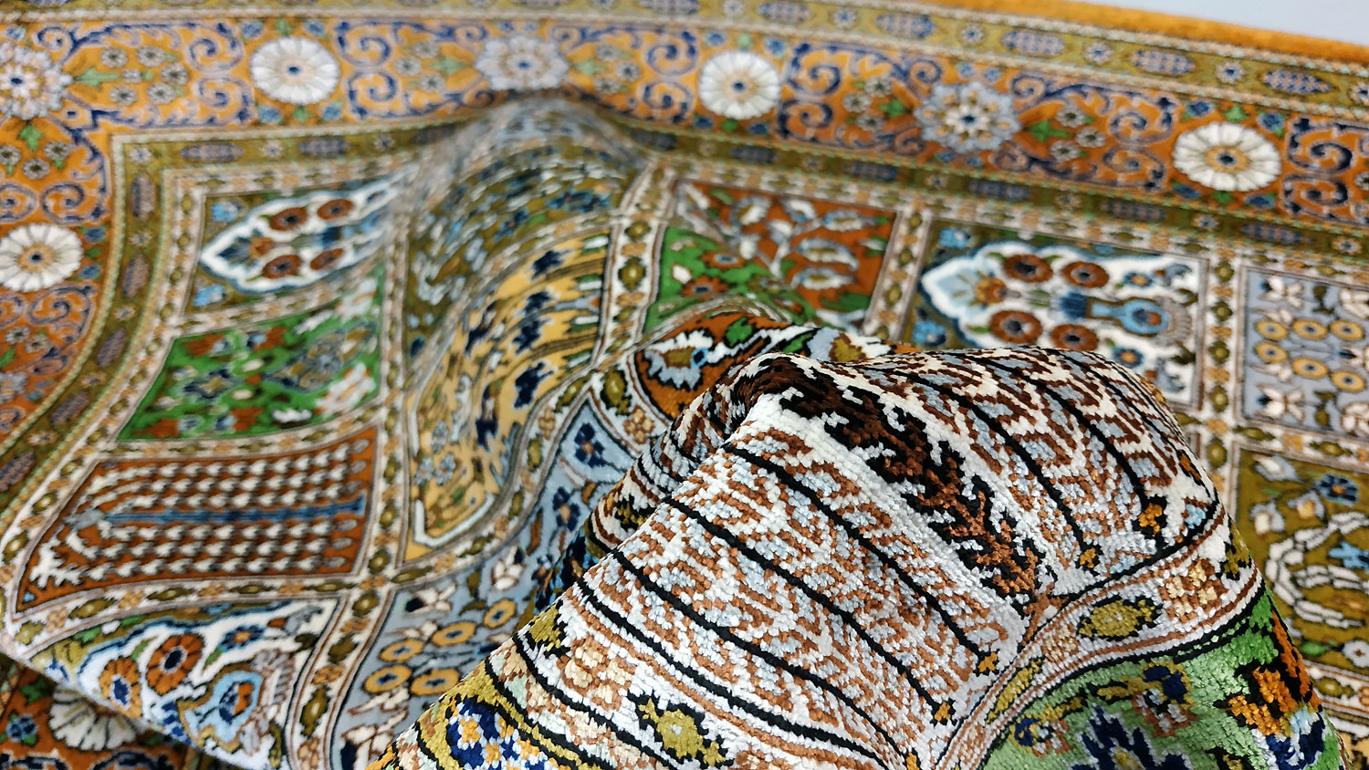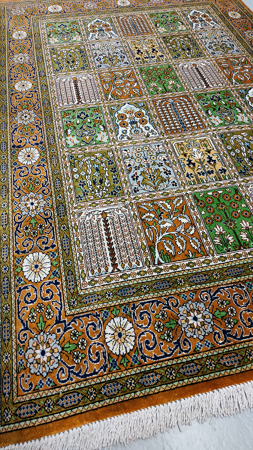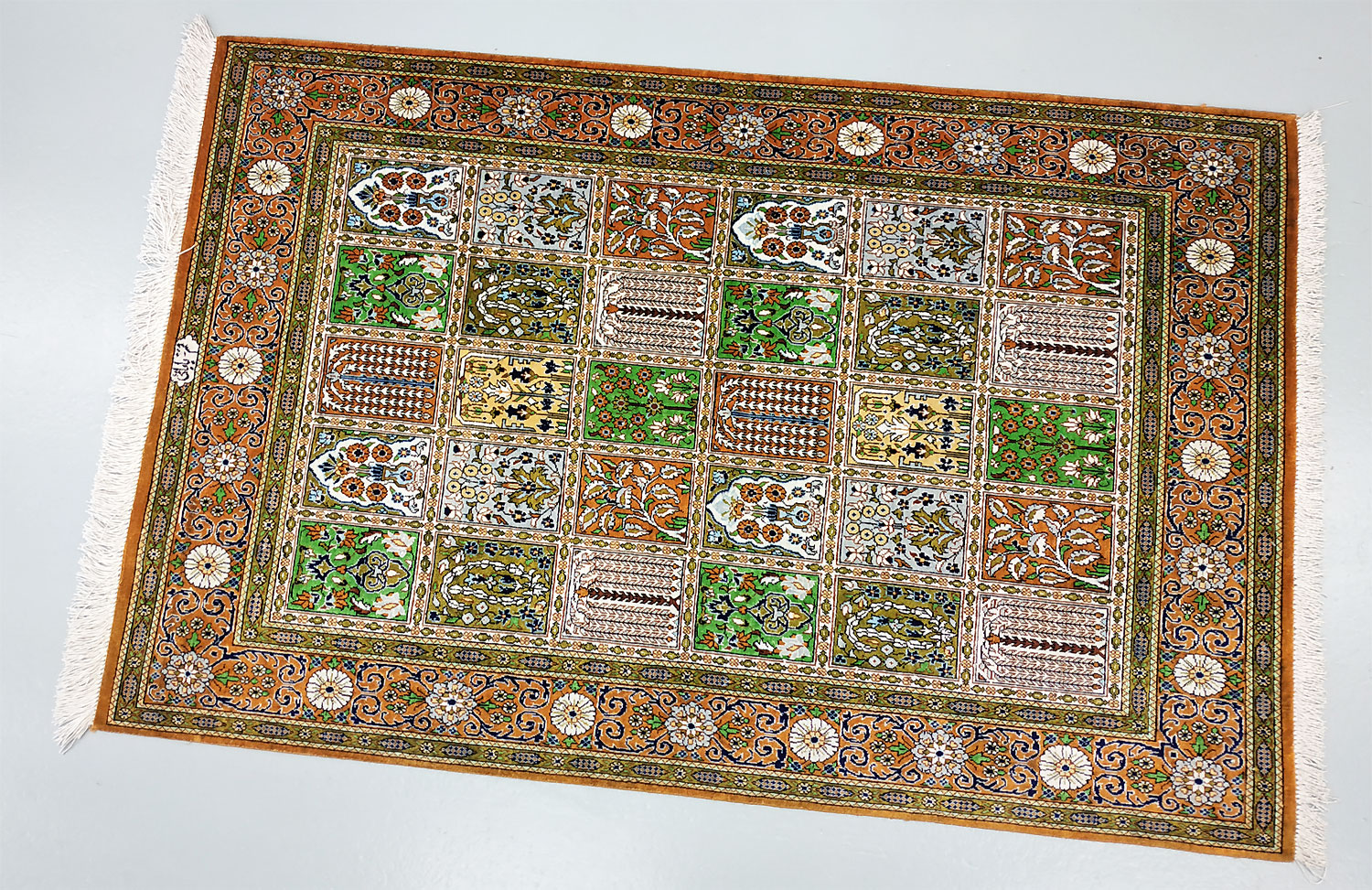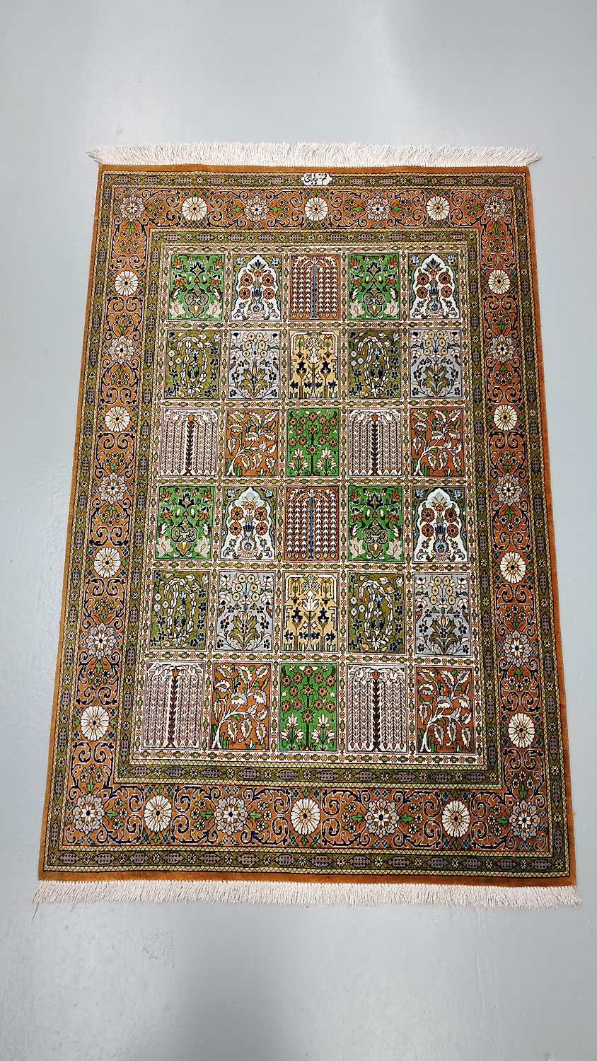 Dimensions : 120 x 78 cm -soie- Pays Iran - Épaisseur : 3 mm - Densité de nouage : 1.000.000 Nœuds au m² - Surface : 0.94 m² - Poids : 1.87 Kgs - Age : contemporain - Confection : Noué main - Forme : Tapis de chambre - Type : Tapis persan