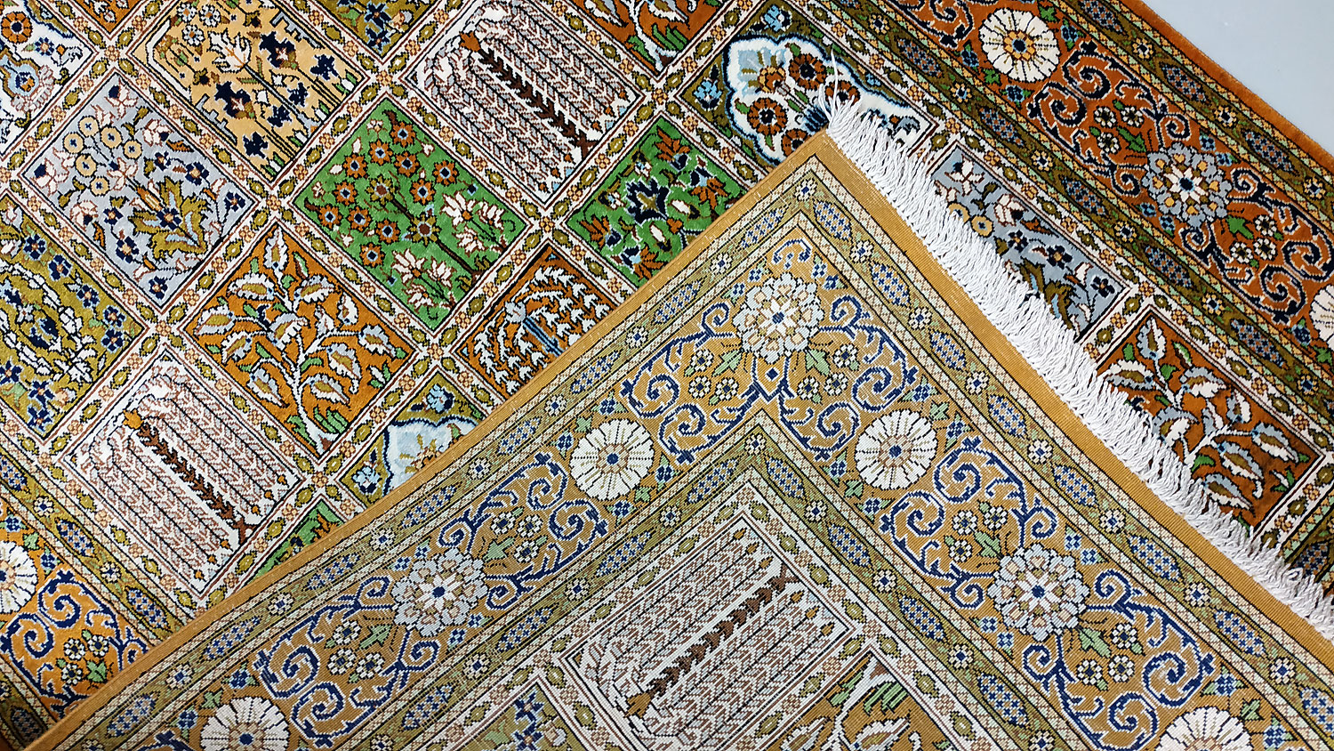 Dimensions : 90 x 60 cm -soie- Pays Iran - Épaisseur : 3 mm - Densité de nouage : 1.000.000 Nœuds au m² - Surface : 0.54 m² - Poids : 1.08 Kgs - Age : contemporain - Confection : Noué main - Forme : Tapis de chambre - Type : Tapis persan