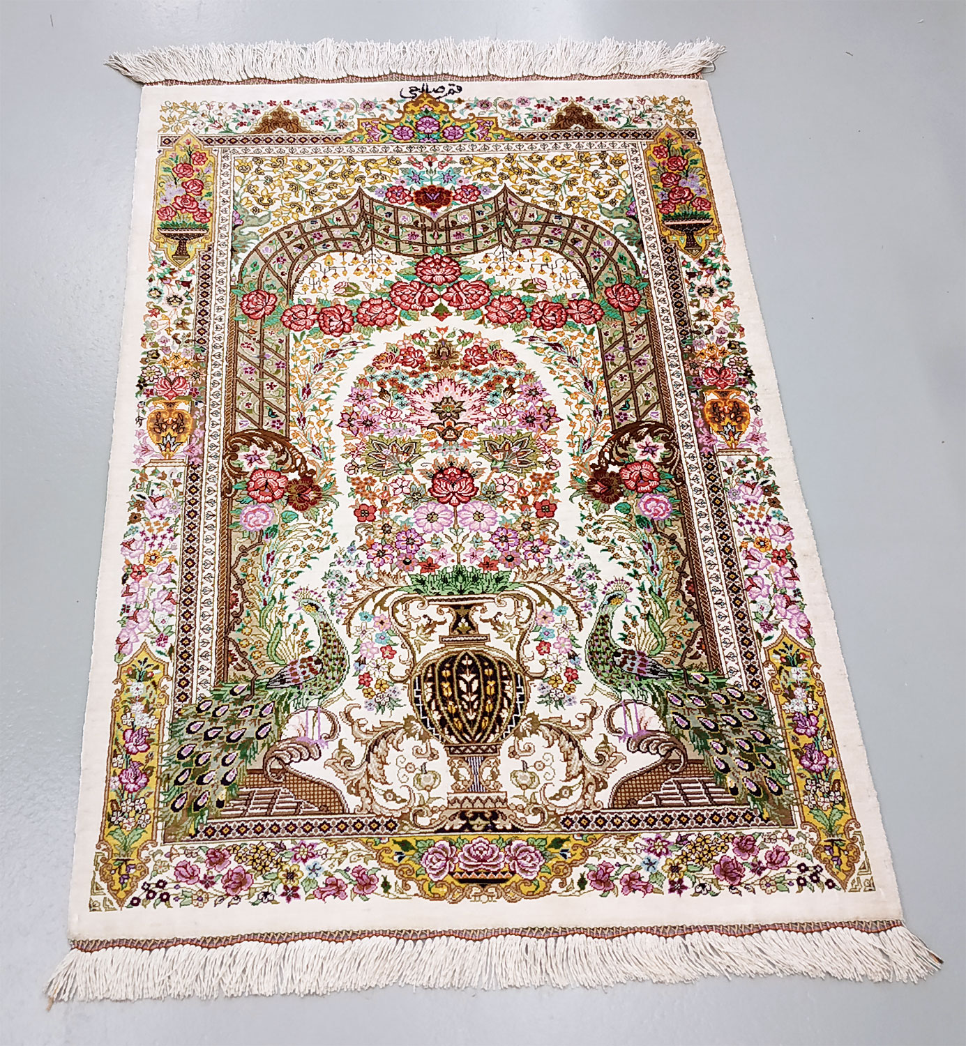 Dimensions : 123 x 82 cm -soie- Pays Iran - Épaisseur : 3 mm - Densité de nouage : 1.000.000 Nœuds au m² - Surface : 1.01 m² - Poids : 2.02 Kgs - Age : contemporain - Confection : Noué main - Forme : Tapis de chambre - Type : Tapis persan