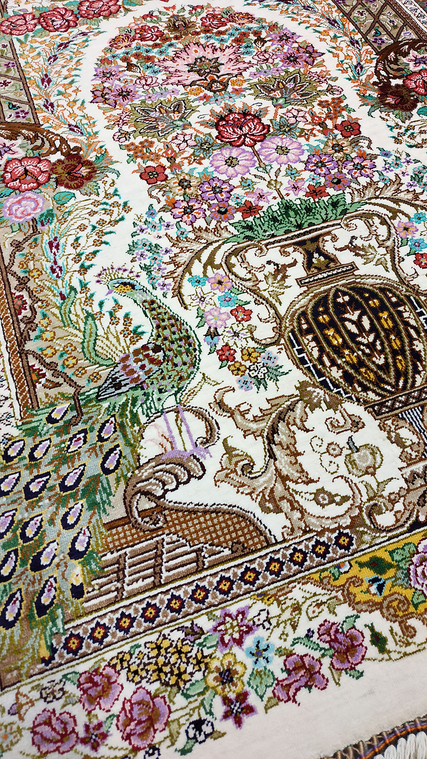 Dimensions : 115 x 76 cm -soie- Pays Iran - Épaisseur : 3 mm - Densité de nouage : 1.000.000 Nœuds au m² - Surface : 0.87 m² - Poids : 1.75 Kgs - Age : contemporain - Confection : Noué main - Forme : Tapis de chambre - Type : Tapis persan