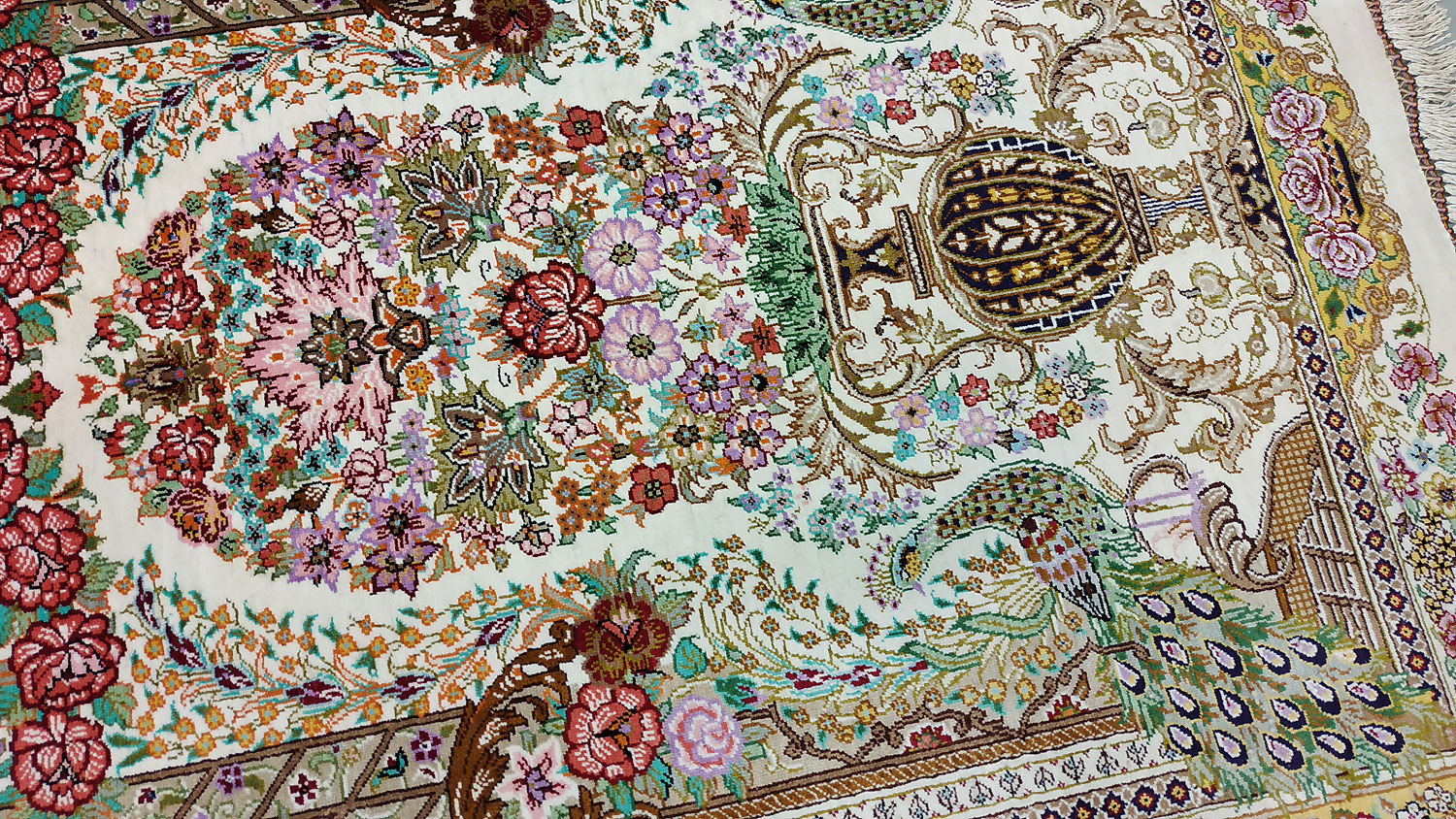 Dimensions : 86 x 60 cm -soie- Pays Iran - Épaisseur : 3 mm - Densité de nouage : 1.000.000 Nœuds au m² - Surface : 0.52 m² - Poids : 1.03 Kgs - Age : contemporain - Confection : Noué main - Forme : Tapis de chambre - Type : Tapis persan