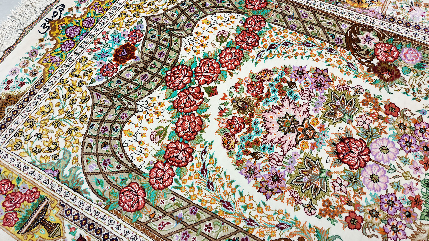 Dimensions : 122 x 78 cm -soie- Pays Iran - Épaisseur : 3 mm - Densité de nouage : 1.000.000 Nœuds au m² - Surface : 0.95 m² - Poids : 1.9 Kgs - Age : contemporain - Confection : Noué main - Forme : Tapis de chambre - Type : Tapis persan