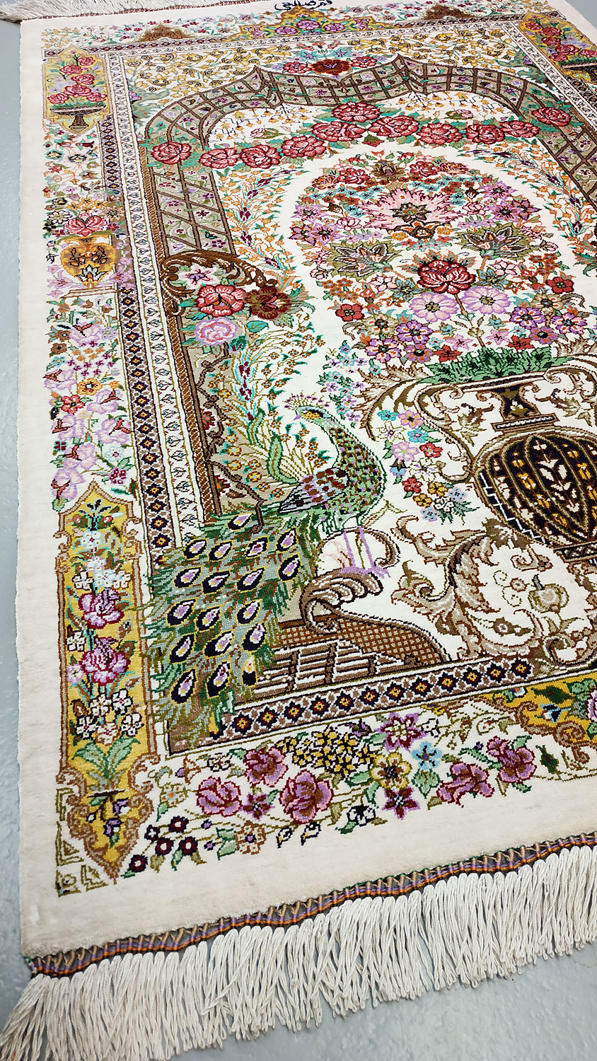Dimensions : 119 x 78 cm -soie- Pays Iran - Épaisseur : 3 mm - Densité de nouage : 1.000.000 Nœuds au m² - Surface : 0.93 m² - Poids : 1.86 Kgs - Age : contemporain - Confection : Noué main - Forme : Tapis de chambre - Type : Tapis persan
