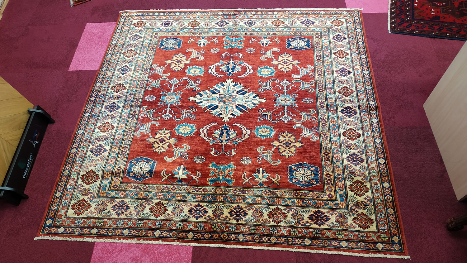 Dimensions : 198 x 190 cm -laine- Pays Afghanistan - Épaisseur : 8 mm - Densité de nouage : 300.000 Nœuds au m² - Surface : 3.76 m² - Poids : 11.29 Kgs - Age : contemporain - Confection : Noué main - Forme : Tapis carré - Type : Tapis Oriental
