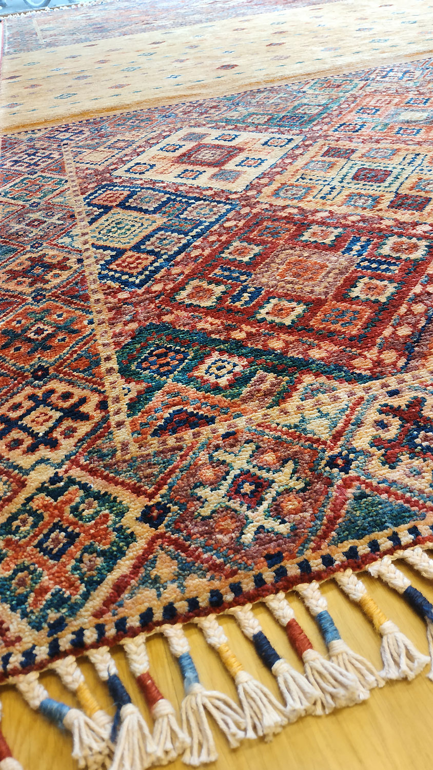 Dimensions : 243 x 177 cm -laine- Pays Afghanistan - Épaisseur : 8 mm - Densité de nouage : 300.000 Nœuds au m² - Surface : 4.3 m² - Poids : 12.9 Kgs - Age : contemporain - Confection : Noué main - Forme : Tapis de chambre - Type : Tapis de decoration