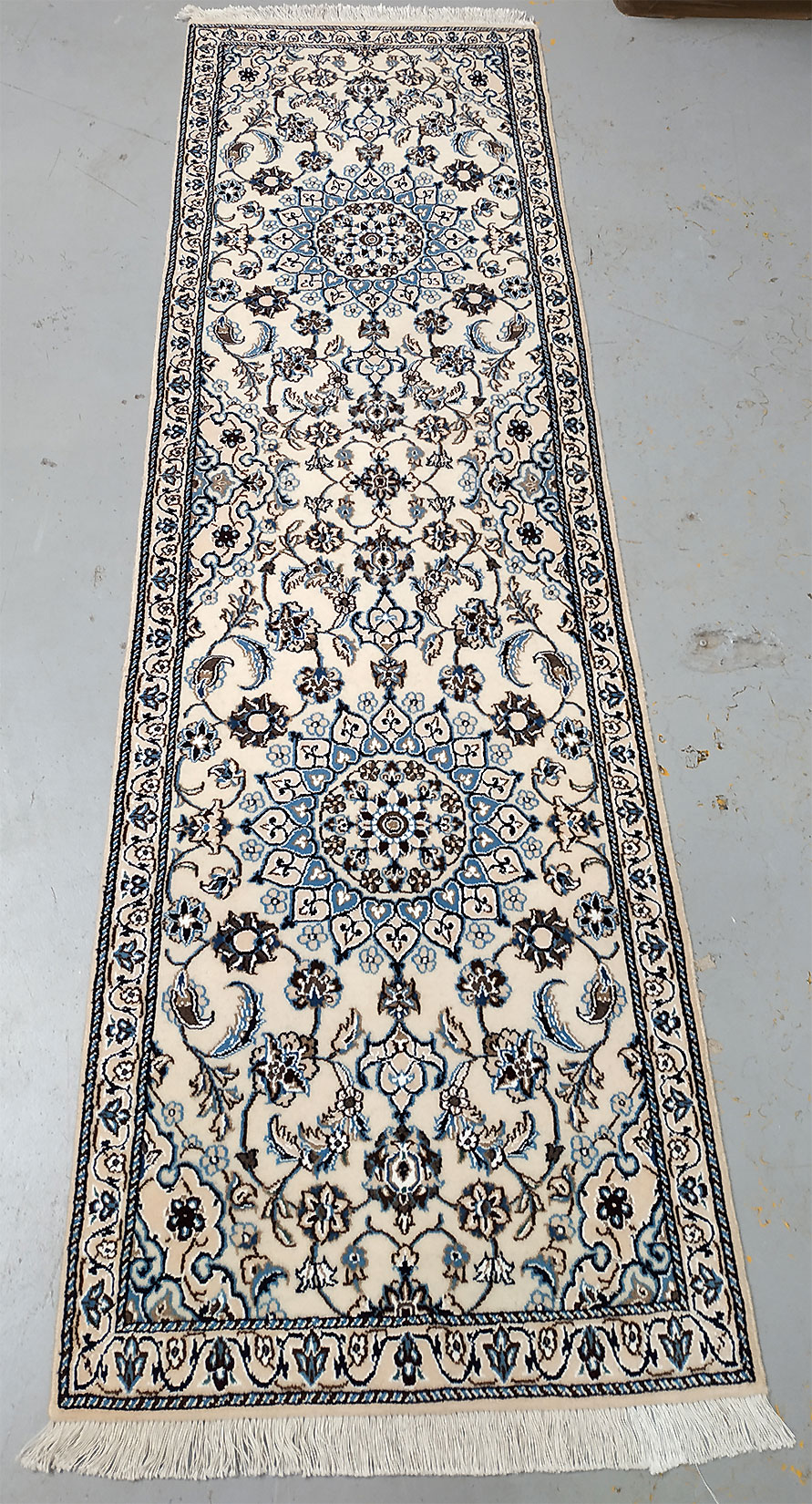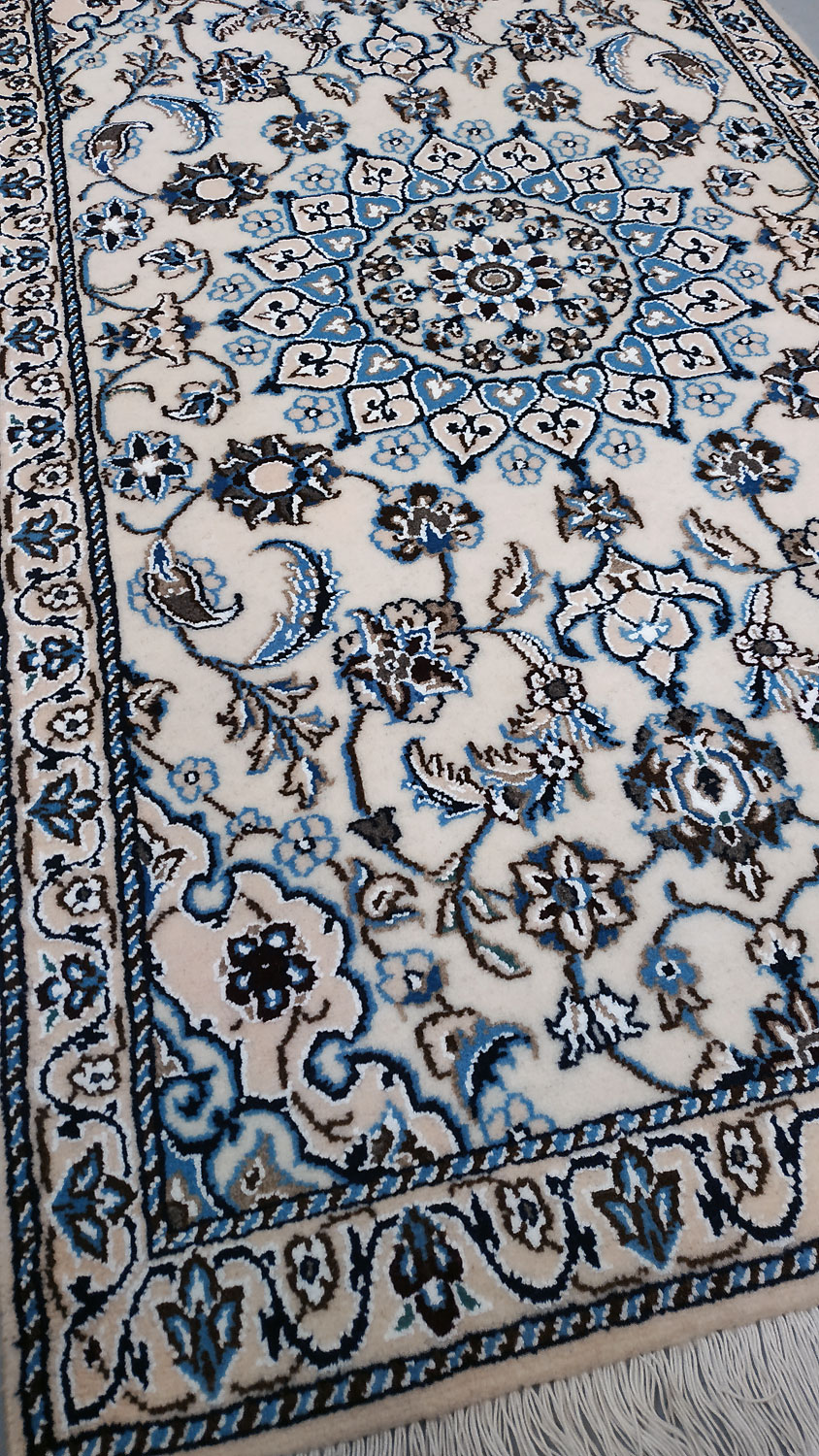 Dimensions : 170 x 75 cm -laine et soie- Pays Iran - Épaisseur : 9 mm - Densité de nouage : 360.000 Nœuds au m² - Surface : 1.28 m² - Poids : 3.19 Kgs - Age : contemporain - Confection : Noué main - Forme : Tapis de couloirs - Type : Tapis persan
