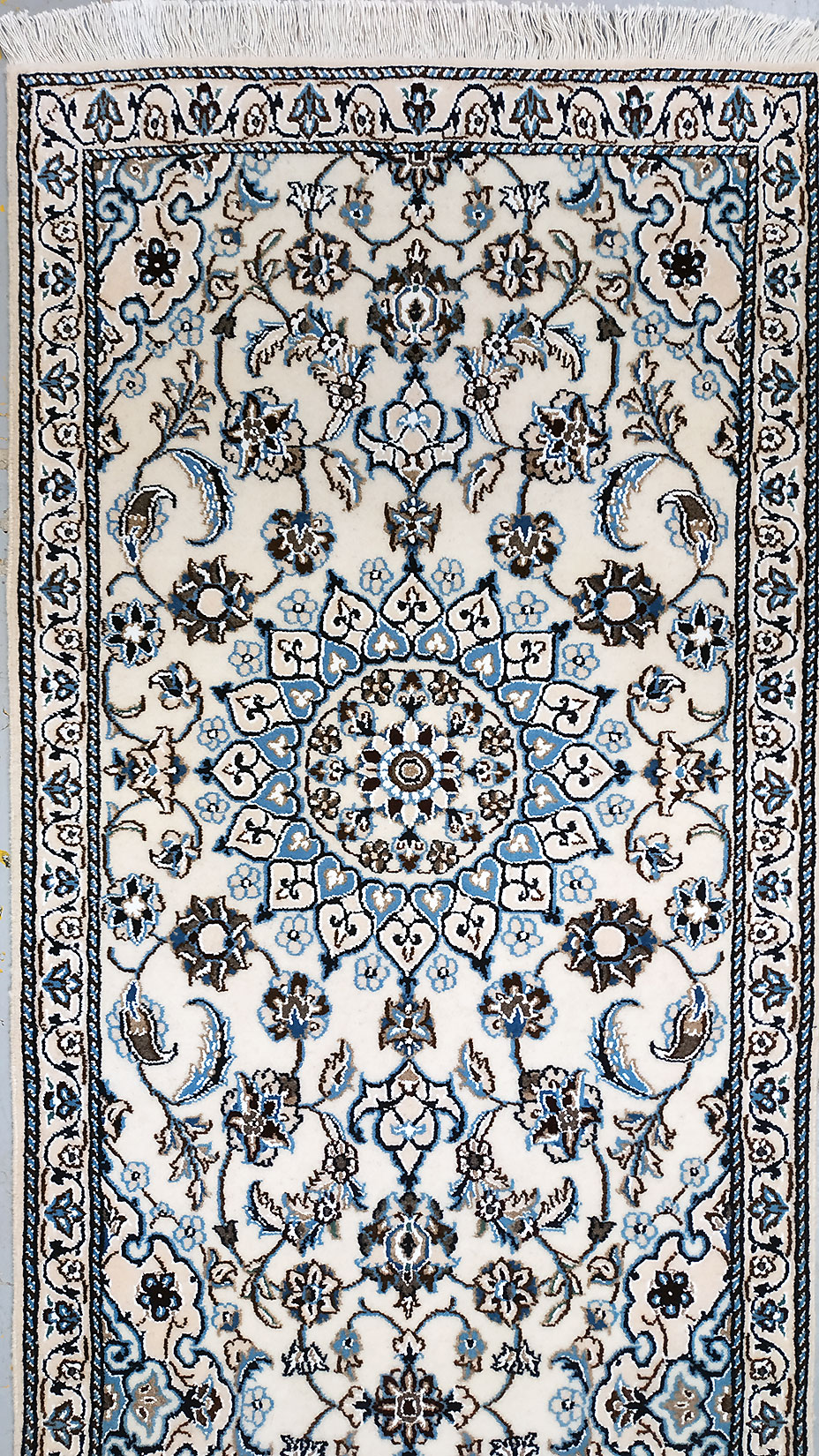 Dimensions : 199 x 59 cm -laine et soie- Pays Iran - Épaisseur : 9 mm - Densité de nouage : 360.000 Nœuds au m² - Surface : 1.17 m² - Poids : 2.94 Kgs - Age : contemporain - Confection : Noué main - Forme : Tapis de couloirs - Type : Tapis persan