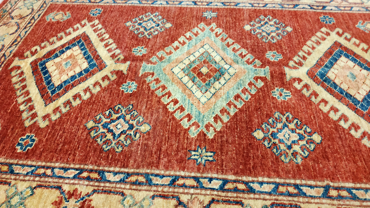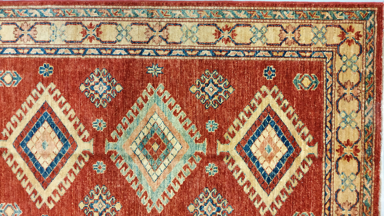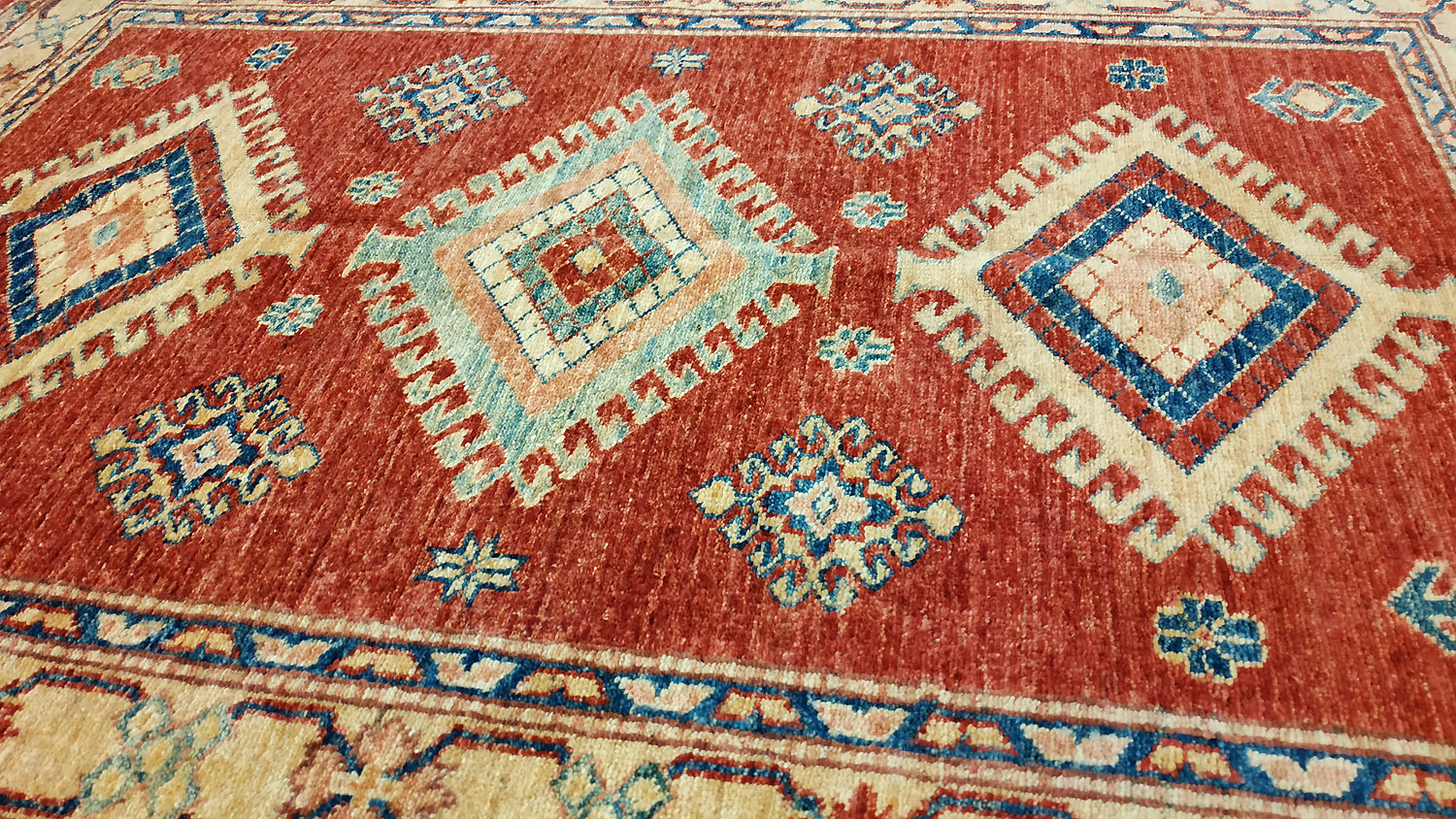 Dimensions : 144 x 88 cm -laine- Pays Afghanistan - Épaisseur : 8 mm - Densité de nouage : 300.000 Nœuds au m² - Surface : 1.27 m² - Poids : 3.8 Kgs - Age : contemporain - Confection : Noué main - Forme : Tapis de chambre - Type : Tapis Oriental
