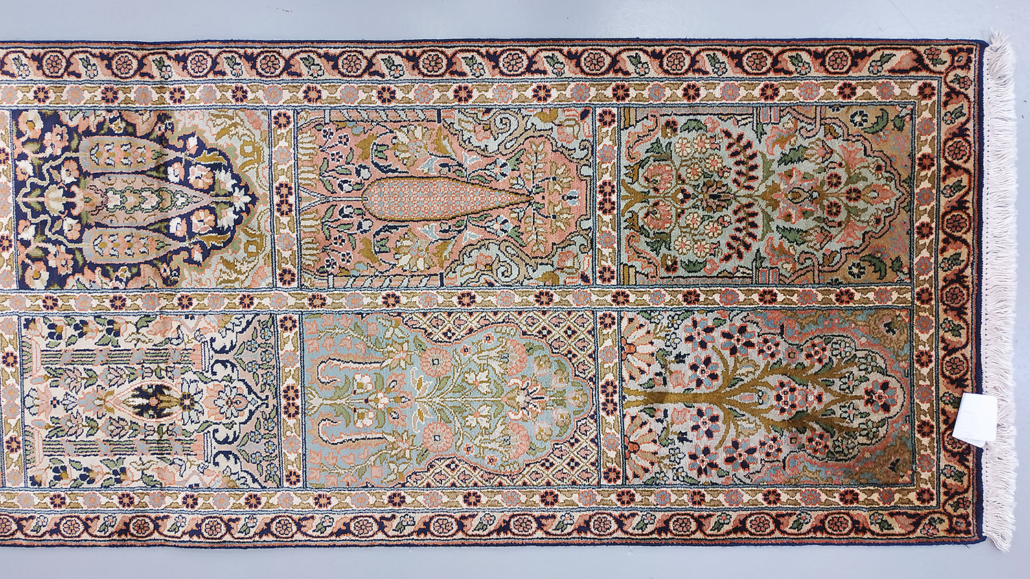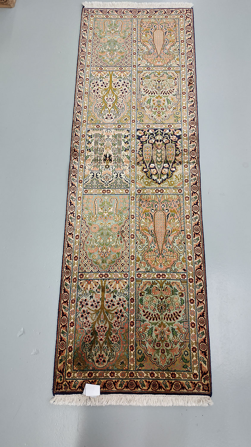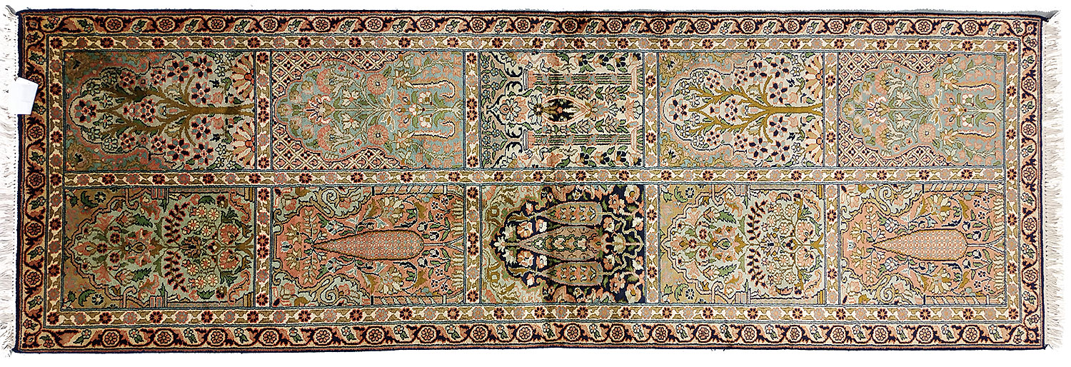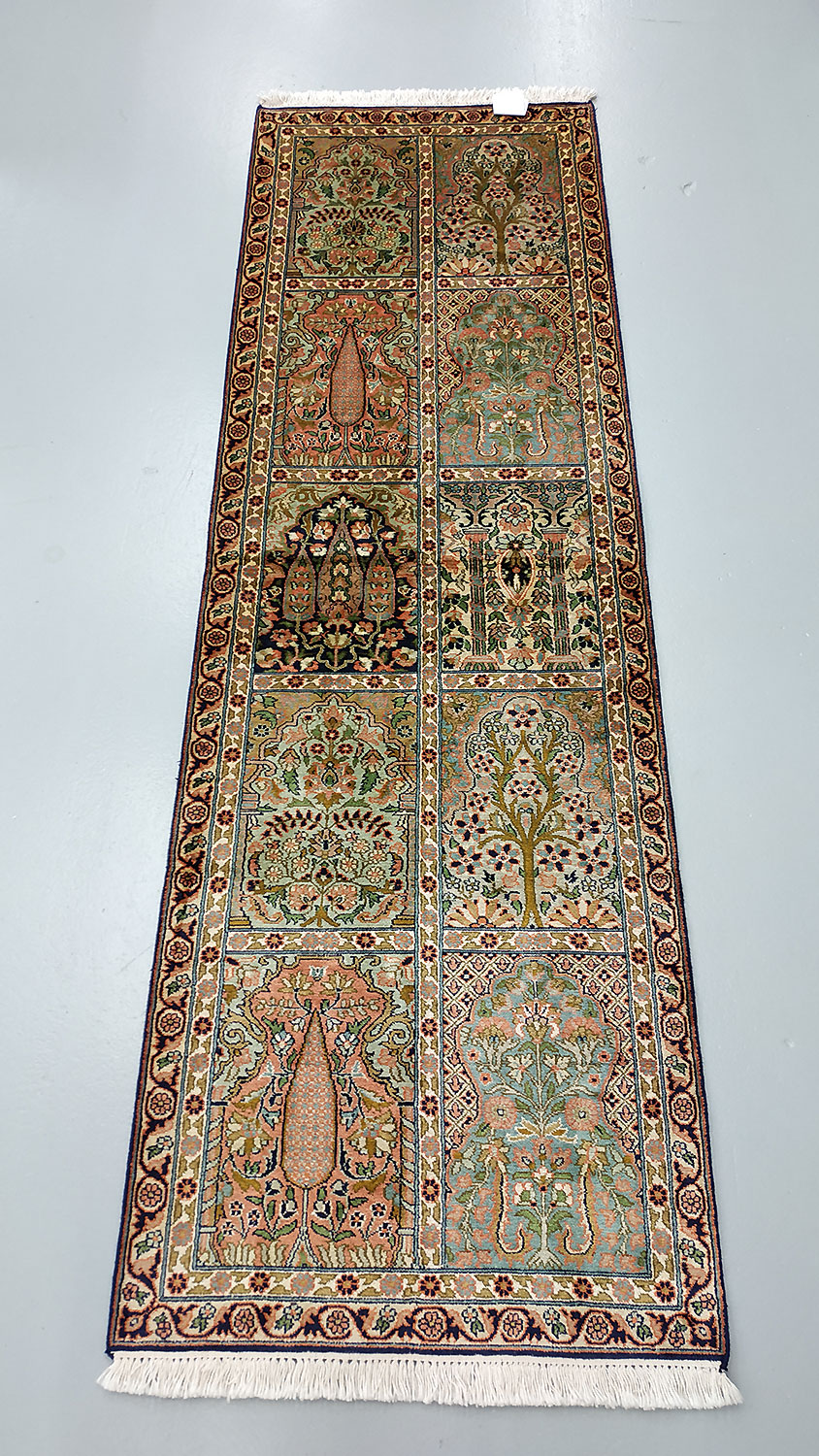 Dimensions : 179 x 64 cm -soie- Pays Inde - Épaisseur : 6 mm - Densité de nouage : 500.000 Nœuds au m² - Surface : 1.15 m² - Poids : 2.29 Kgs - Age : contemporain - Confection : Noué main - Forme : Tapis de couloirs - Type : Tapis Oriental