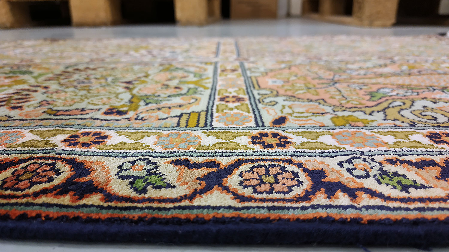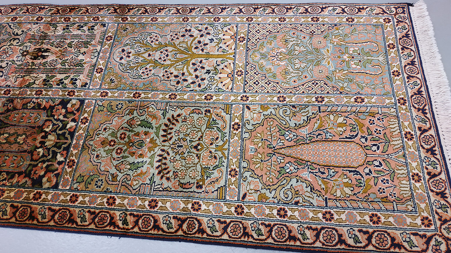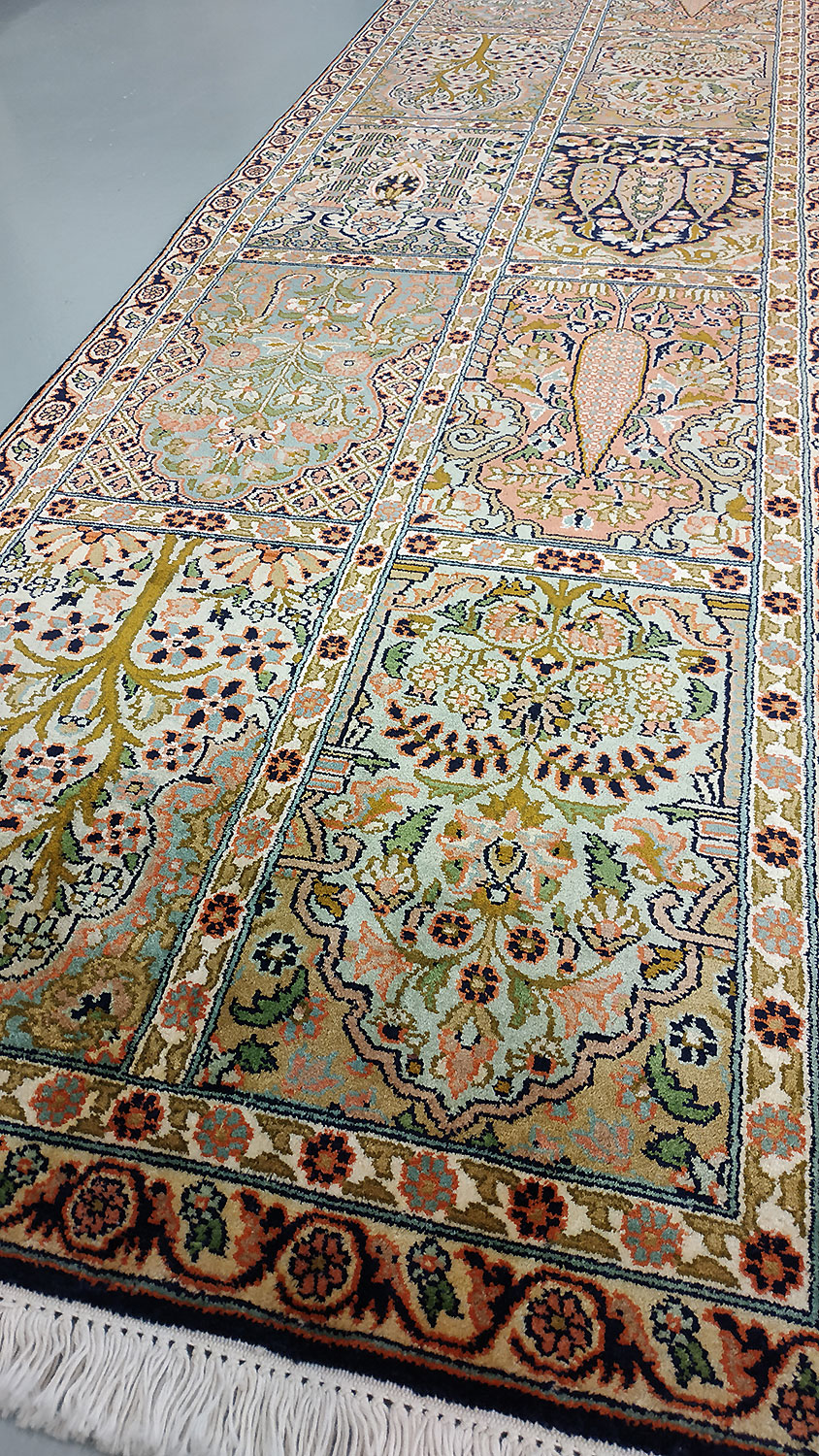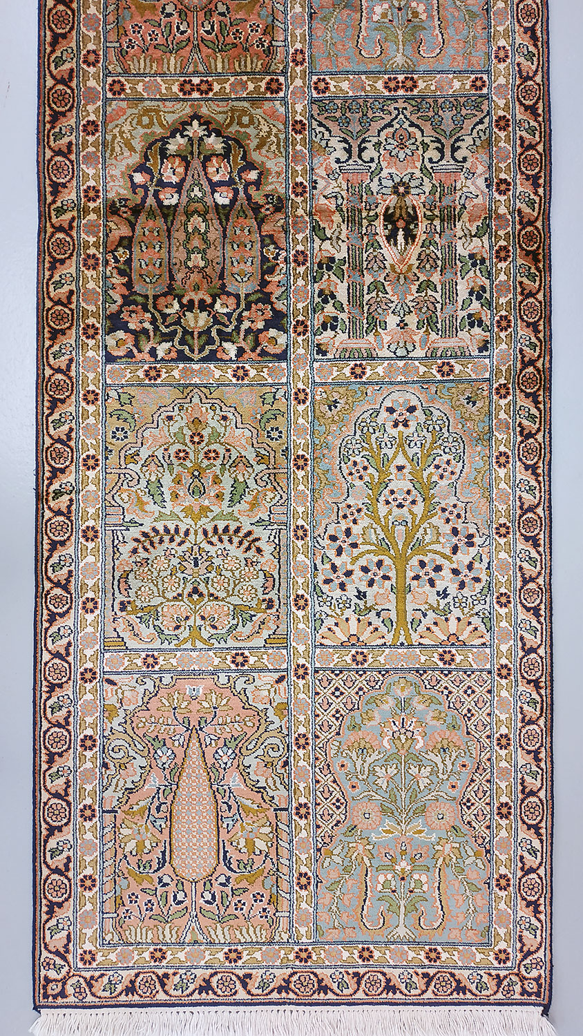 Dimensions : 179 x 64 cm -soie- Pays Inde - Épaisseur : 6 mm - Densité de nouage : 500.000 Nœuds au m² - Surface : 1.15 m² - Poids : 2.29 Kgs - Age : contemporain - Confection : Noué main - Forme : Tapis de couloirs - Type : Tapis Oriental