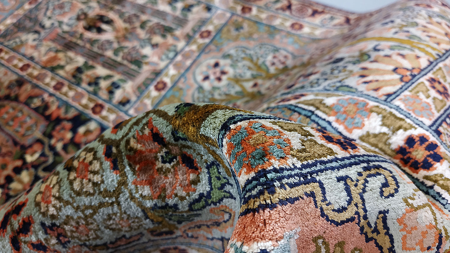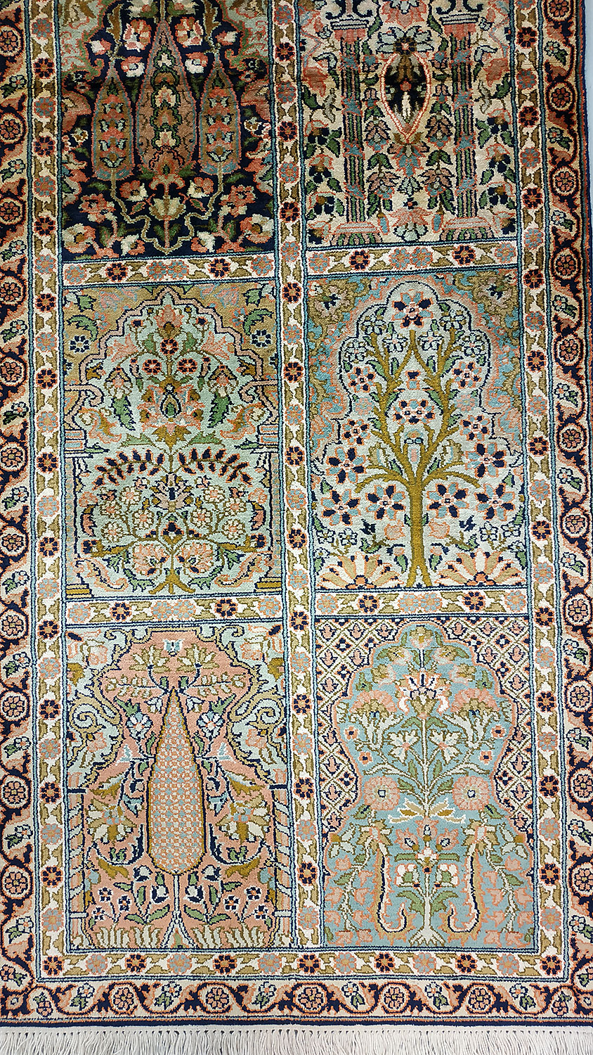 Dimensions : 170 x 65 cm -soie- Pays Inde - Épaisseur : 6 mm - Densité de nouage : 500.000 Nœuds au m² - Surface : 1.11 m² - Poids : 2.21 Kgs - Age : contemporain - Confection : Noué main - Forme : Tapis de couloirs - Type : Tapis Oriental