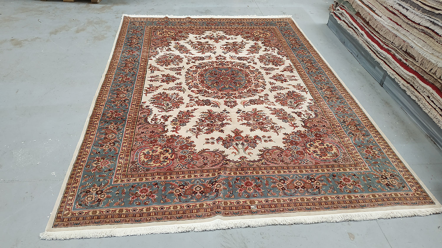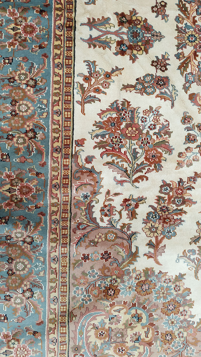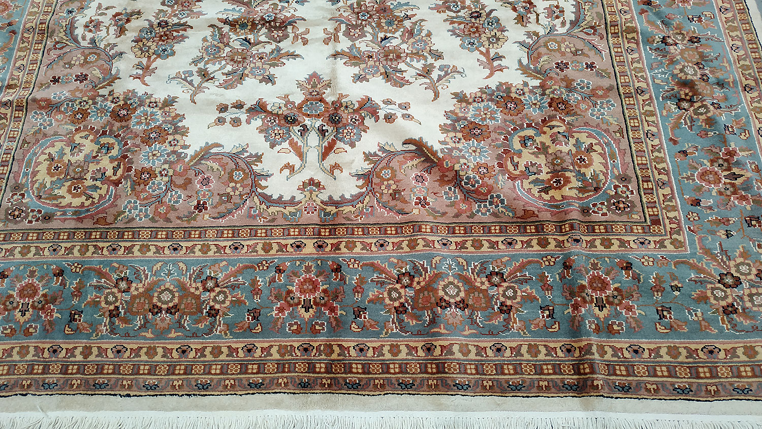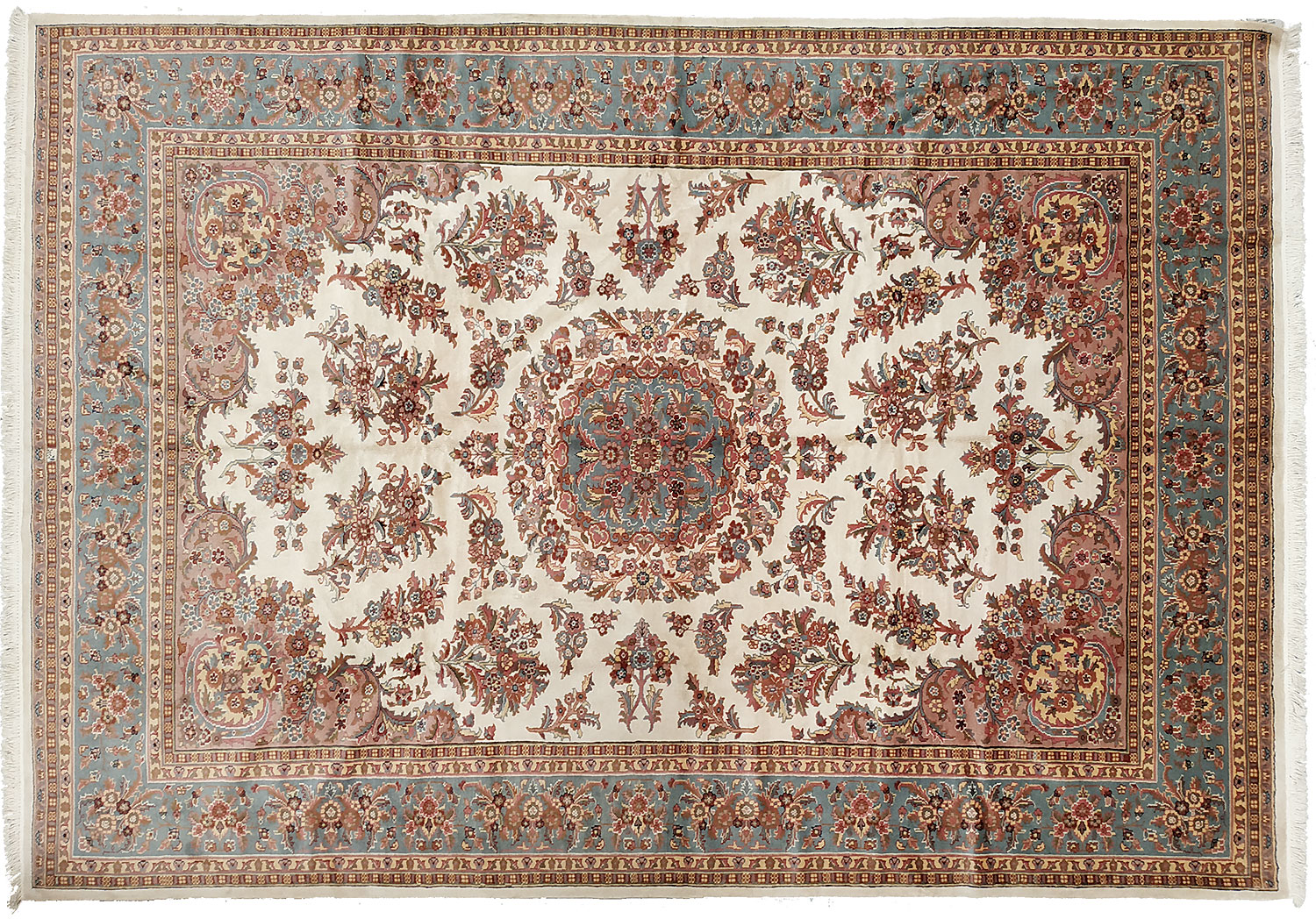 Dimensions : 309 x 214 cm -laine et soie- Pays Pakistan - Épaisseur : 7 mm - Densité de nouage : 200.000 Nœuds au m² - Surface : 6.61 m² - Poids : 16.53 Kgs - Age : contemporain - Confection : Noué main - Forme : Tapis de salon - Type : Tapis Oriental