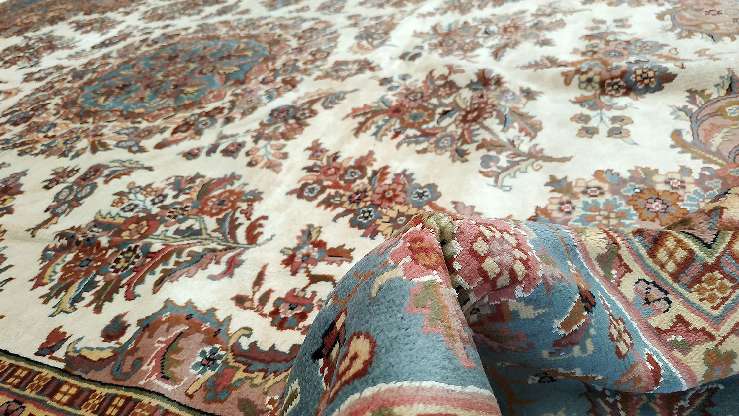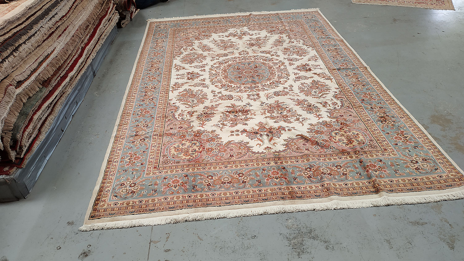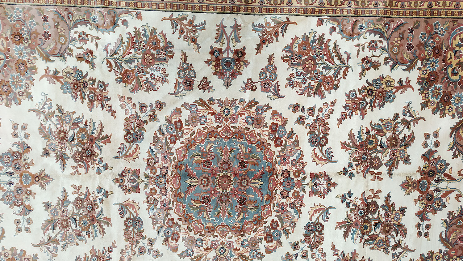 Dimensions : 309 x 214 cm -laine et soie- Pays Pakistan - Épaisseur : 7 mm - Densité de nouage : 200.000 Nœuds au m² - Surface : 6.61 m² - Poids : 16.53 Kgs - Age : contemporain - Confection : Noué main - Forme : Tapis de salon - Type : Tapis Oriental