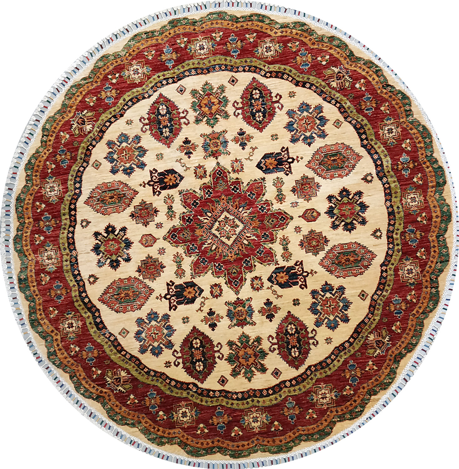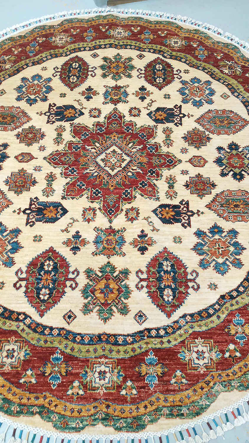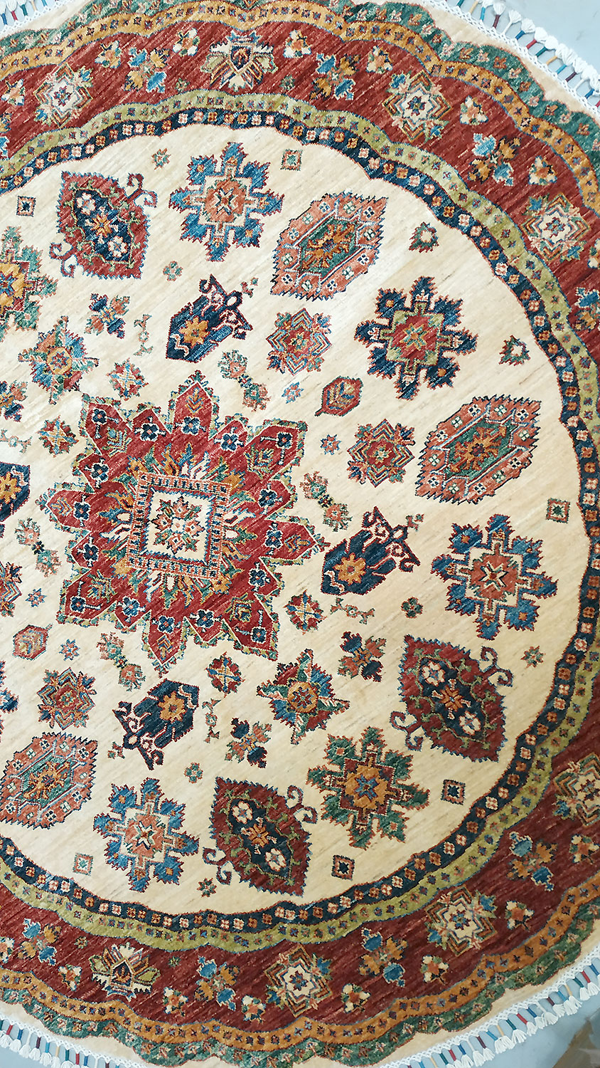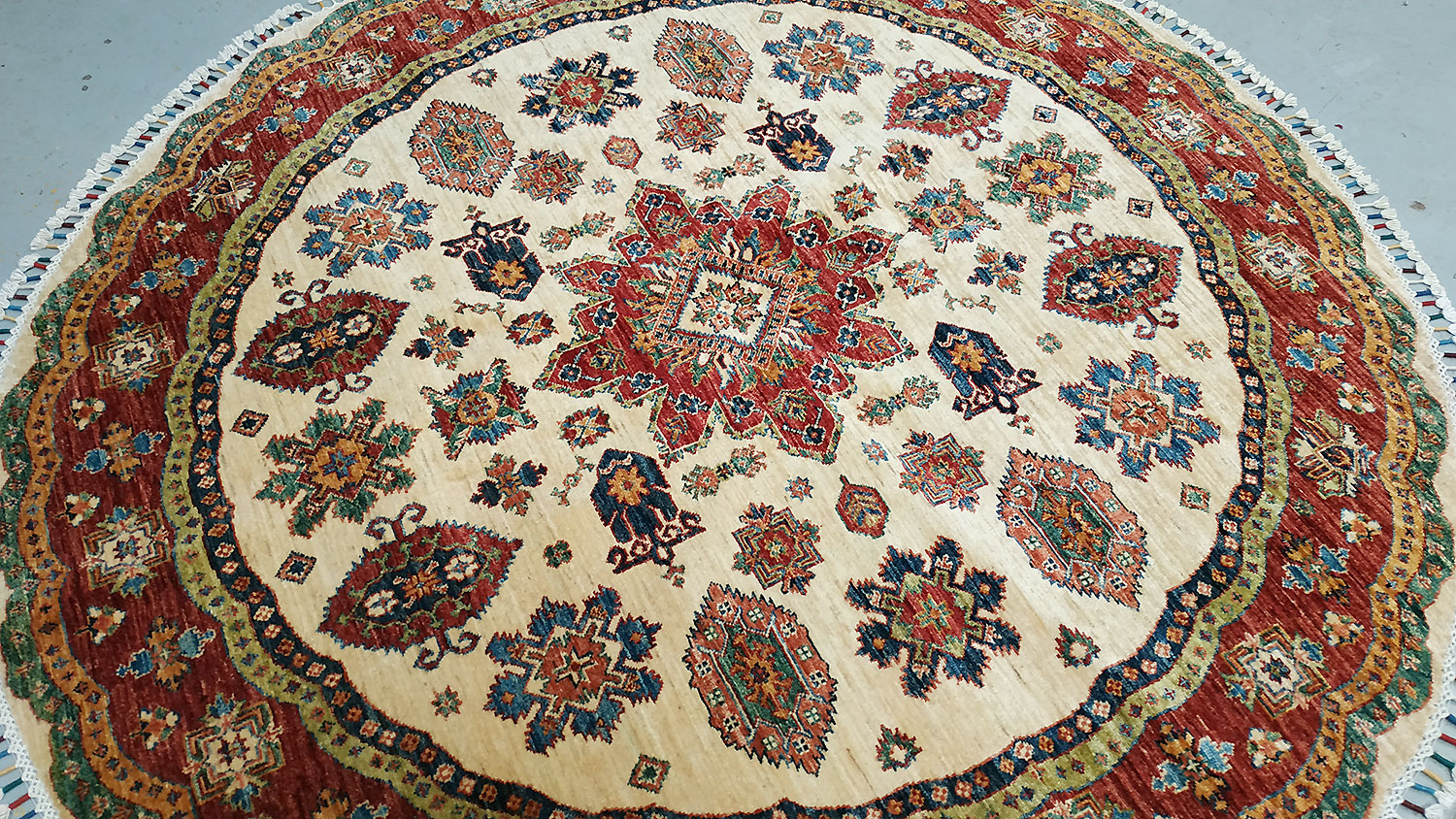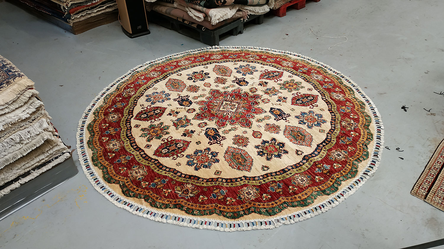 Dimensions : 195 x 195 cm -laine- Pays Afghanistan - Épaisseur : 8 mm - Densité de nouage : 300.000 Nœuds au m² - Surface : 3.8 m² - Poids : 11.41 Kgs - Age : contemporain - Confection : Noué main - Forme : Tapis rond - Type : Tapis Oriental