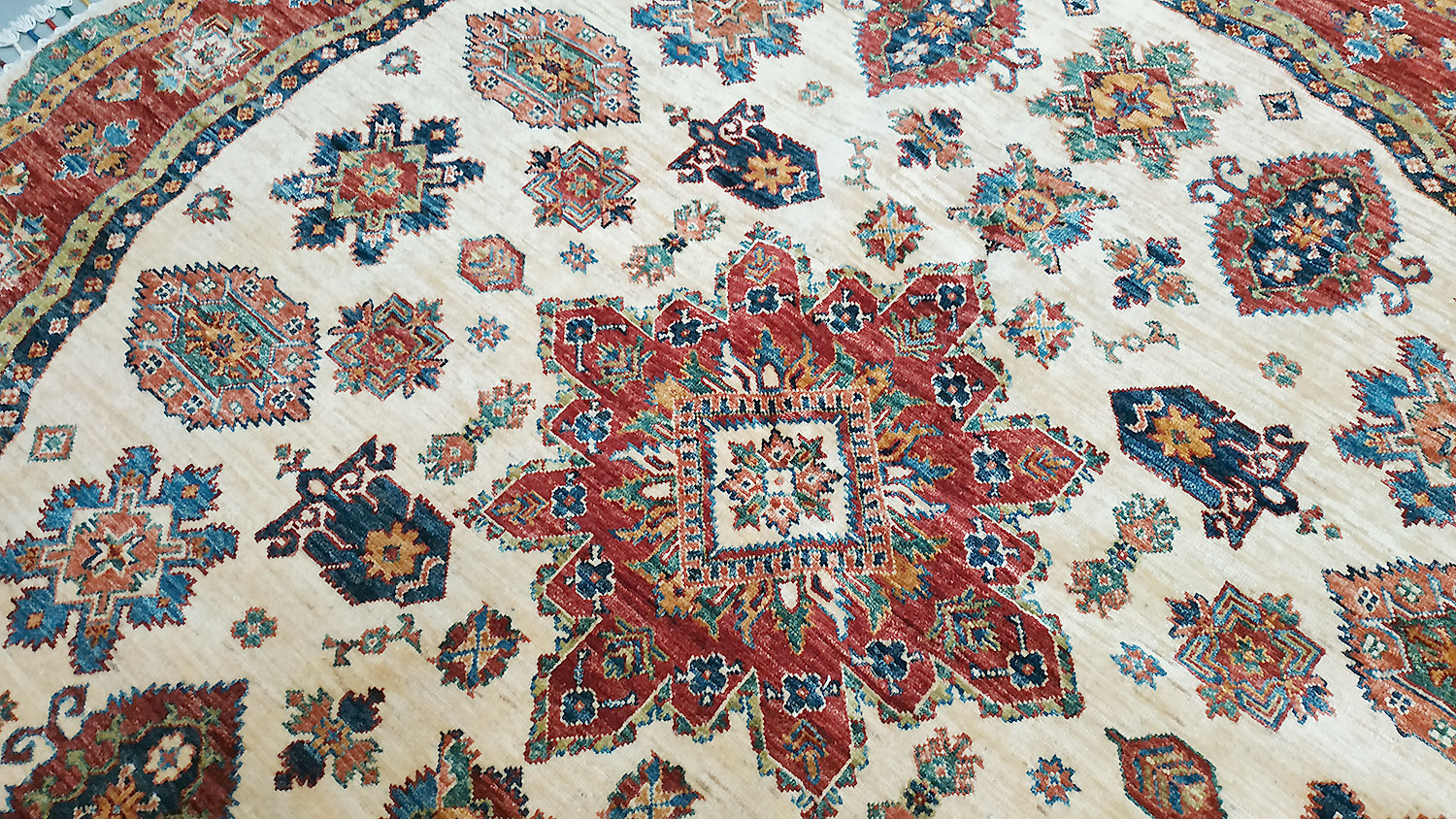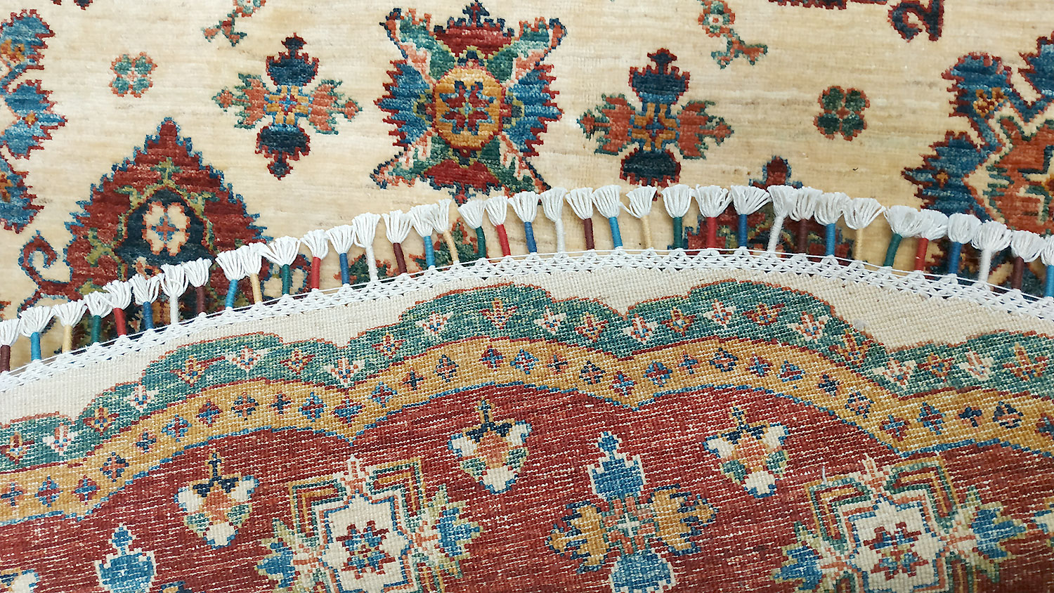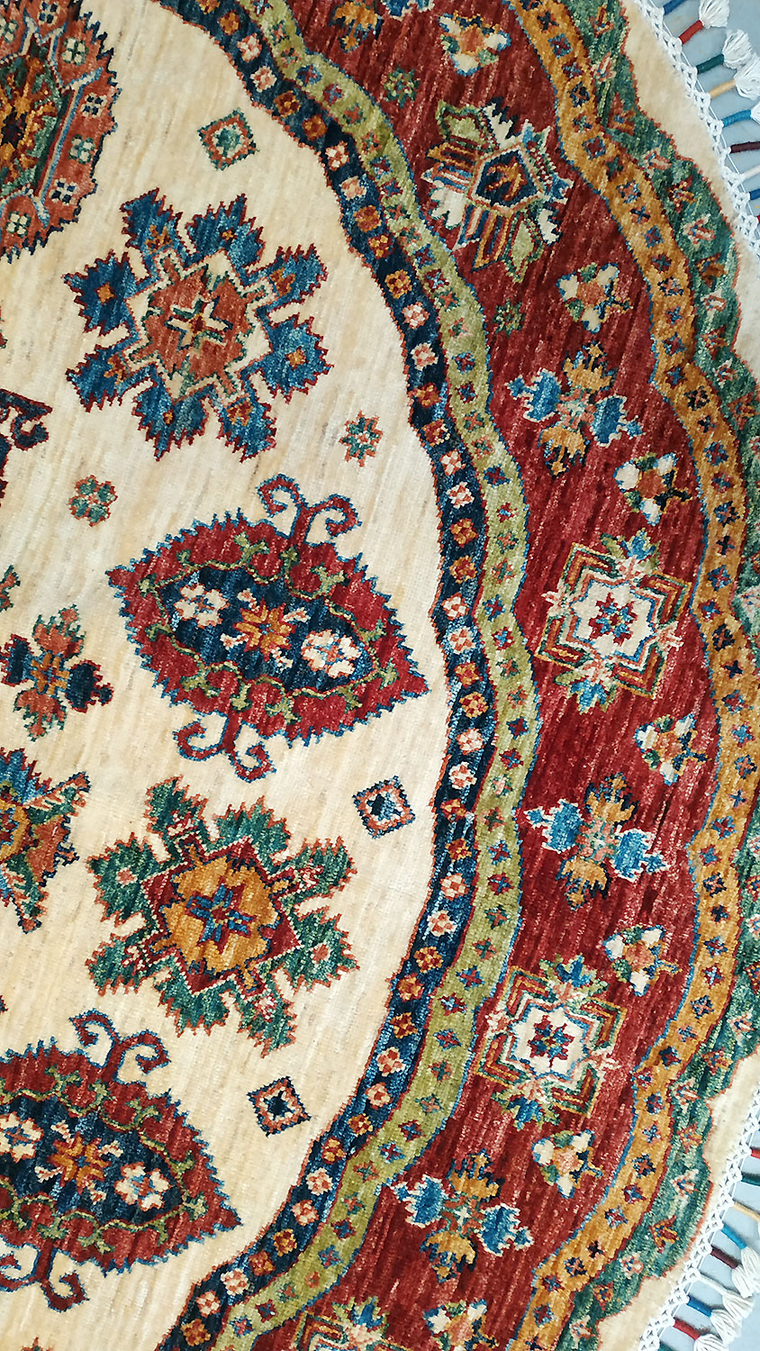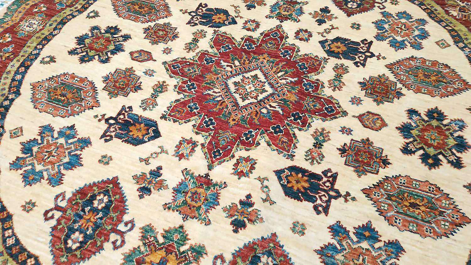 Dimensions : 197 x 195 cm -laine- Pays Afghanistan - Épaisseur : 8 mm - Densité de nouage : 300.000 Nœuds au m² - Surface : 3.84 m² - Poids : 11.52 Kgs - Age : contemporain - Confection : Noué main - Forme : Tapis rond - Type : Tapis Oriental