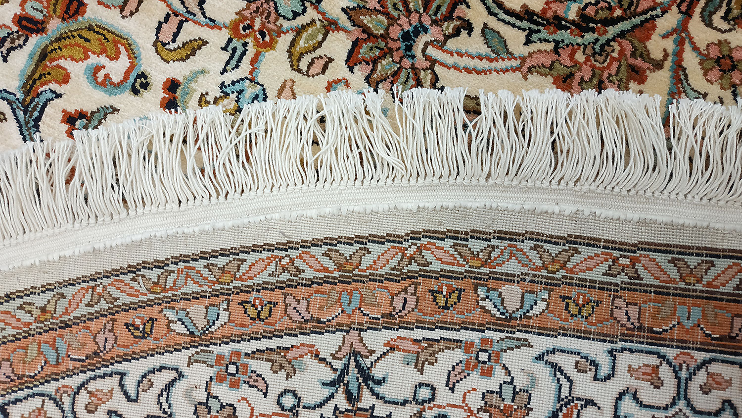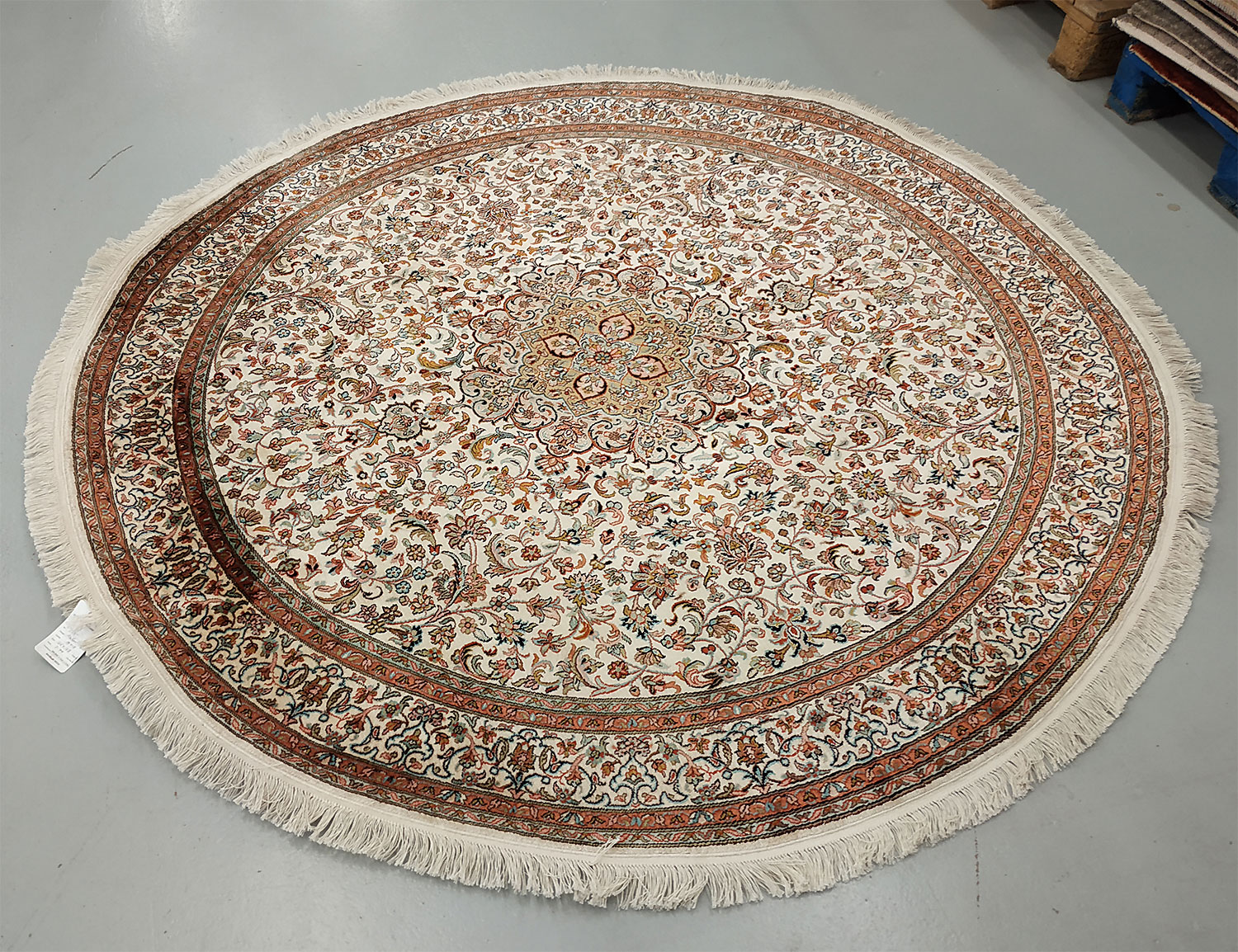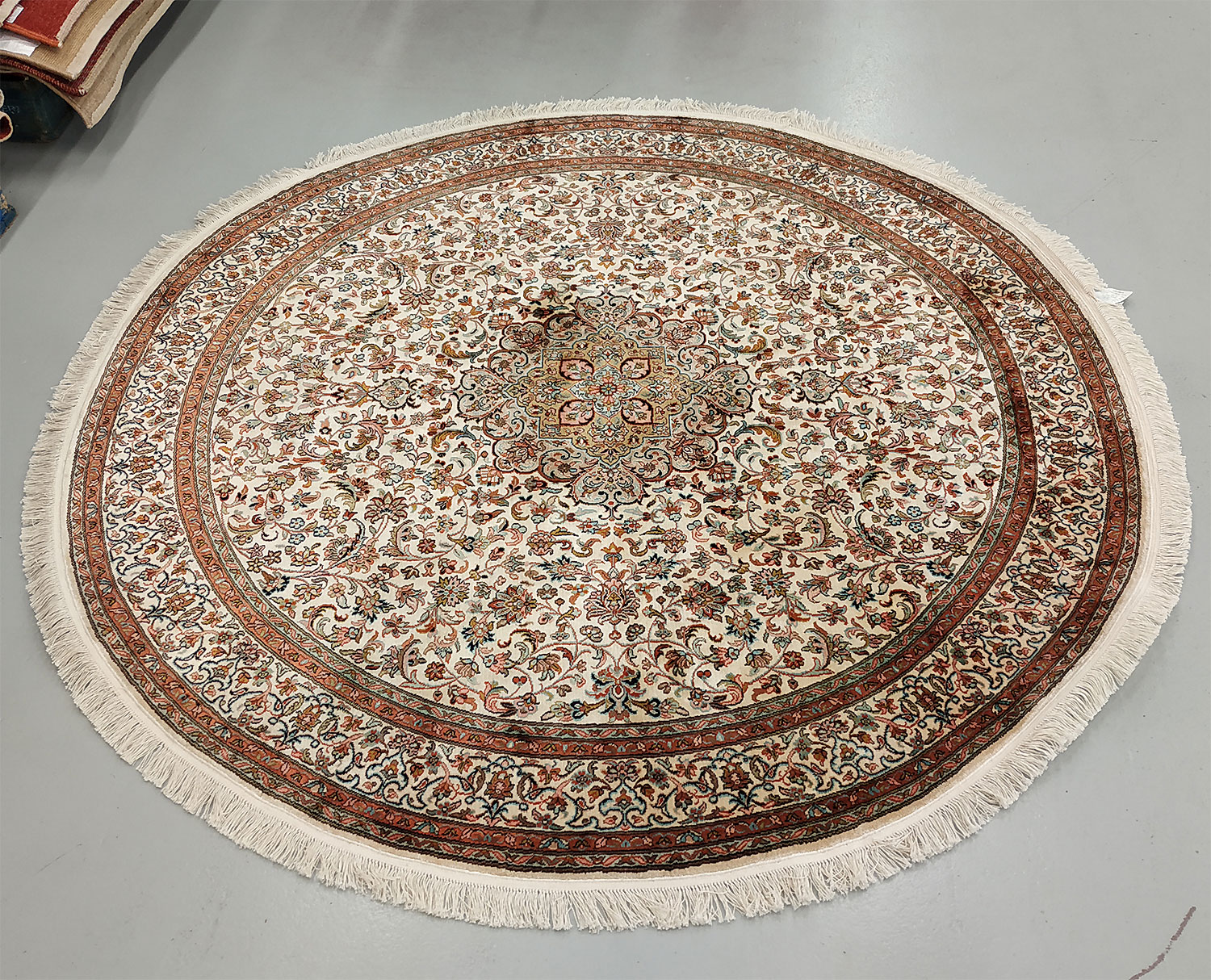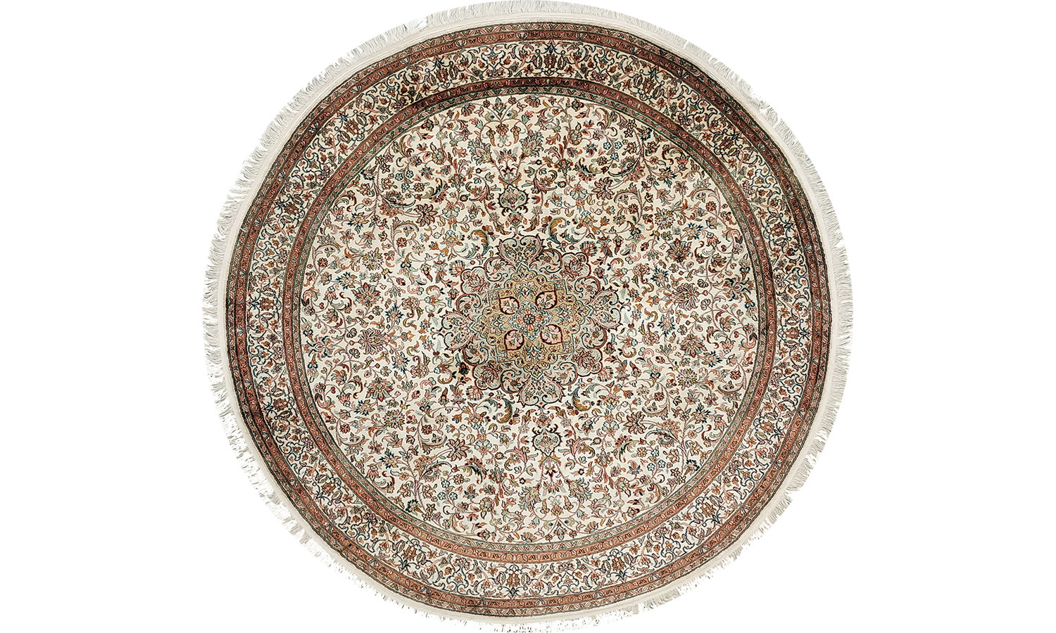 Dimensions : 170 x 167 cm -soie- Pays Inde - Épaisseur : 6 mm - Densité de nouage : 500.000 Nœuds au m² - Surface : 2.84 m² - Poids : 5.68 Kgs - Age : contemporain - Confection : Noué main - Forme : Tapis rond - Type : Tapis Oriental
