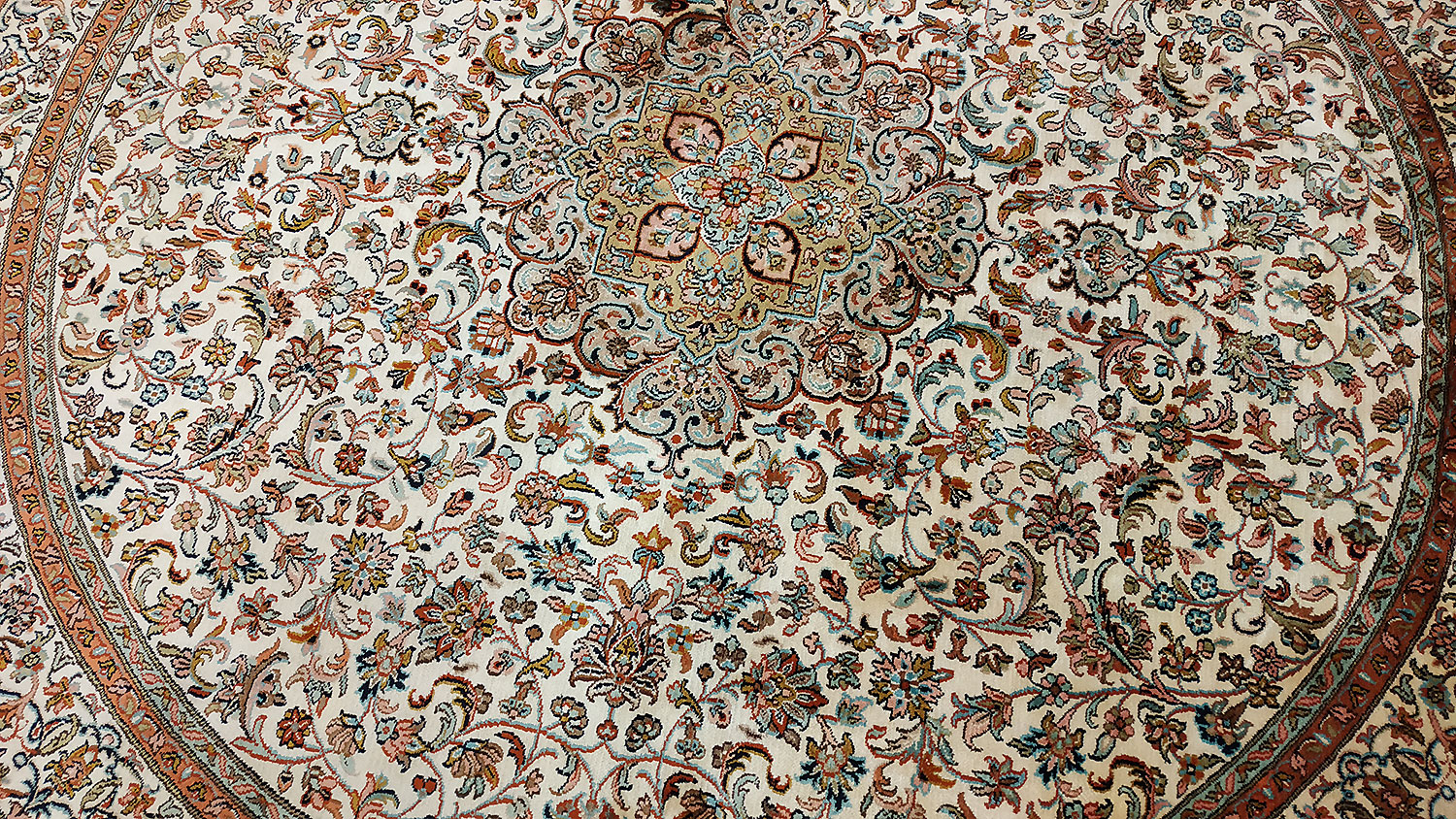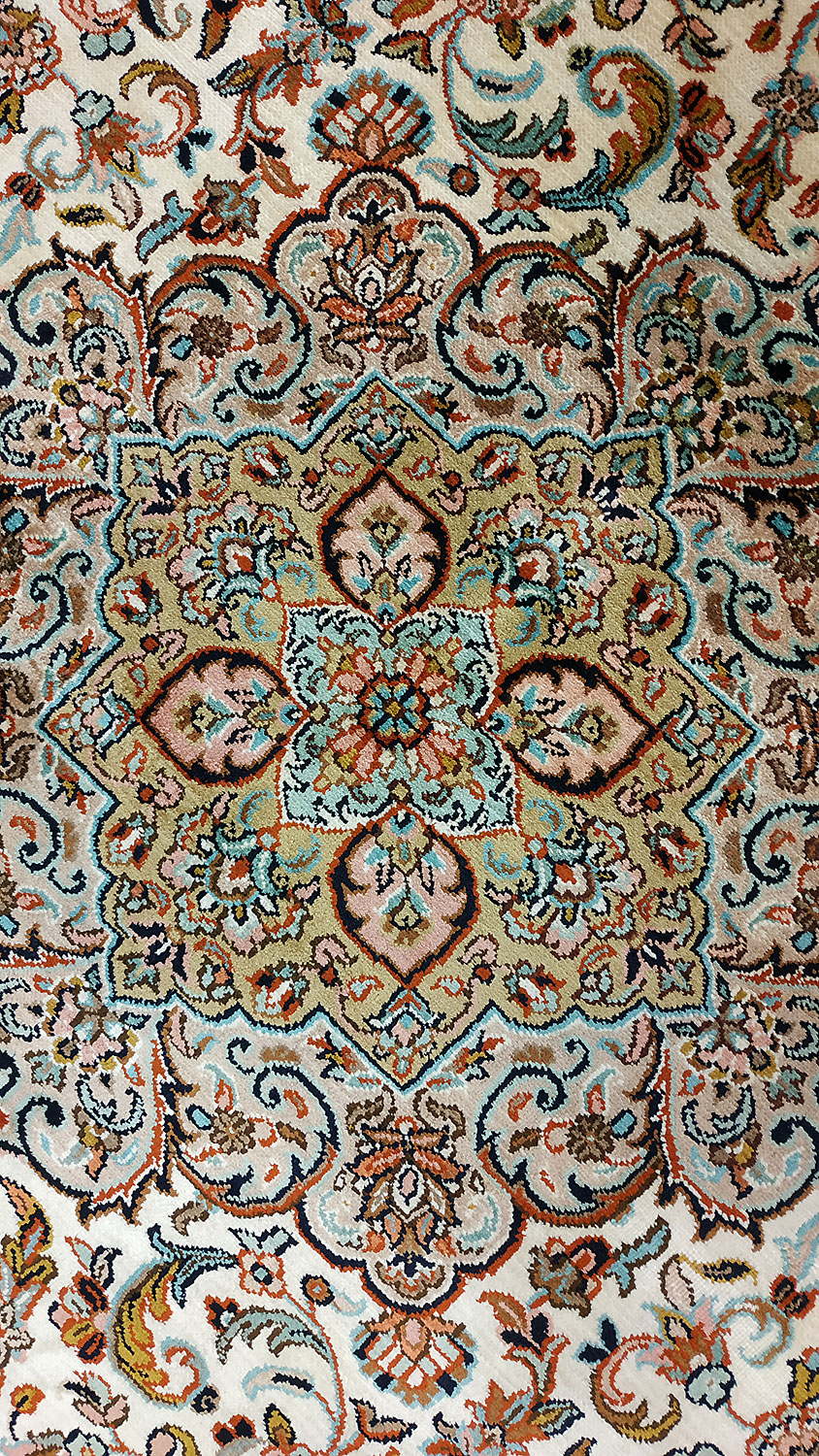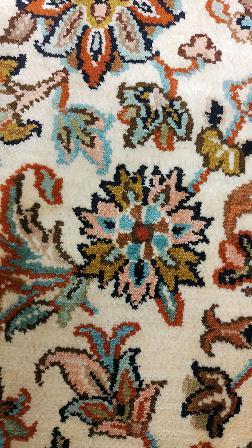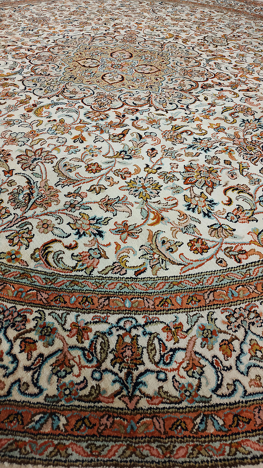 Dimensions : 170 x 167 cm -soie- Pays Inde - Épaisseur : 6 mm - Densité de nouage : 500.000 Nœuds au m² - Surface : 2.84 m² - Poids : 5.68 Kgs - Age : contemporain - Confection : Noué main - Forme : Tapis rond - Type : Tapis Oriental