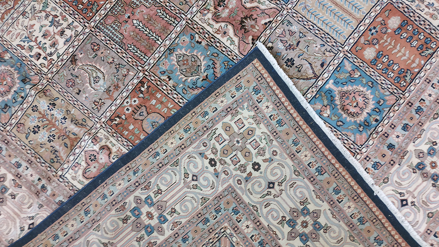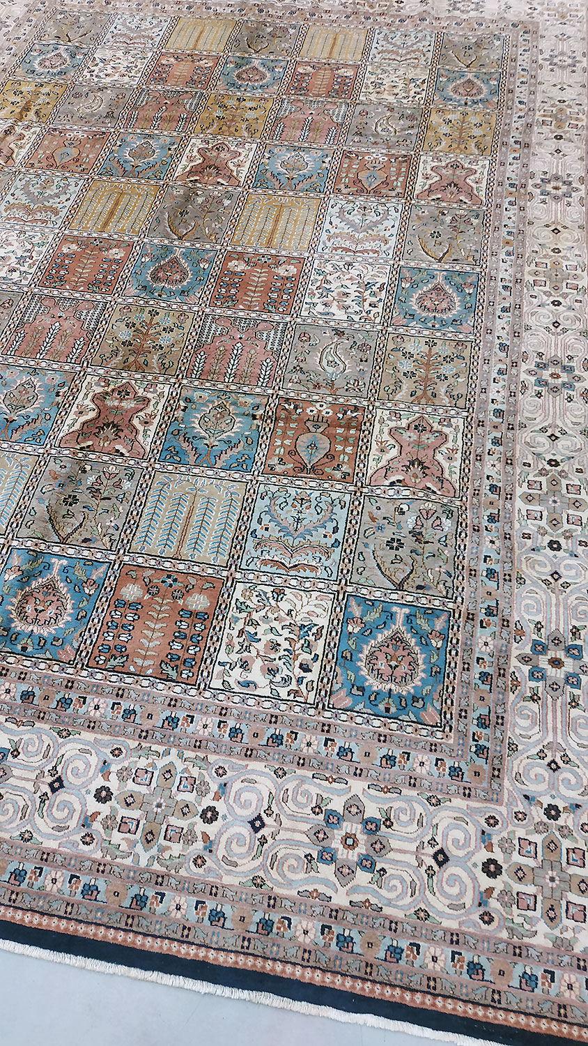 Dimensions : 371 x 280 cm -laine- Pays Pakistan - Épaisseur : 7 mm - Densité de nouage : 250.000 Nœuds au m² - Surface : 10.39 m² - Poids : 20.78 Kgs - Age : contemporain - Confection : Noué main - Forme : Tapis de salon - Type : Tapis Oriental