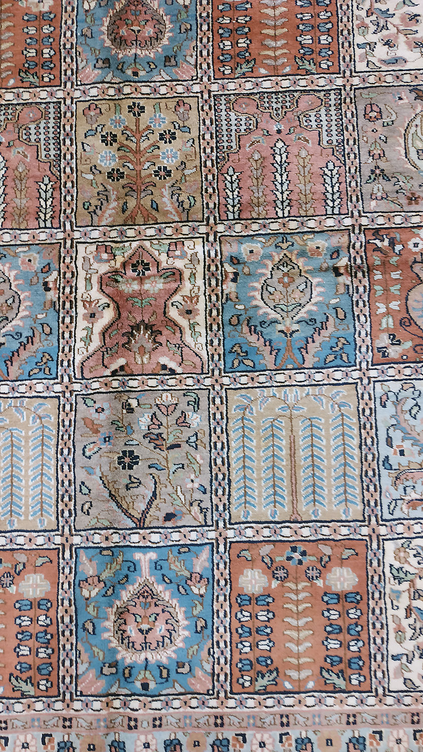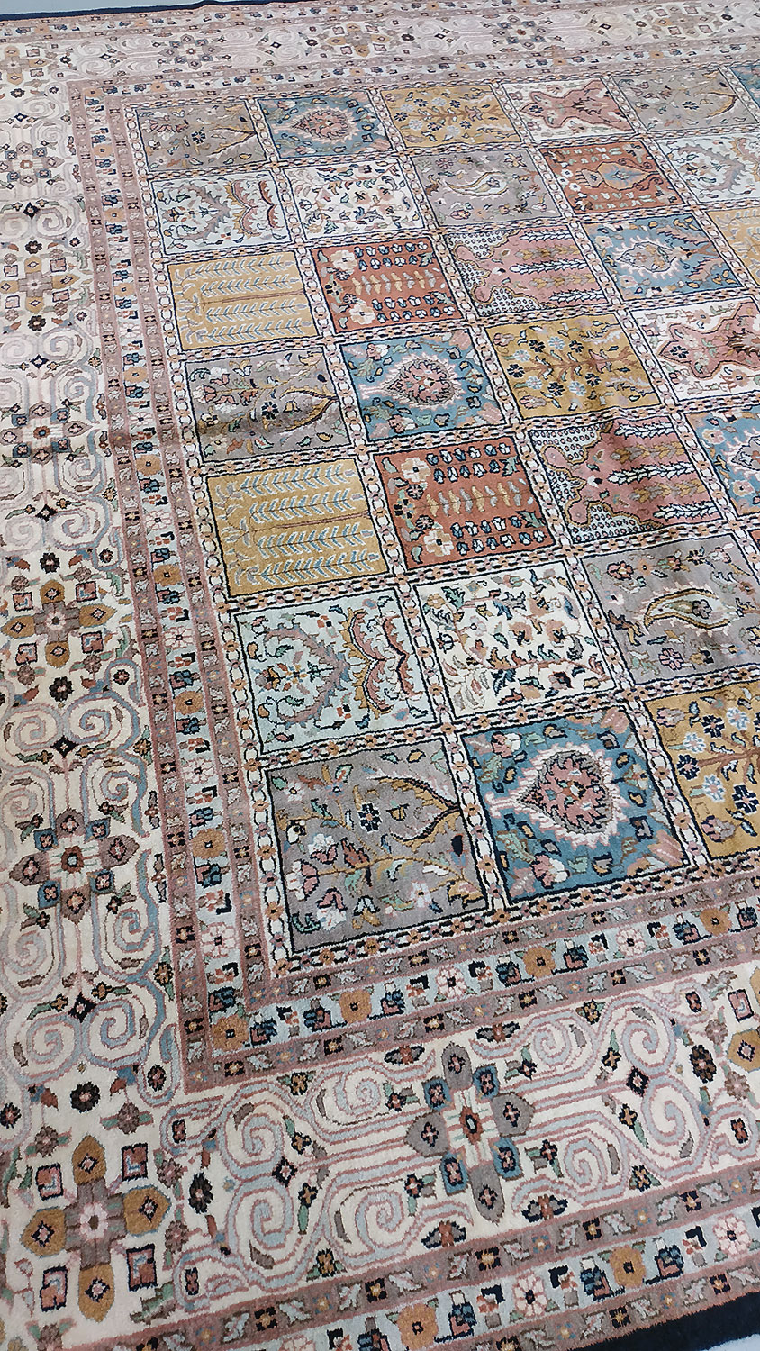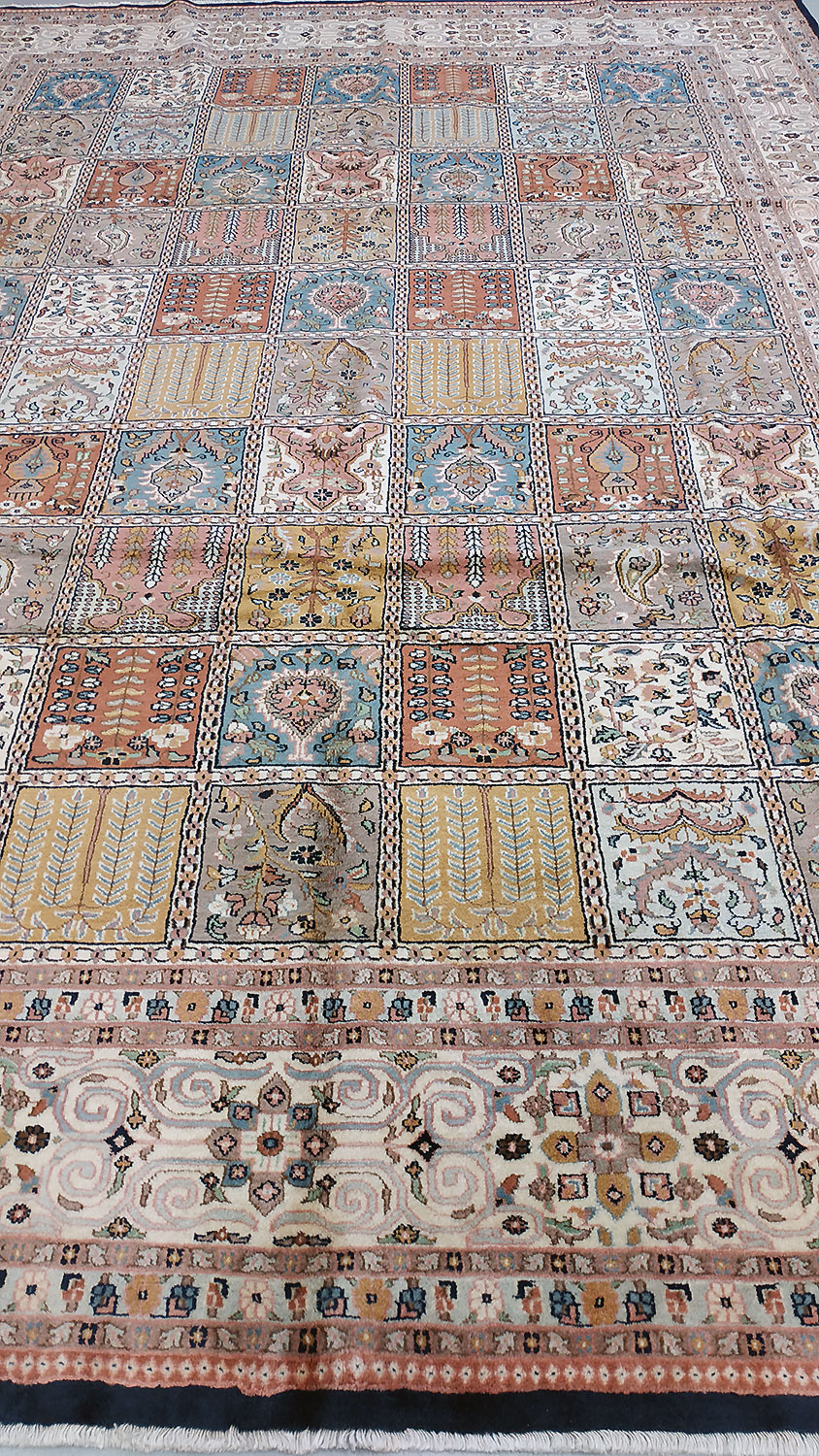 Dimensions : 367 x 270 cm -laine- Pays Pakistan - Épaisseur : 7 mm - Densité de nouage : 250.000 Nœuds au m² - Surface : 9.91 m² - Poids : 19.82 Kgs - Age : contemporain - Confection : Noué main - Forme : Tapis de salon - Type : Tapis Oriental