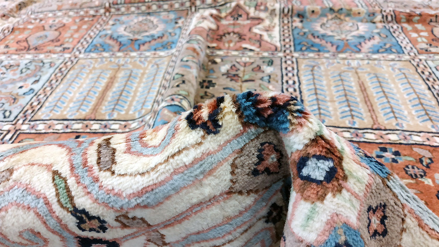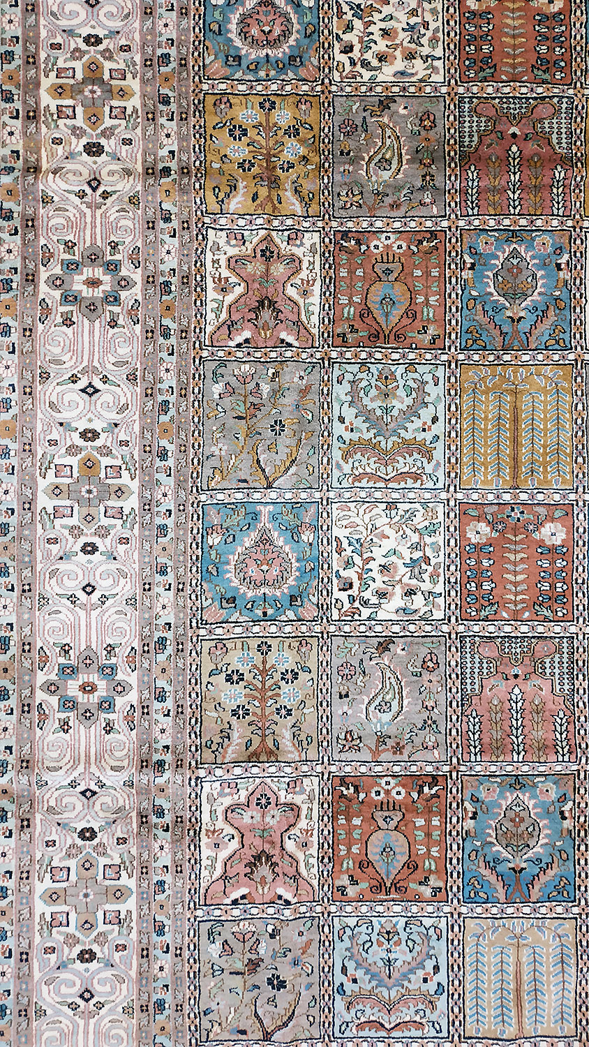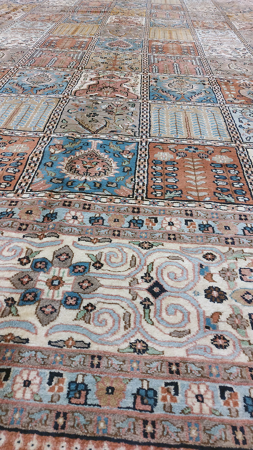 Dimensions : 374 x 274 cm -laine- Pays Pakistan - Épaisseur : 7 mm - Densité de nouage : 250.000 Nœuds au m² - Surface : 10.25 m² - Poids : 20.5 Kgs - Age : contemporain - Confection : Noué main - Forme : Tapis de salon - Type : Tapis Oriental