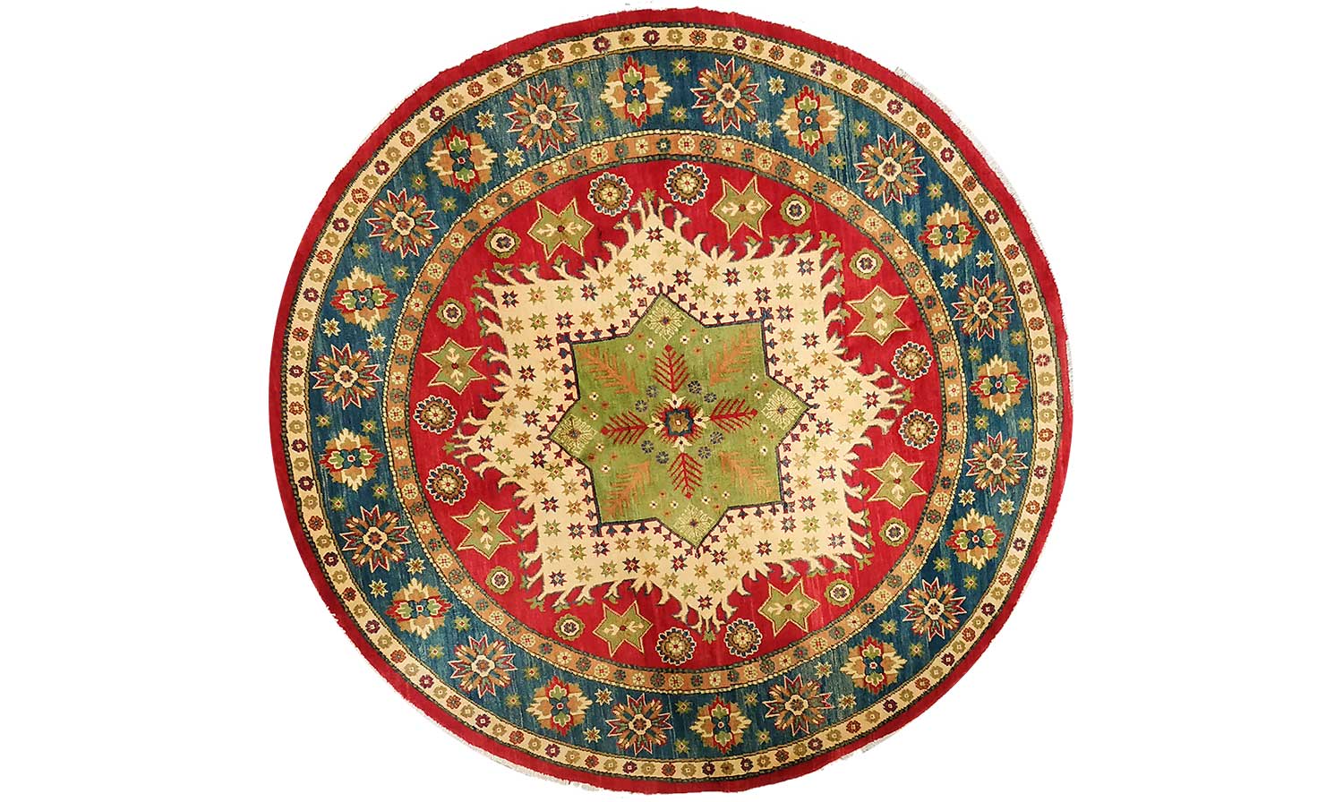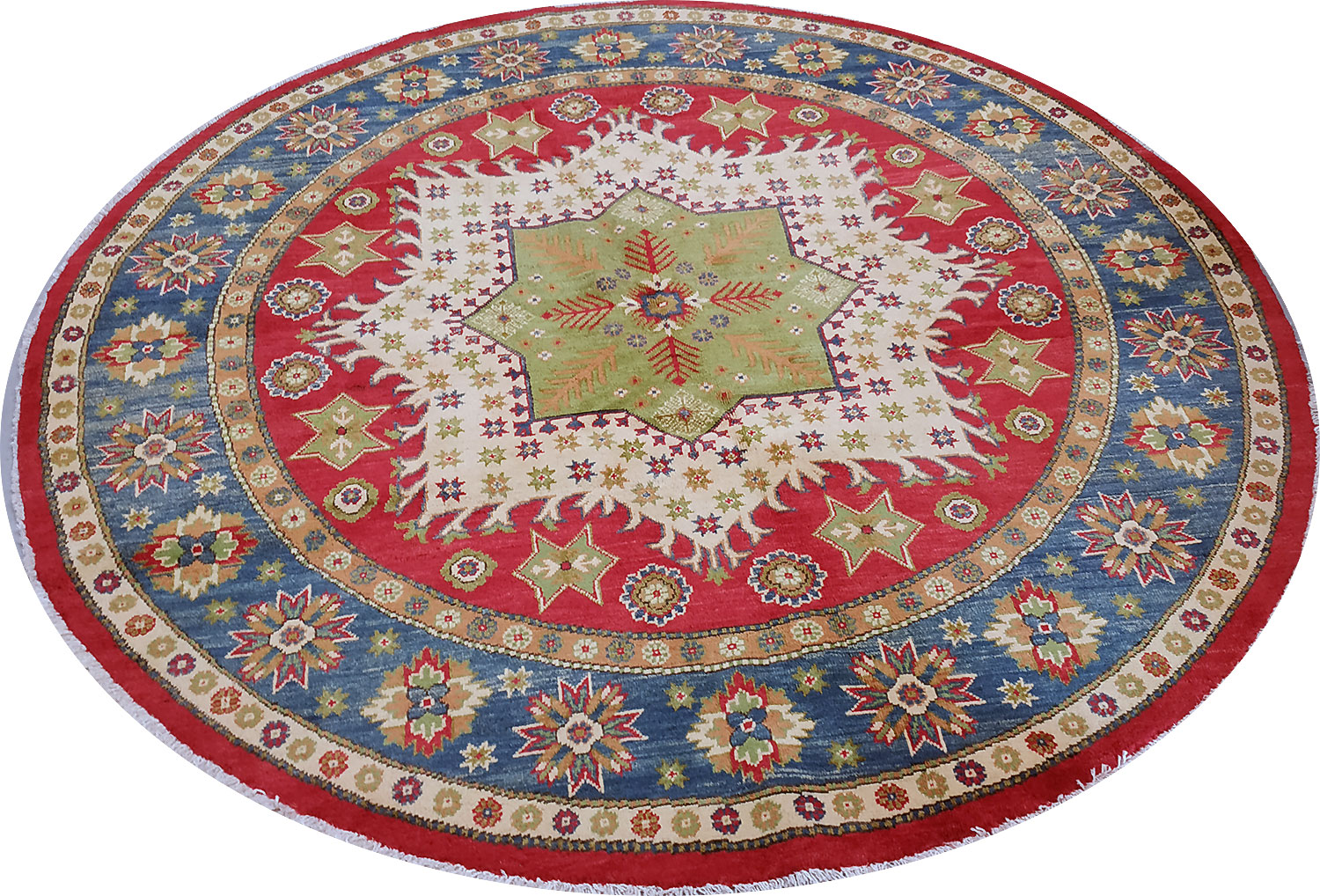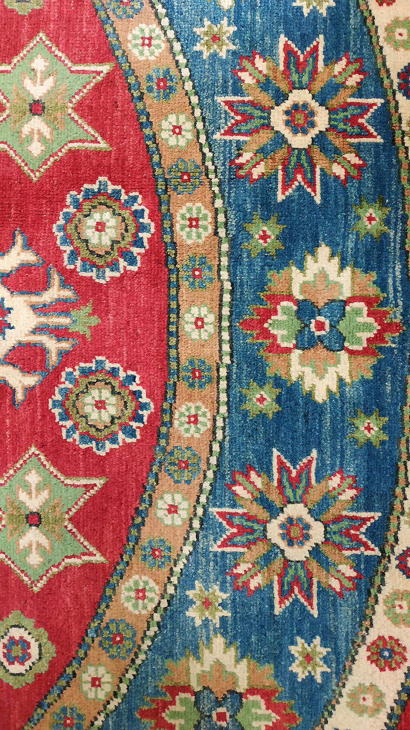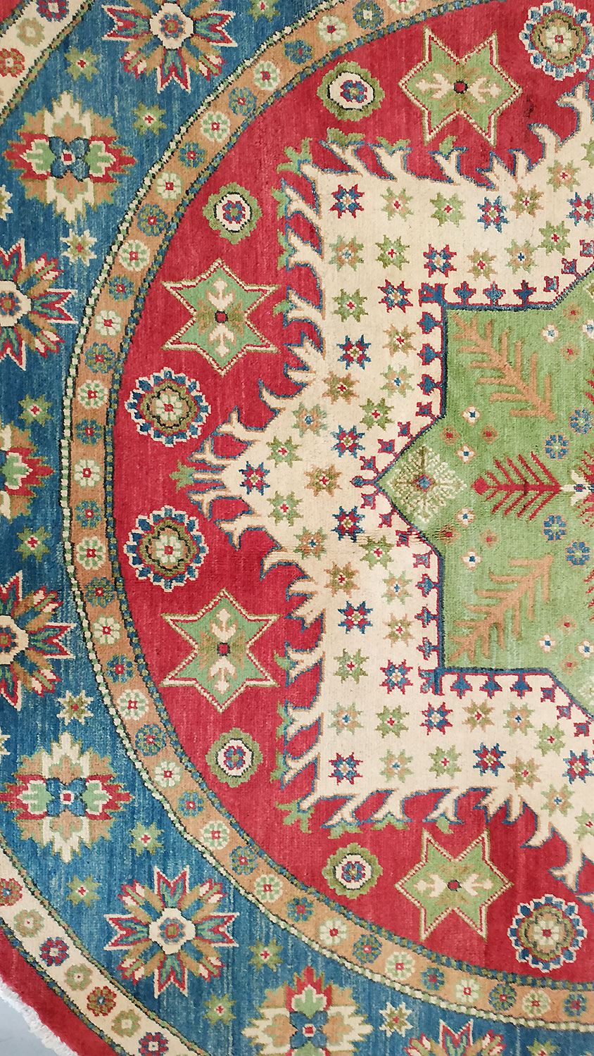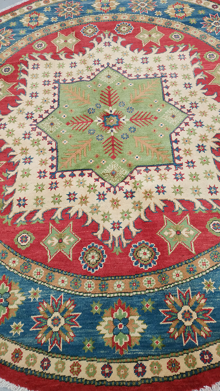 Dimensions : 197 x 195 cm -laine- Pays Afghanistan - Épaisseur : 8 mm - Densité de nouage : 300.000 Nœuds au m² - Surface : 3.84 m² - Poids : 11.52 Kgs - Age : contemporain - Confection : Noué main - Forme : Tapis rond - Type : Tapis Oriental