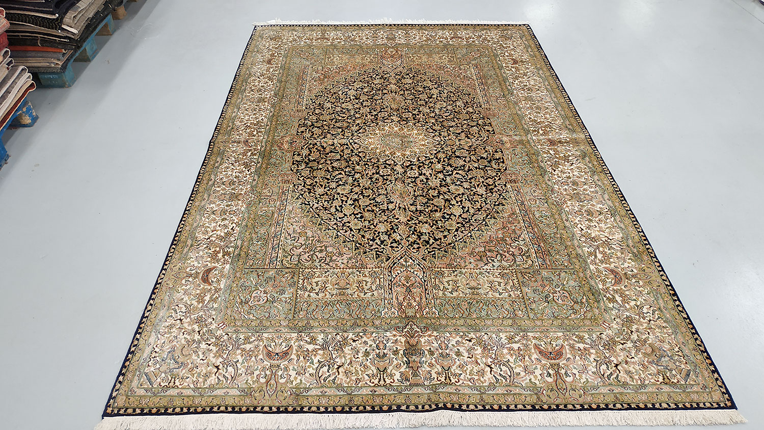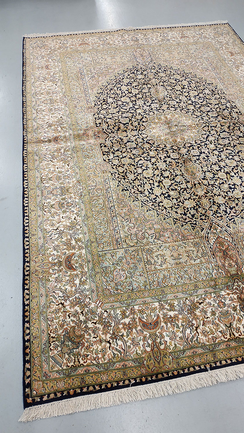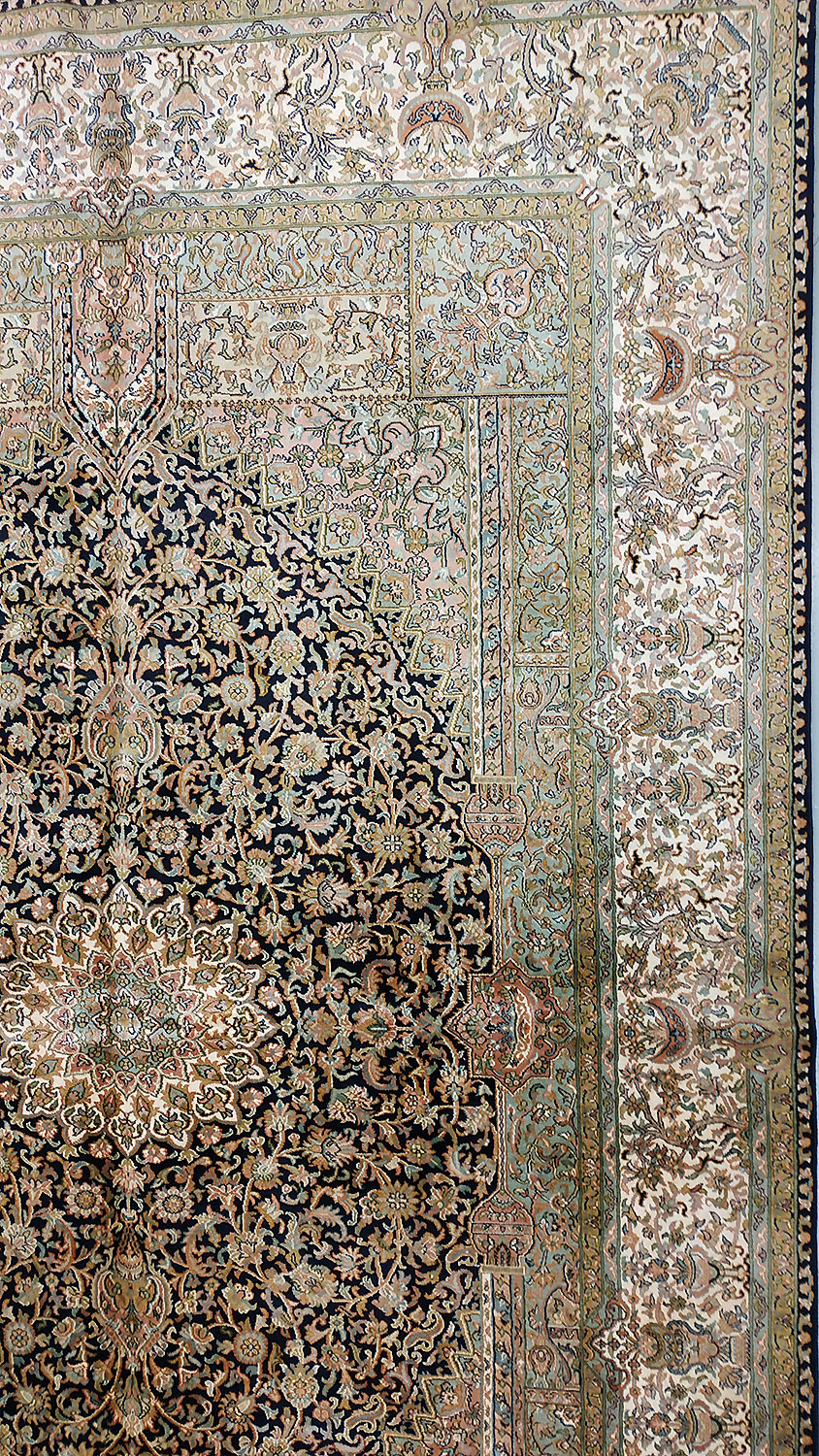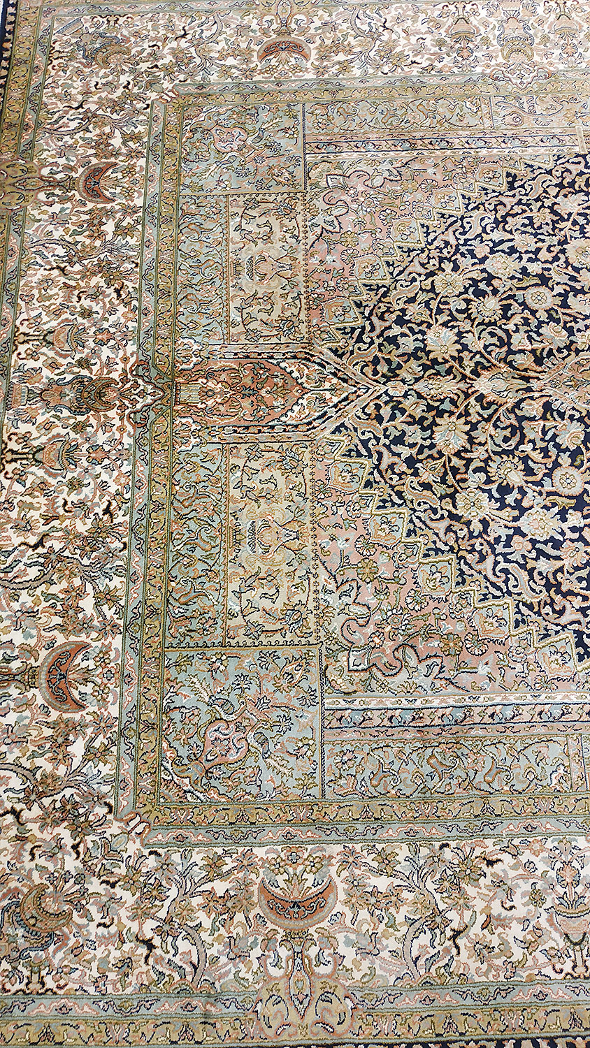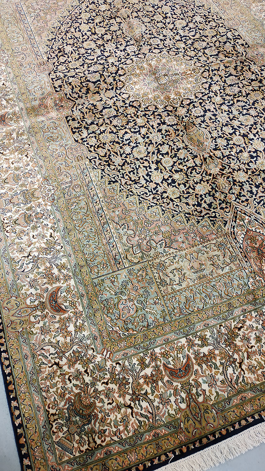 Dimensions : 279 x 186 cm -soie- Pays Inde - Épaisseur : 6 mm - Densité de nouage : 500.000 Nœuds au m² - Surface : 5.19 m² - Poids : 10.38 Kgs - Age : contemporain - Confection : Noué main - Forme : Tapis de salon - Type : Tapis Oriental