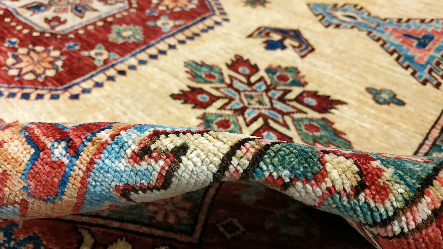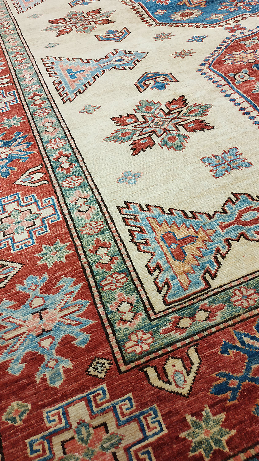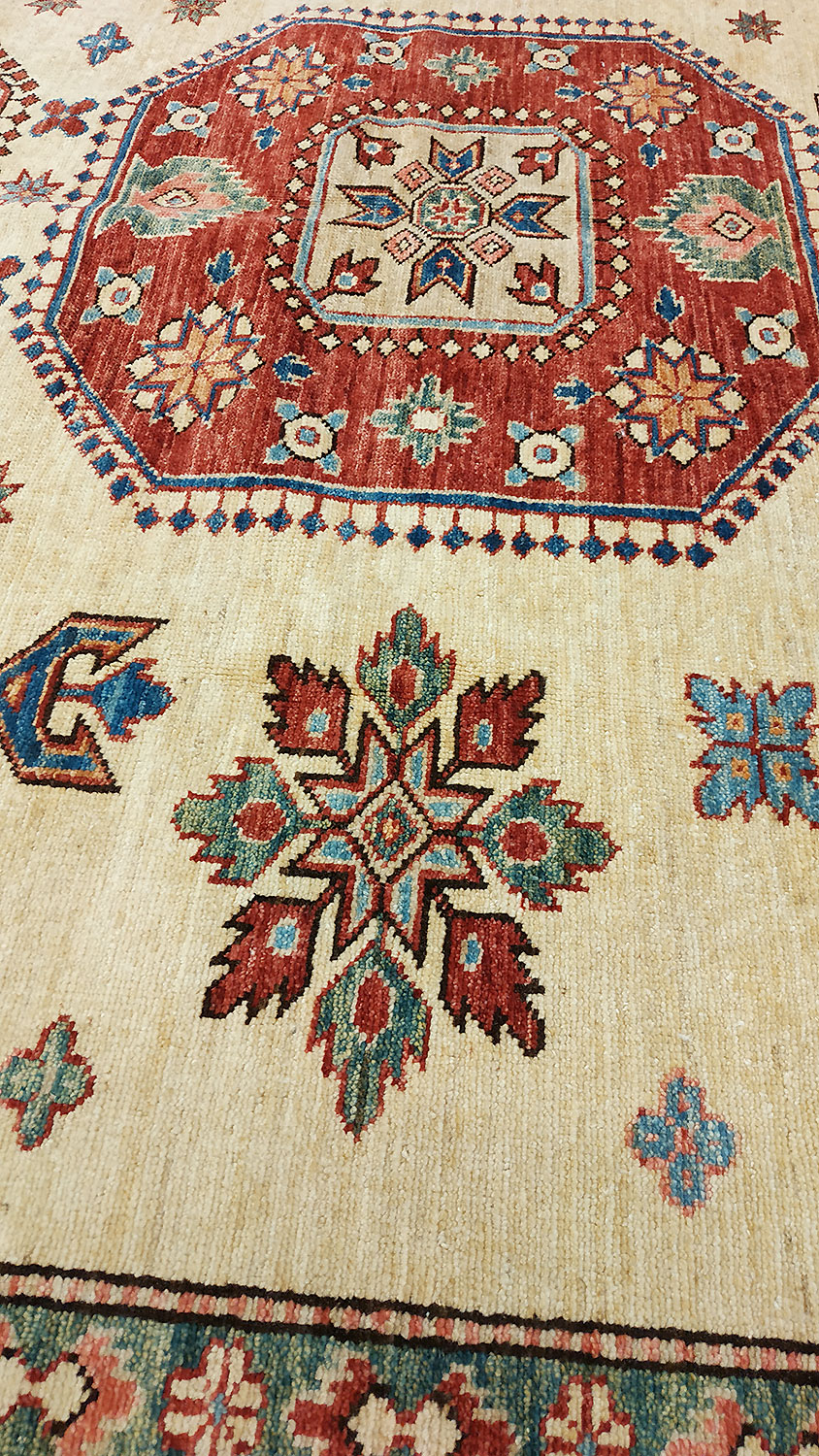Dimensions : 242 x 182 cm -laine- Pays Afghanistan - Épaisseur : 8 mm - Densité de nouage : 300.000 Nœuds au m² - Surface : 4.4 m² - Poids : 13.21 Kgs - Age : contemporain - Confection : Noué main - Forme : Tapis de chambre - Type : Tapis Oriental