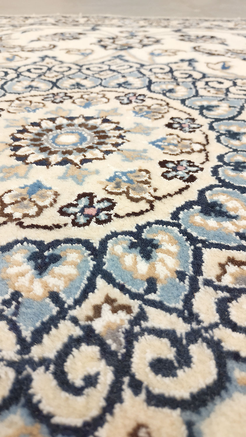 Dimensions : 164 x 110 cm -laine et soie- Pays Iran - Épaisseur : 9 mm - Densité de nouage : 360.000 Nœuds au m² - Surface : 1.8 m² - Poids : 4.51 Kgs - Age : contemporain - Confection : Noué main - Forme : Tapis de chambre - Type : Tapis persan