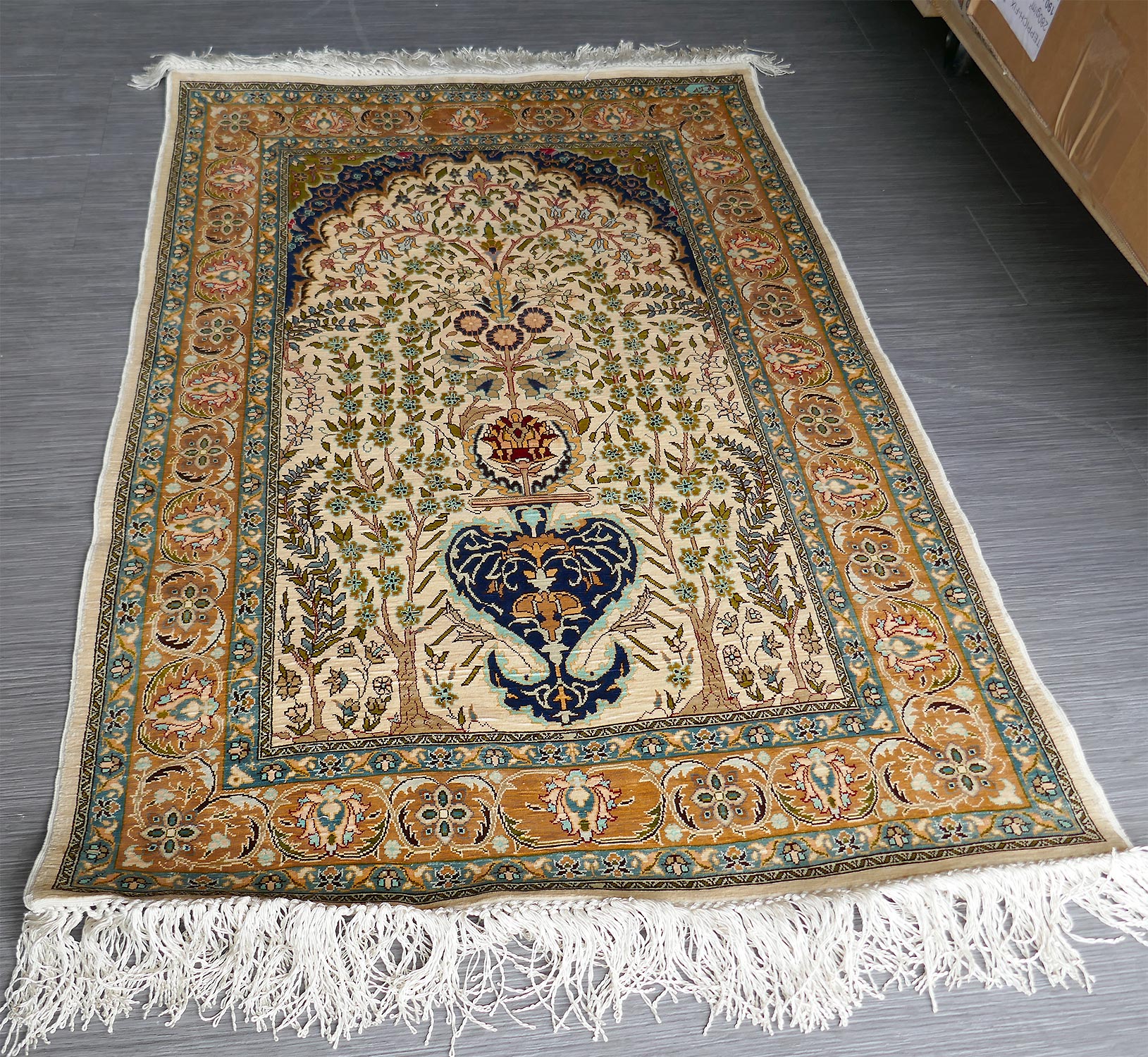 Dimensions : 76 x 51 cm -soie- Pays Turquie - Épaisseur : 4 mm - Densité de nouage : 1.500.000 Nœuds au m² - Surface : 0.39 m² - Poids : 0.78 Kgs - Age : contemporain - Confection : Noué main - Forme : Tapis de chambre - Type : Tapis Oriental