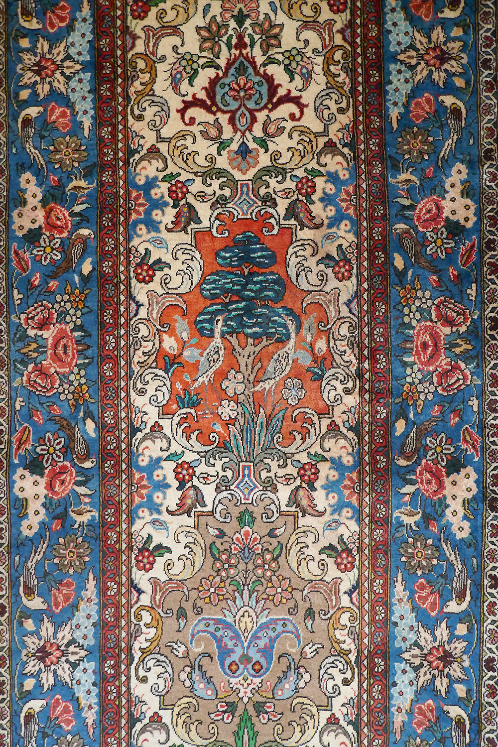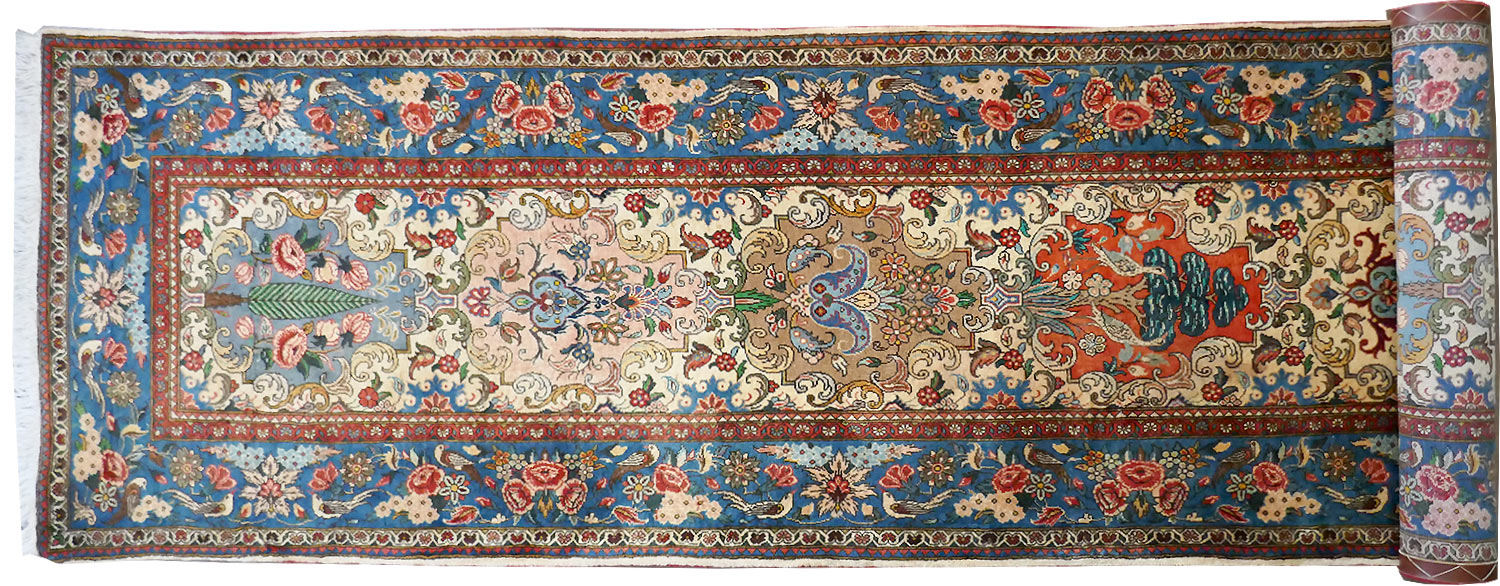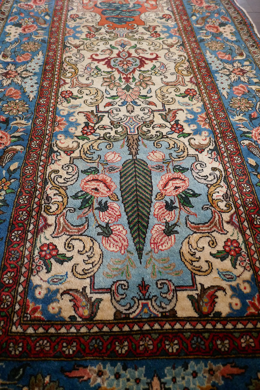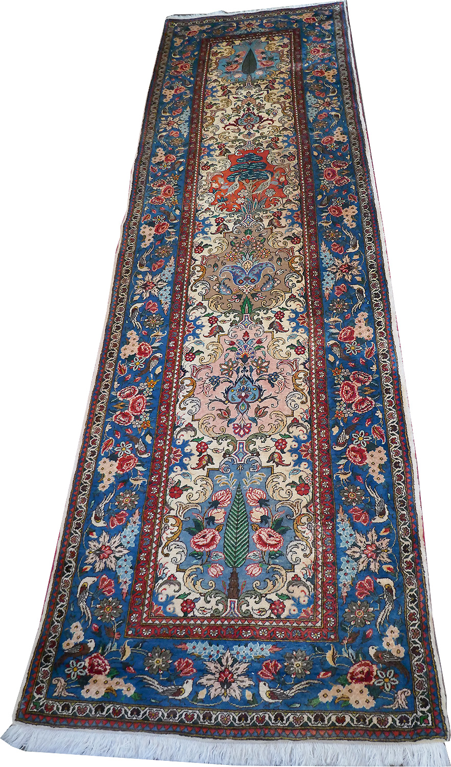 Dimensions : 390 x 78 cm -laine et soie- Pays Iran - Épaisseur : mm - Densité de nouage : Nœuds au m² - Surface : 0 m² - Poids : 0 Kgs - Age : - Confection : - Forme : - Type :