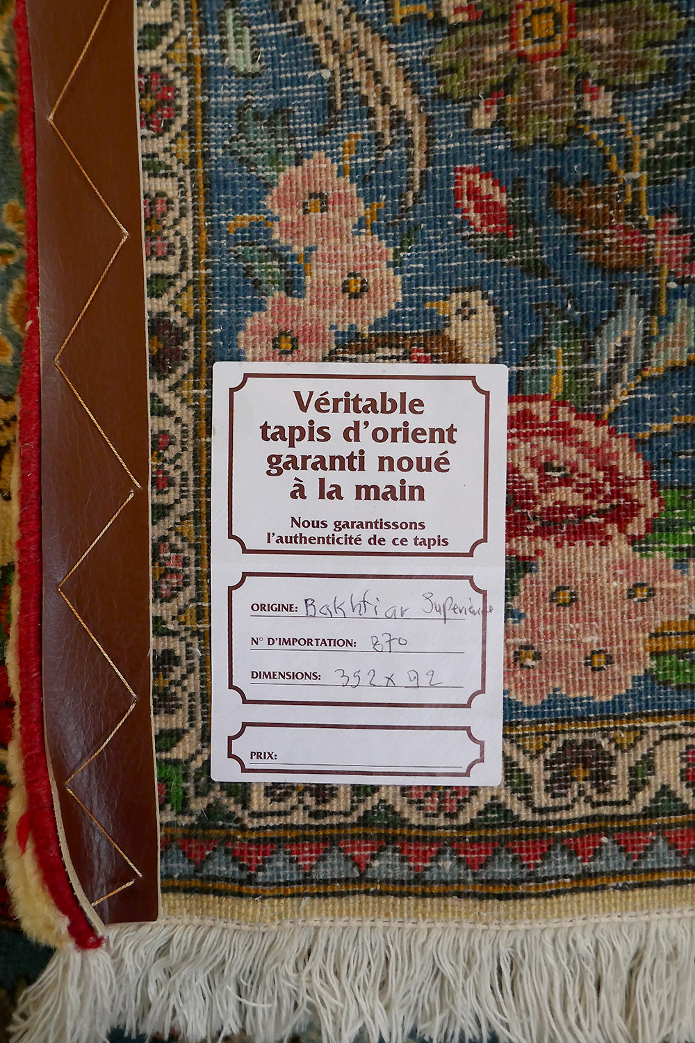 Dimensions : 390 x 89 cm -laine- Pays Iran - Épaisseur : mm - Densité de nouage : Nœuds au m² - Surface : 0 m² - Poids : 0 Kgs - Age : - Confection : - Forme : - Type :