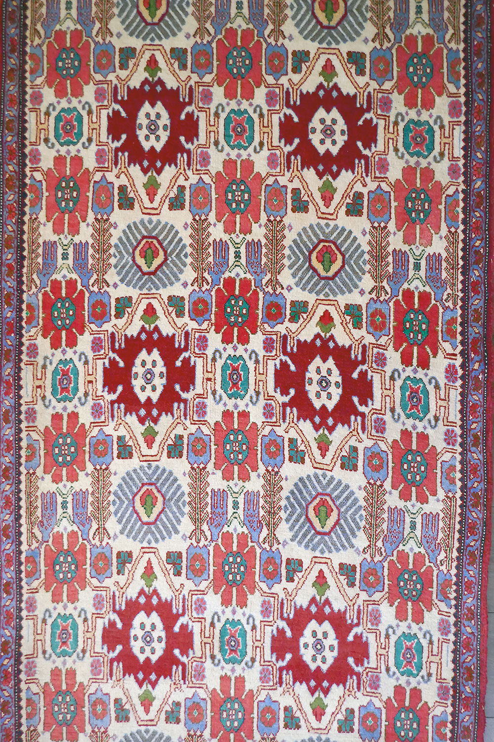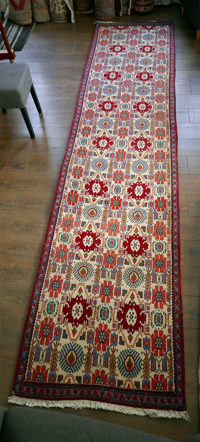 Dimensions : 378 x 72 cm -laine- Pays Iran - Épaisseur : mm - Densité de nouage : Nœuds au m² - Surface : 0 m² - Poids : 0 Kgs - Age : - Confection : - Forme : - Type :