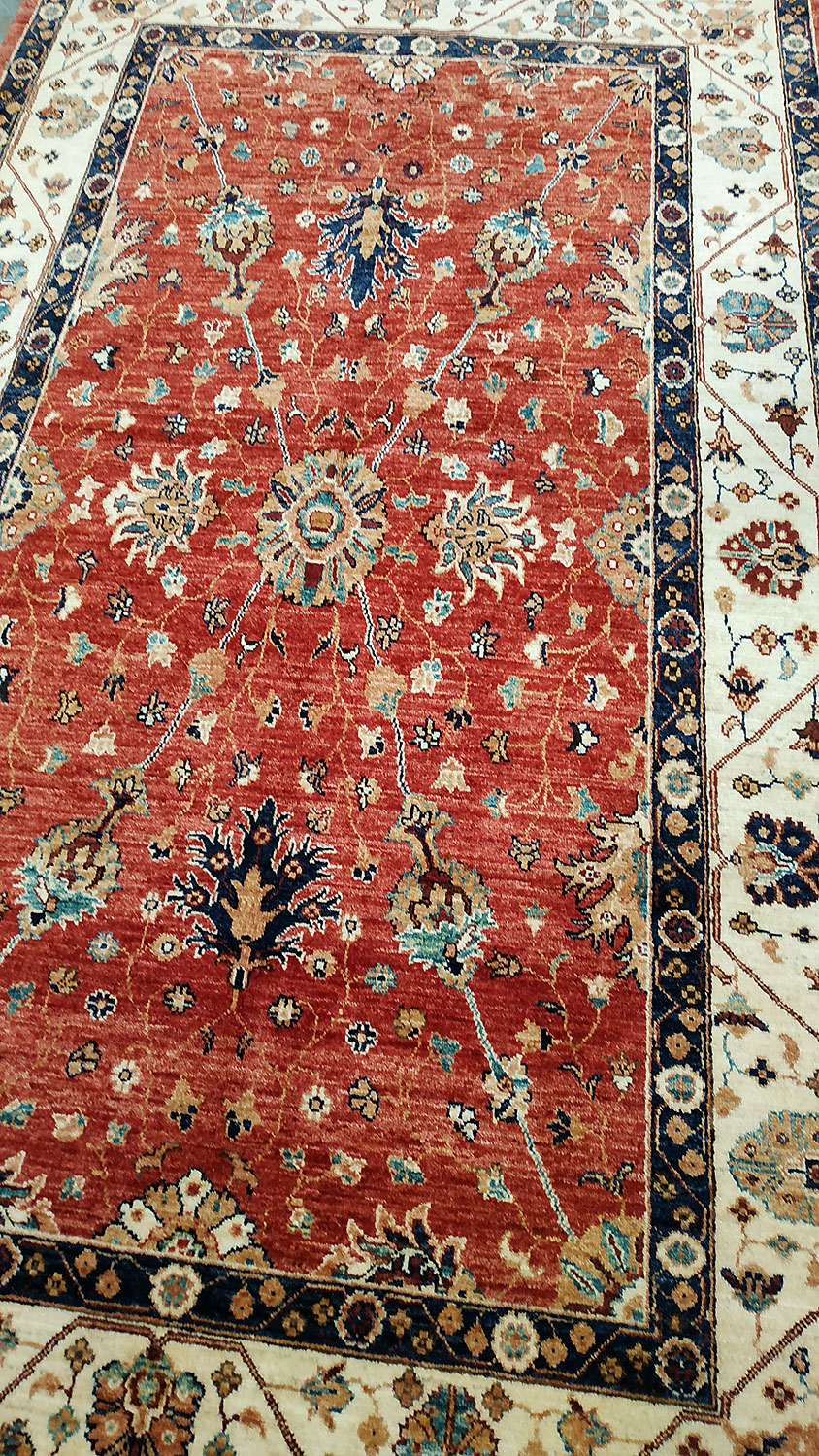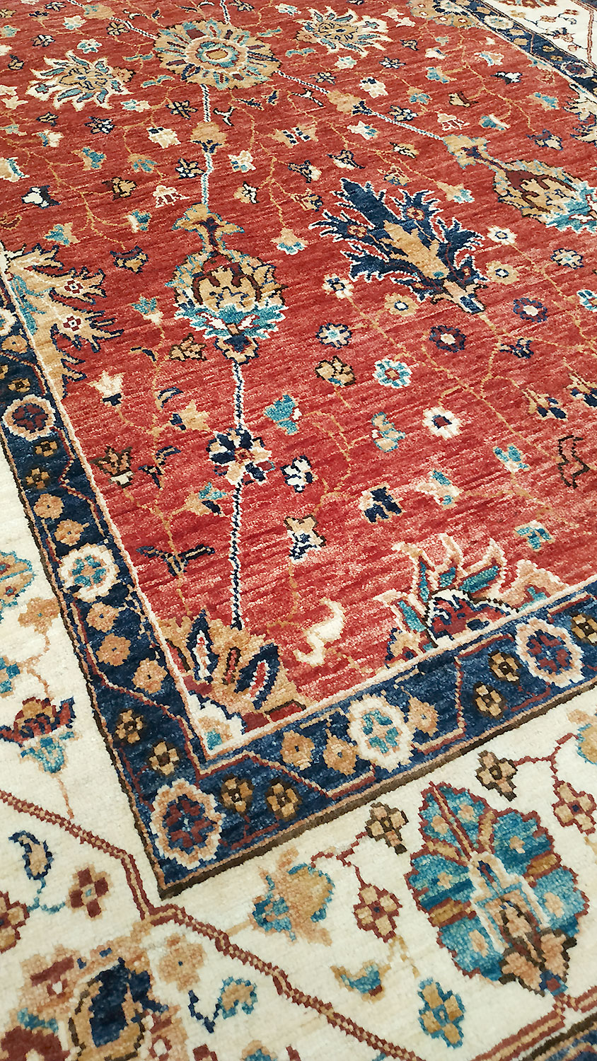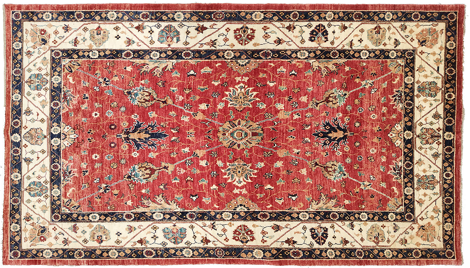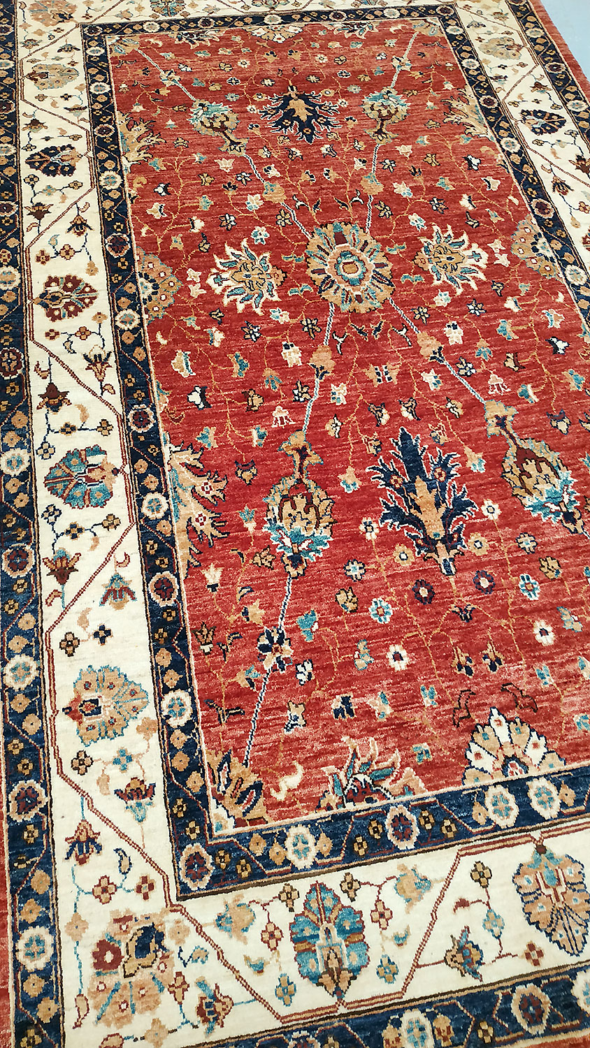 Dimensions : 215 x 146 cm -laine- Pays Afghanistan - Épaisseur : 9 mm - Densité de nouage : 200.000 Nœuds au m² - Surface : 3.14 m² - Poids : 9.42 Kgs - Age : contemporain - Confection : Noué main - Forme : Tapis de chambre - Type : Tapis Oriental