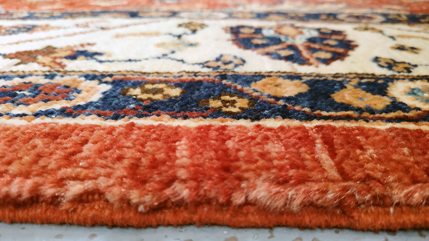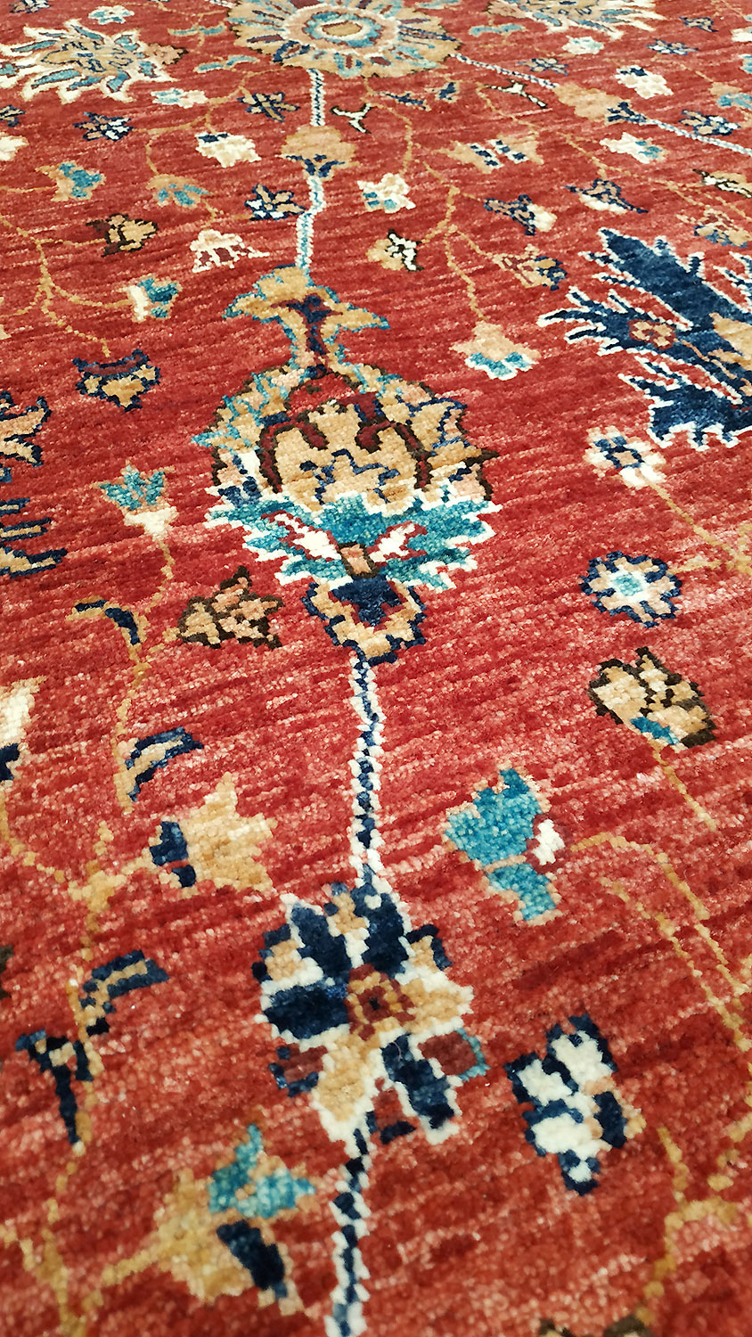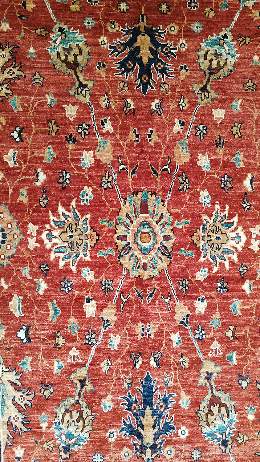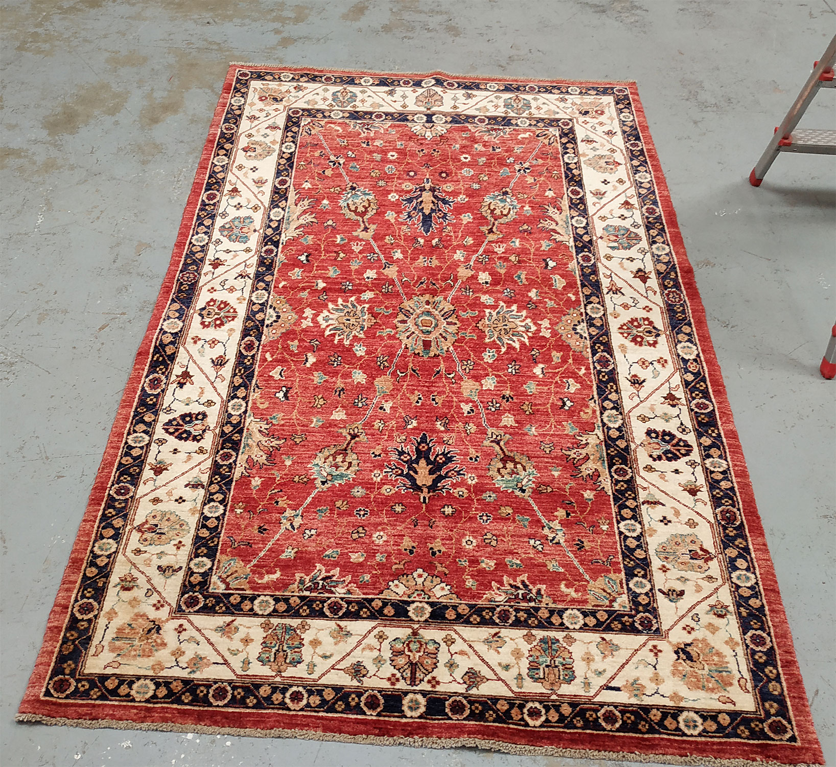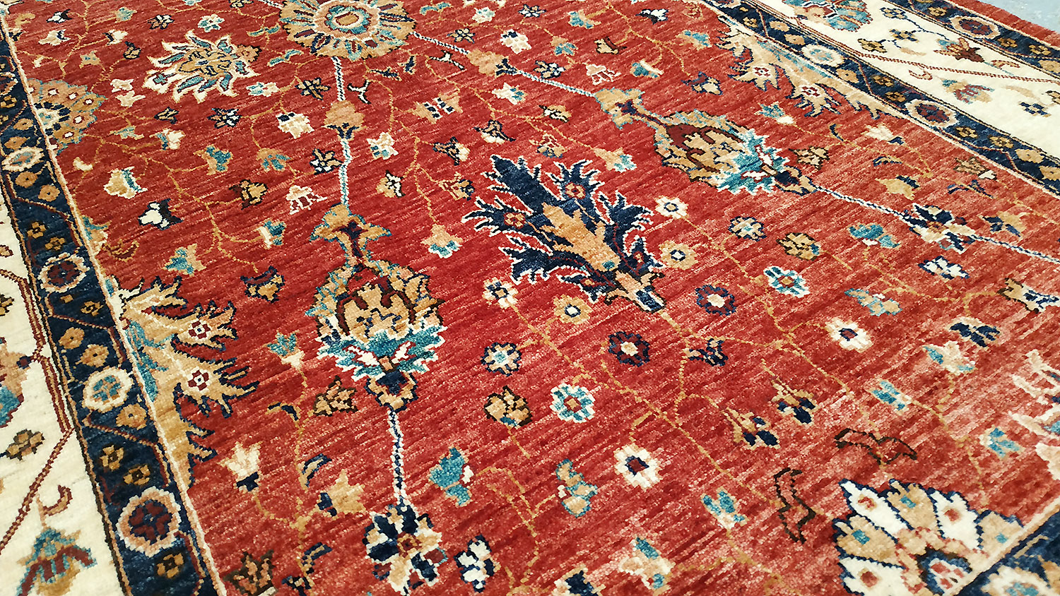 Dimensions : 215 x 146 cm -laine- Pays Afghanistan - Épaisseur : 9 mm - Densité de nouage : 200.000 Nœuds au m² - Surface : 3.14 m² - Poids : 9.42 Kgs - Age : contemporain - Confection : Noué main - Forme : Tapis de chambre - Type : Tapis Oriental