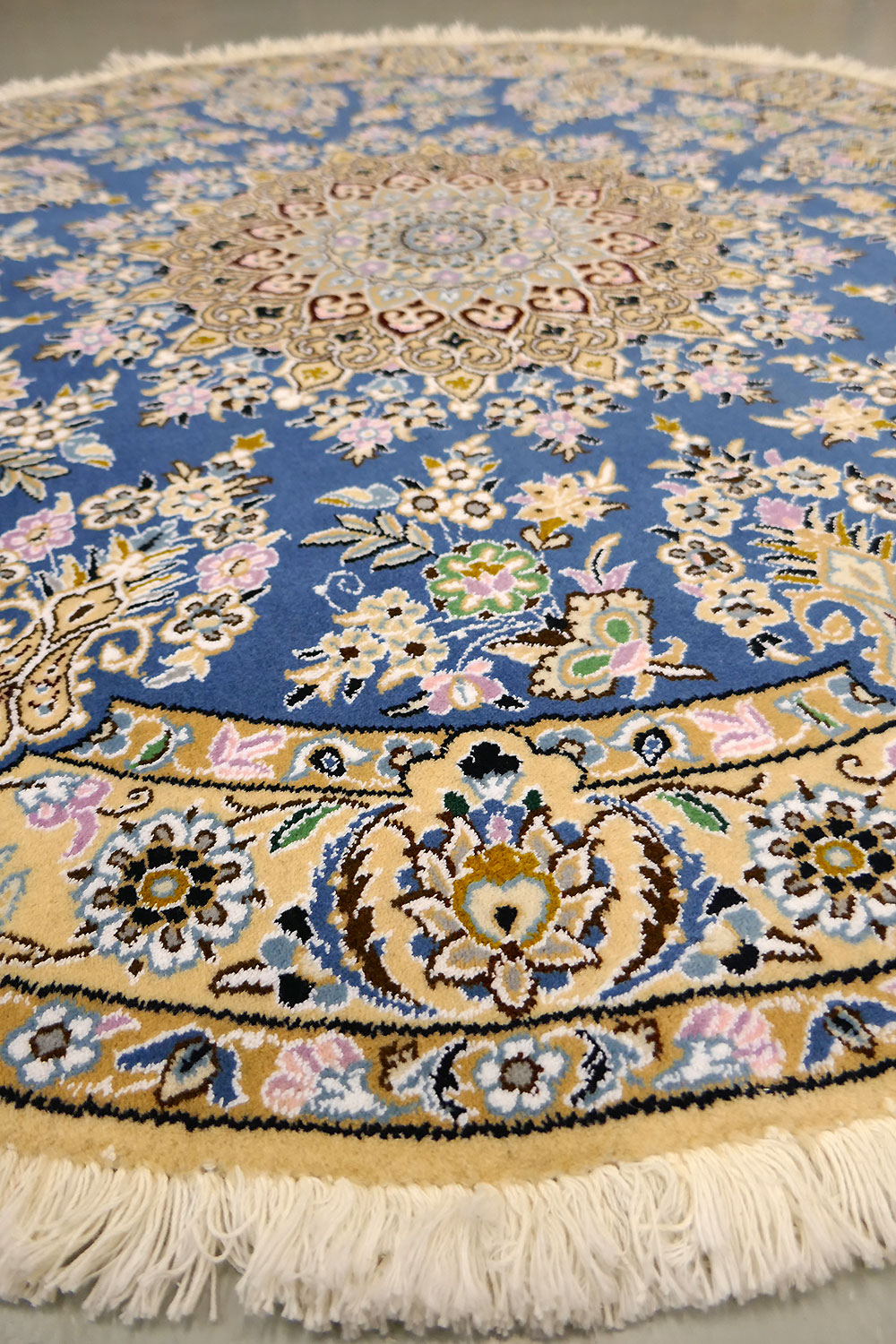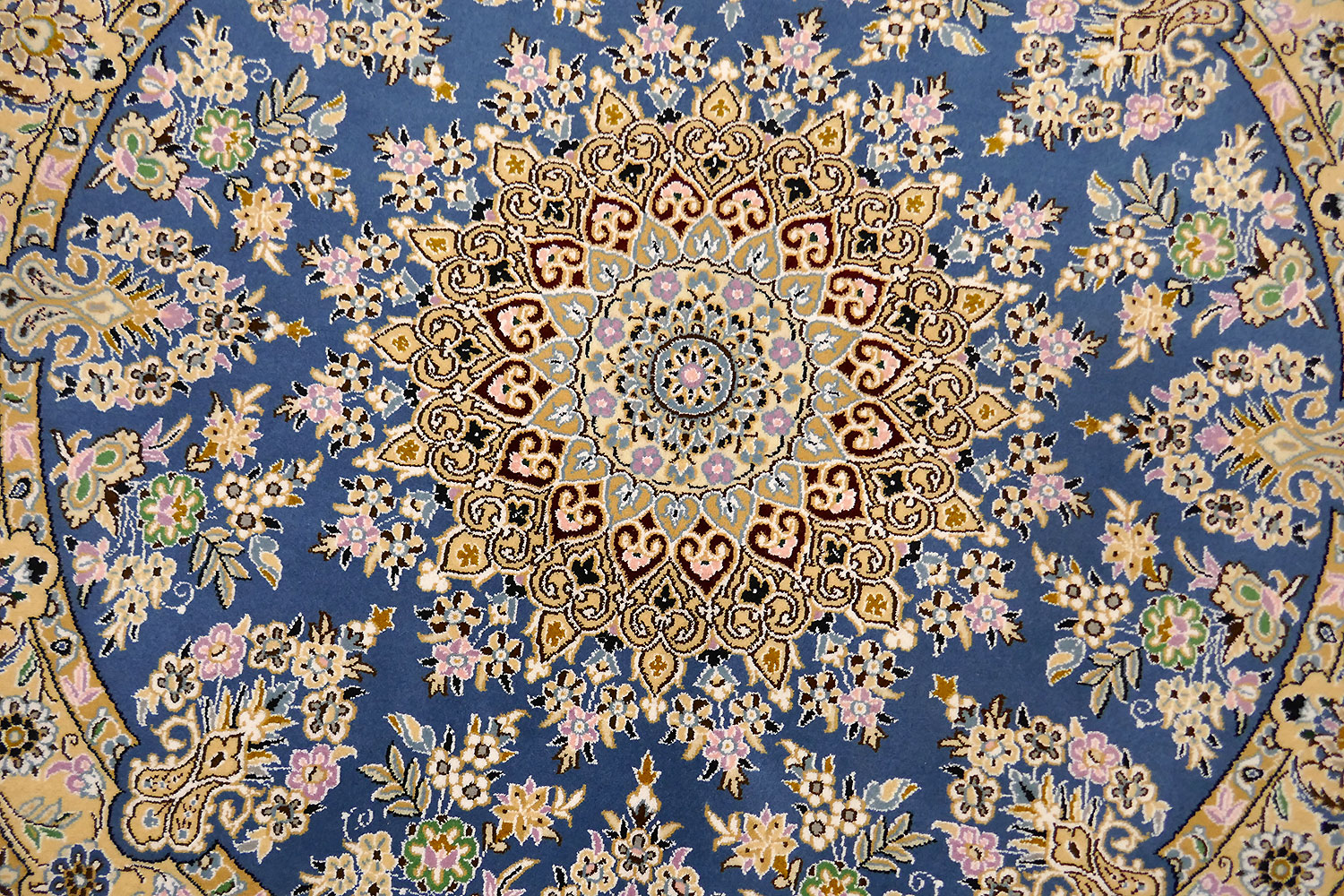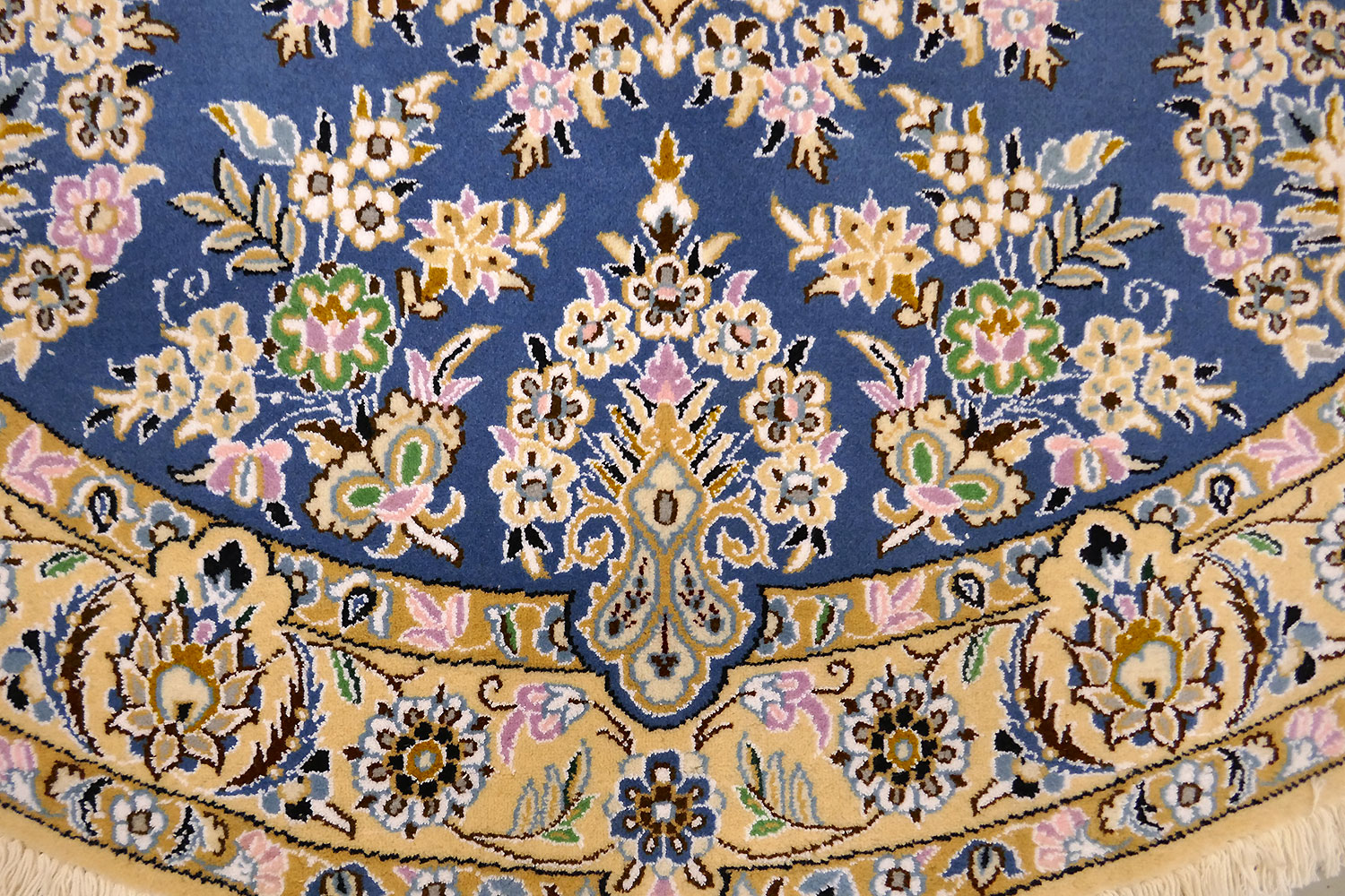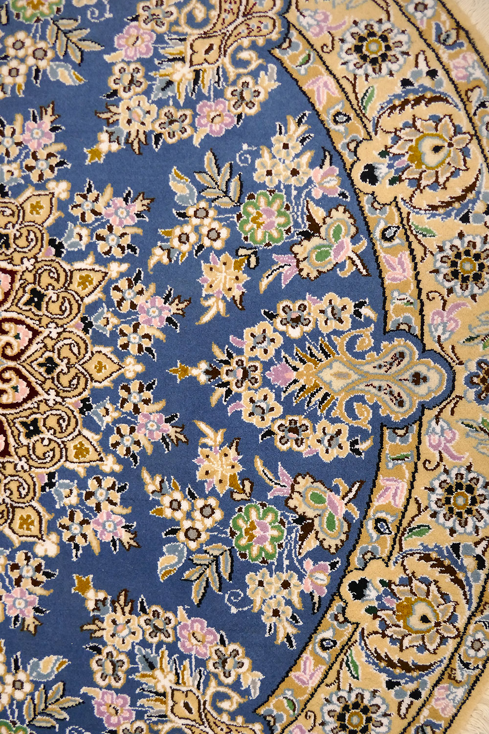 Dimensions : 150 x 150 cm -laine et soie- Pays Iran - Épaisseur : 9 mm - Densité de nouage : 360.000 Nœuds au m² - Surface : 2.25 m² - Poids : 5.63 Kgs - Age : contemporain - Confection : Noué main - Forme : Tapis rond - Type : Tapis persan