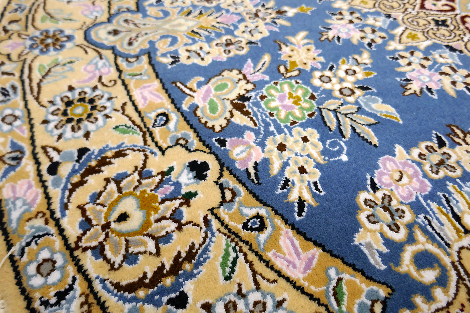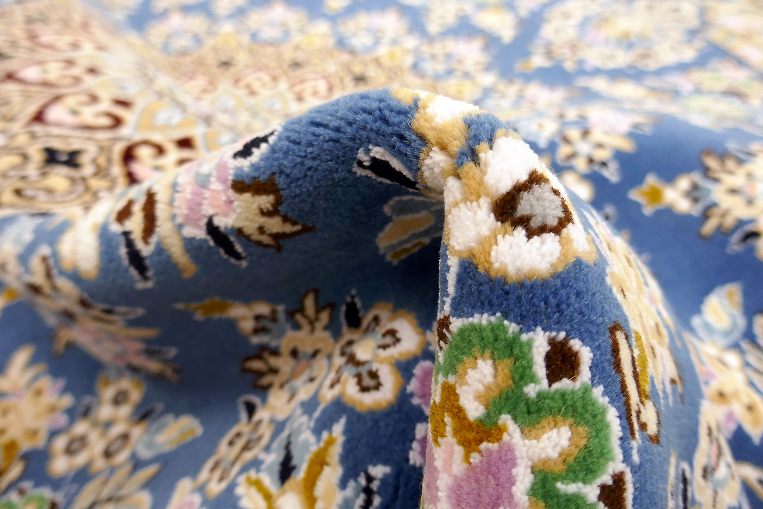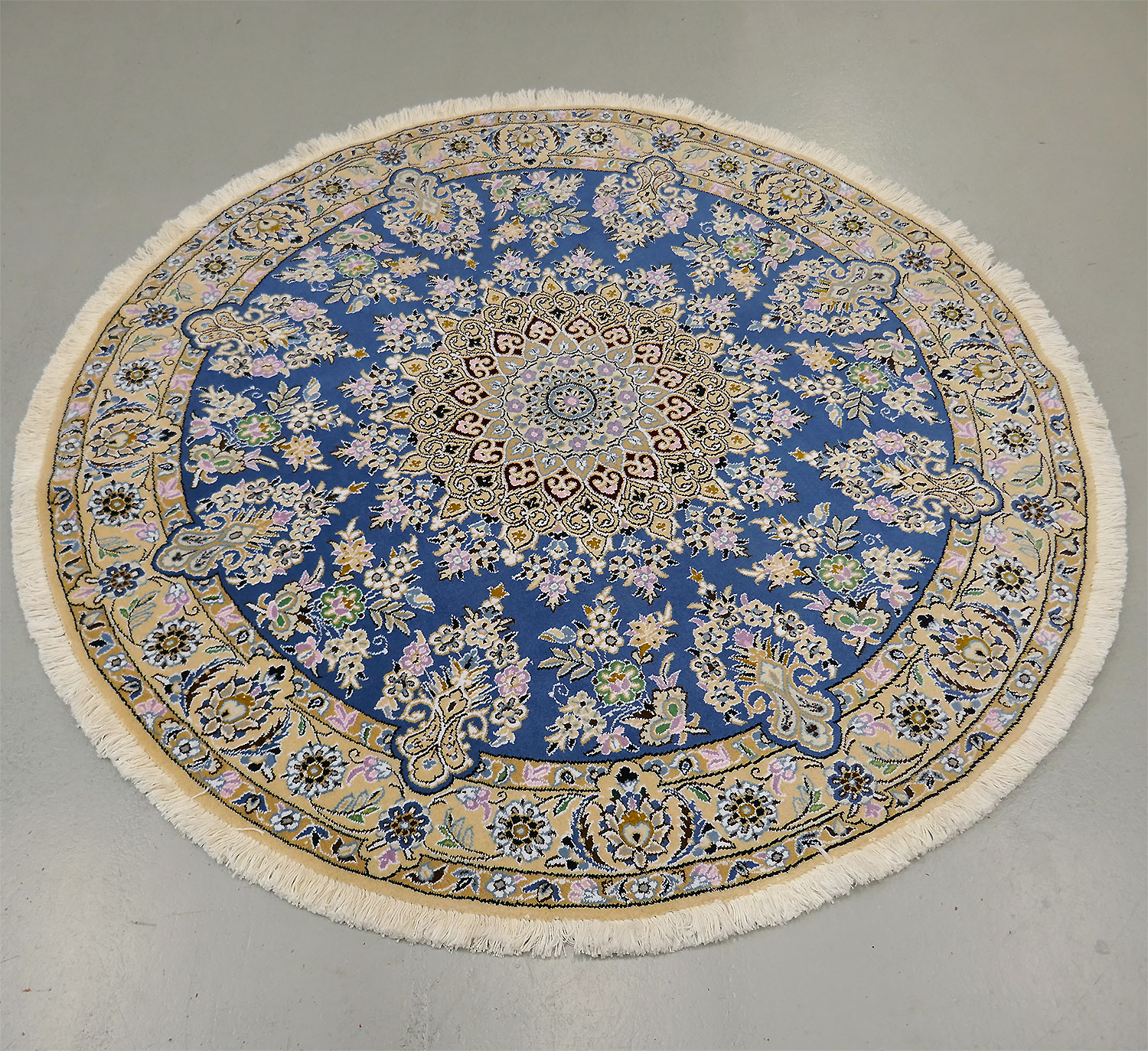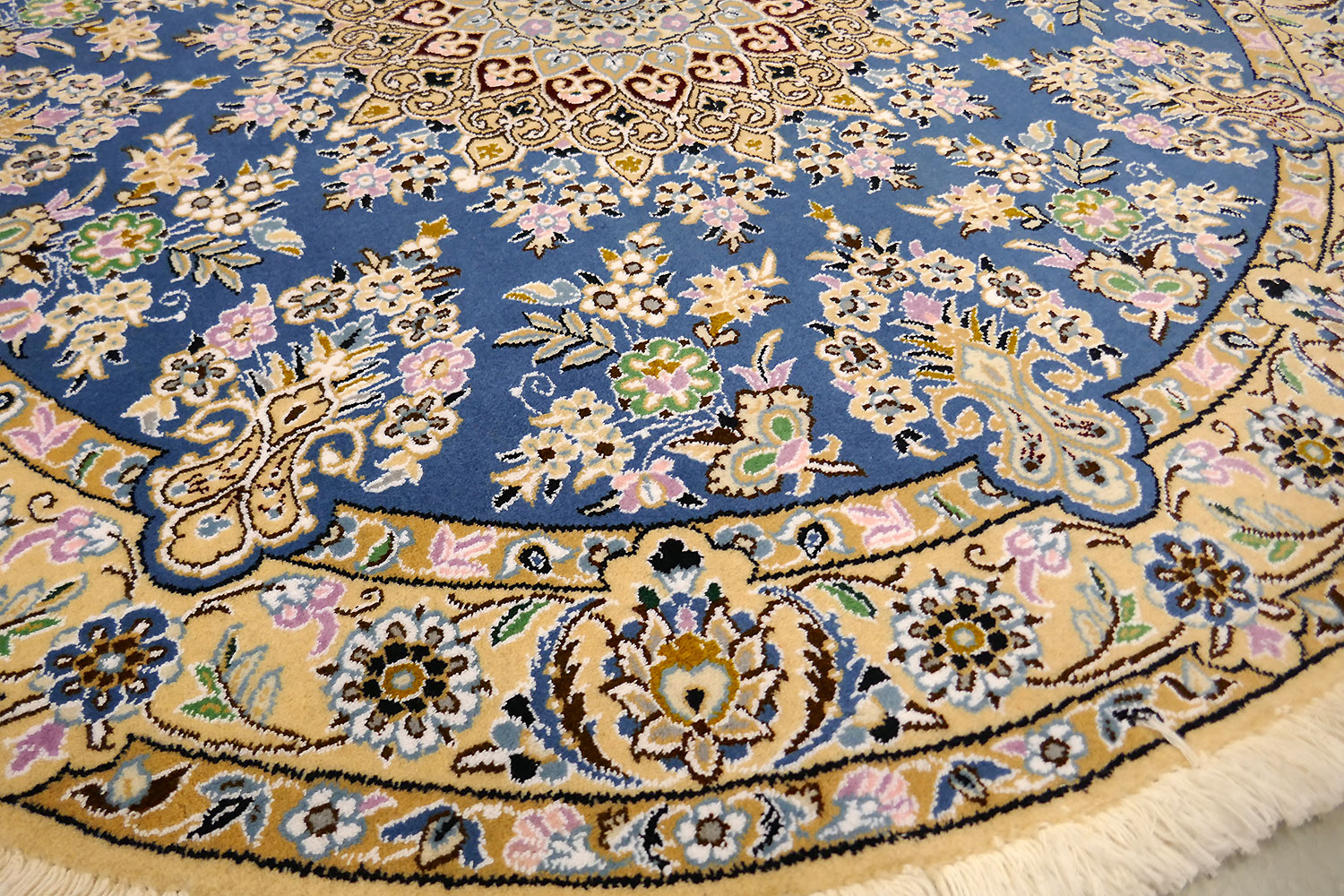 Dimensions : 150 x 150 cm -laine et soie- Pays Iran - Épaisseur : 9 mm - Densité de nouage : 360.000 Nœuds au m² - Surface : 2.25 m² - Poids : 5.63 Kgs - Age : contemporain - Confection : Noué main - Forme : Tapis rond - Type : Tapis persan