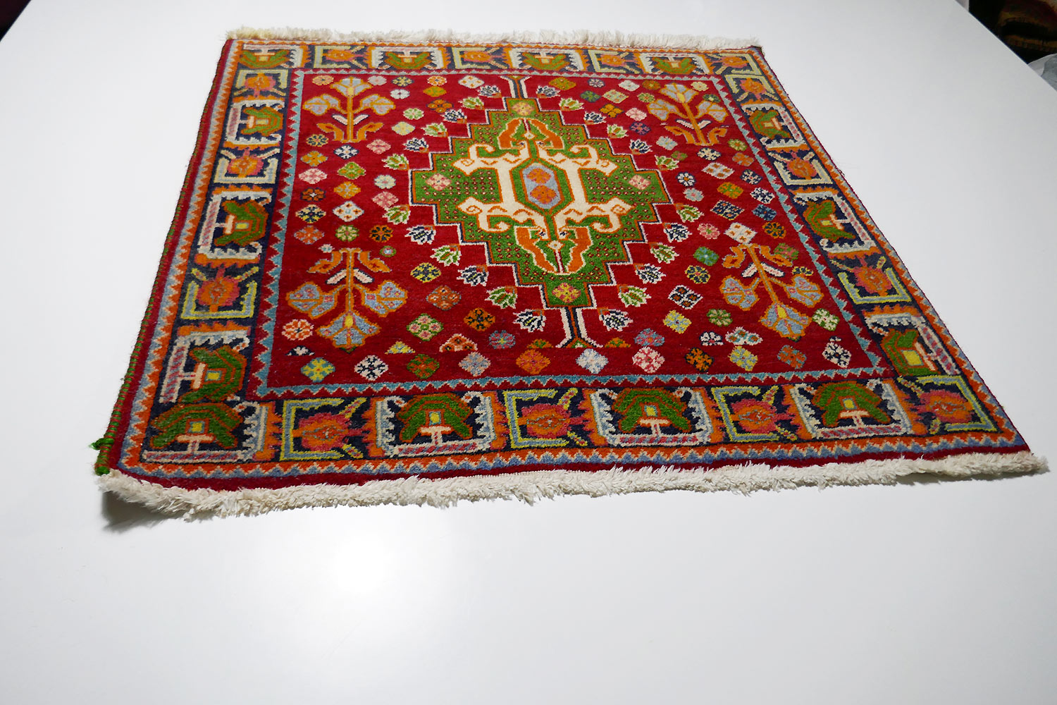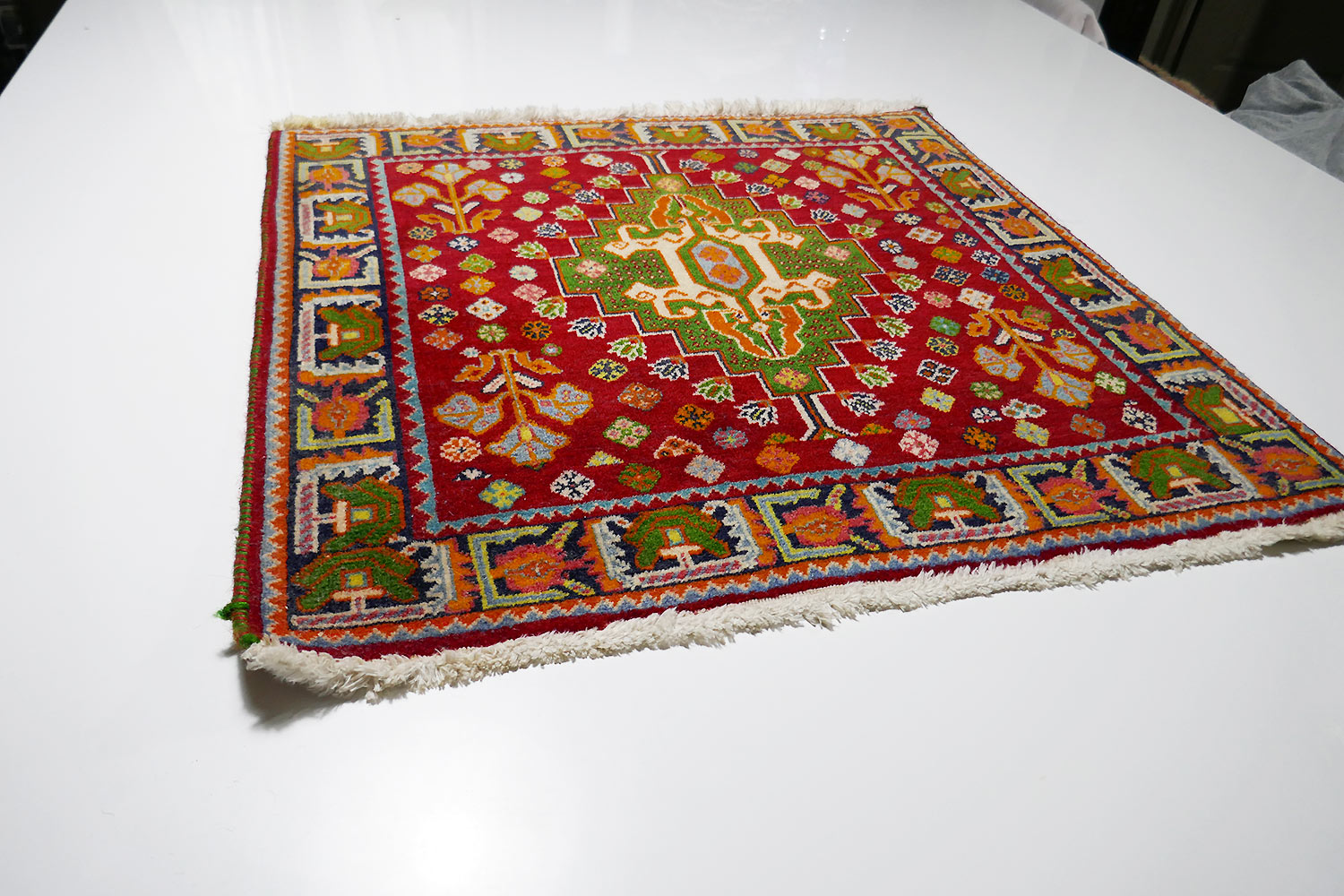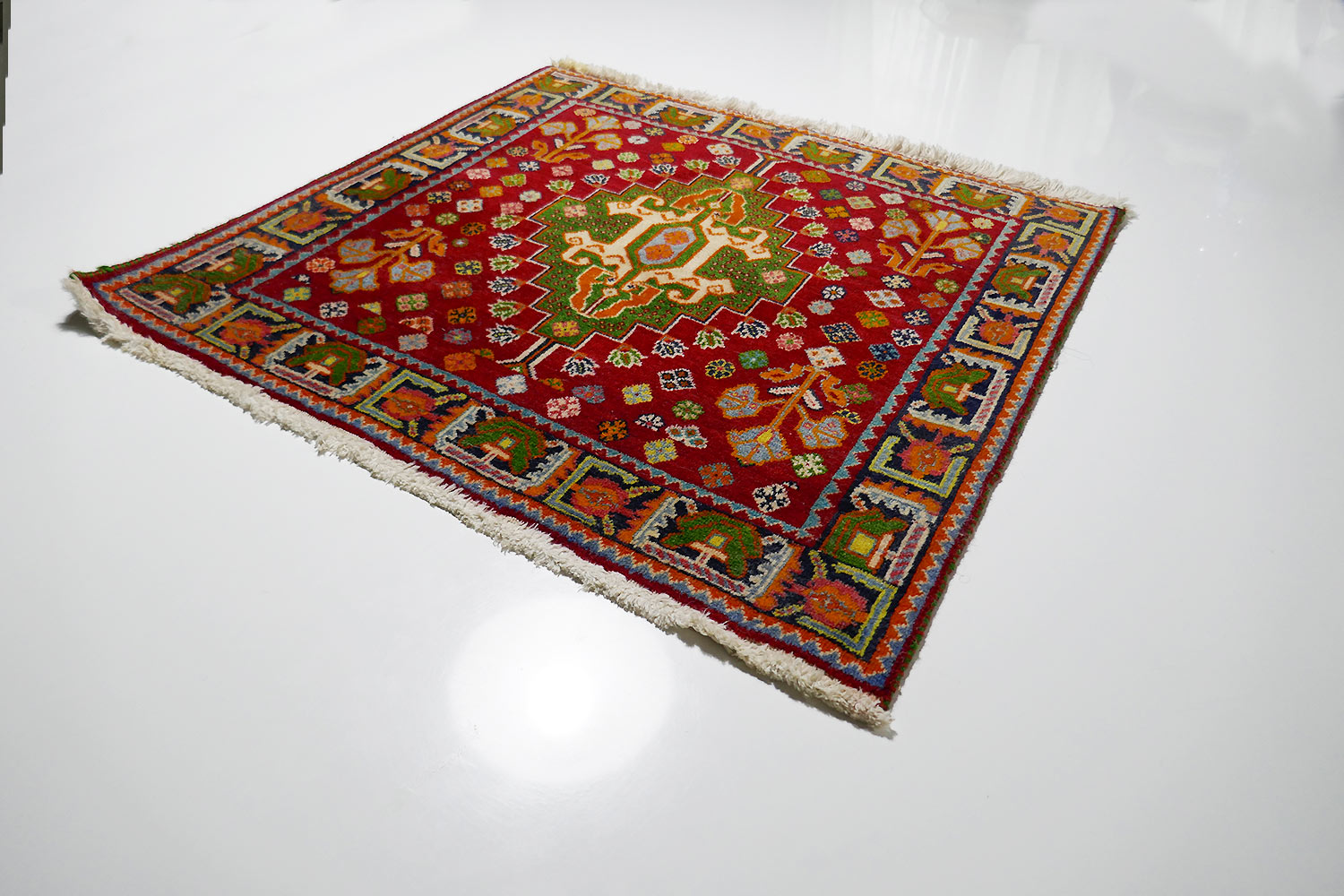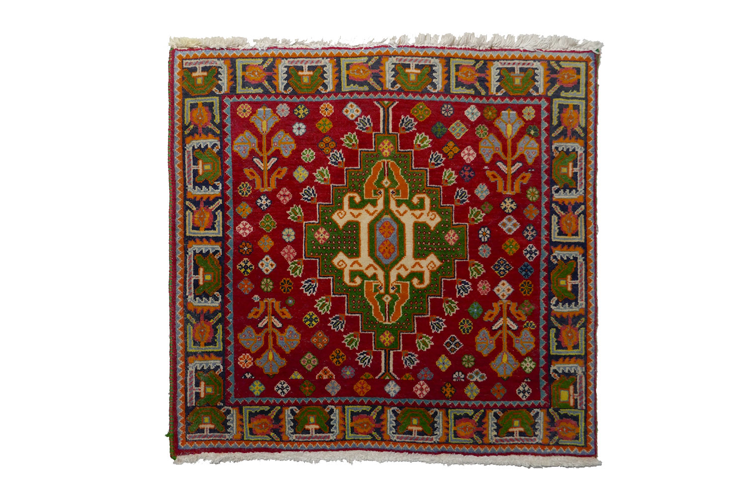 Dimensions : 112 x 105 cm -laine- Pays Iran - Épaisseur : mm - Densité de nouage : Nœuds au m² - Surface : 0 m² - Poids : 0 Kgs - Age : - Confection : - Forme : - Type :