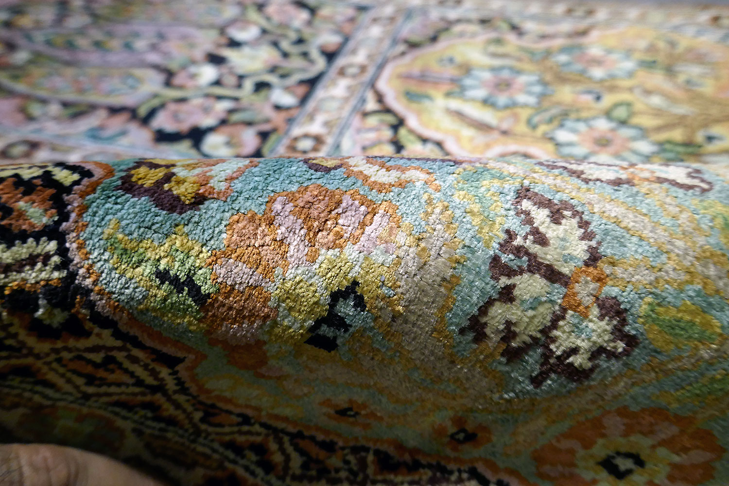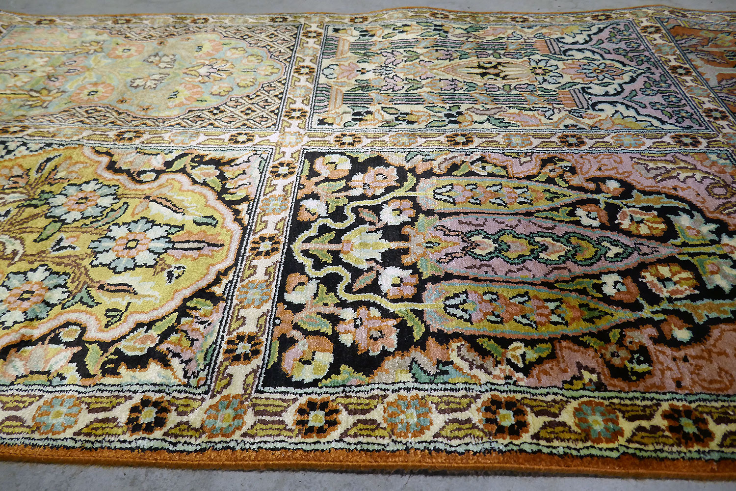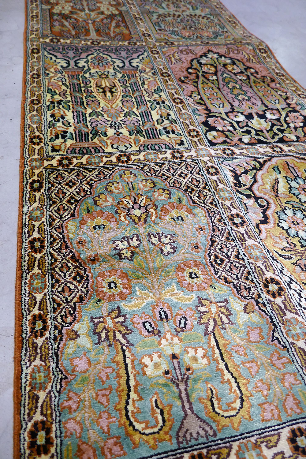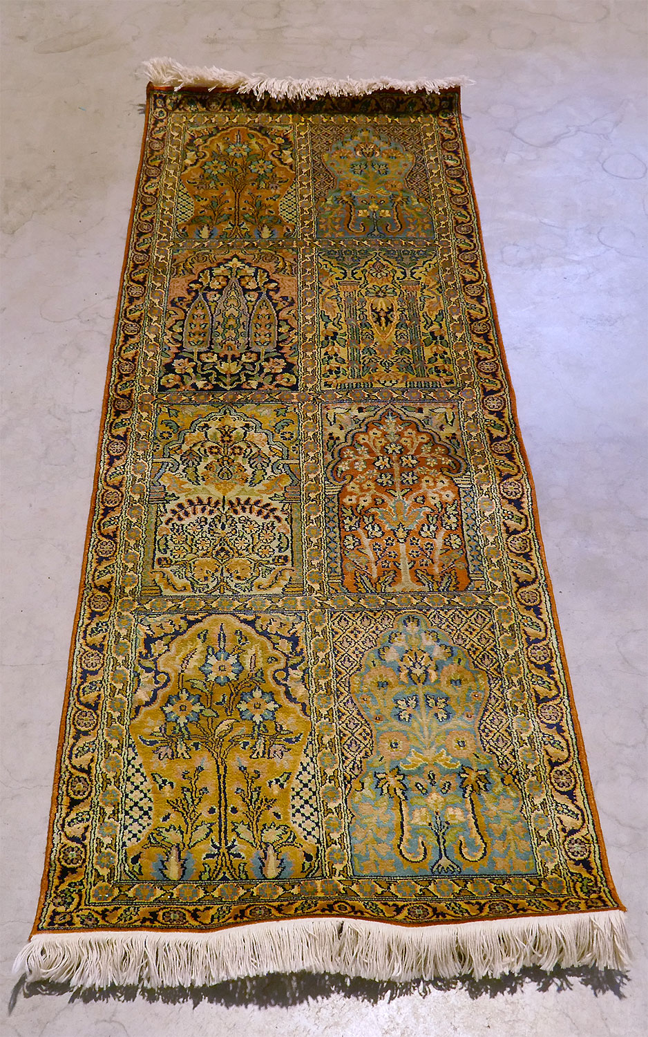 Dimensions : 179 x 64 cm -soie- Pays Inde - Épaisseur : 6 mm - Densité de nouage : 500.000 Nœuds au m² - Surface : 1.15 m² - Poids : 2.29 Kgs - Age : contemporain - Confection : Noué main - Forme : Tapis de couloirs - Type : Tapis Oriental