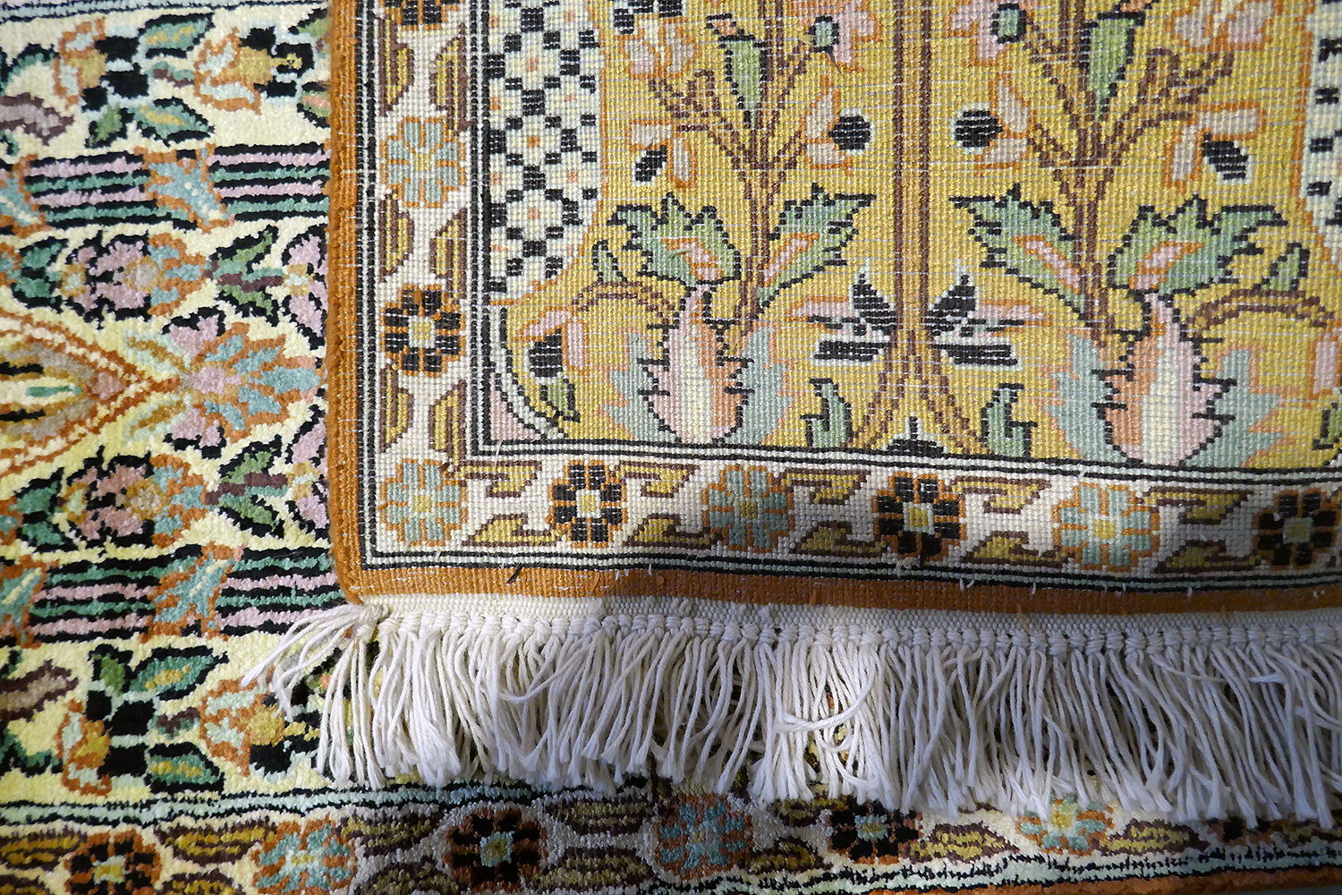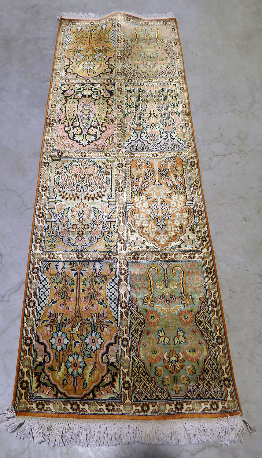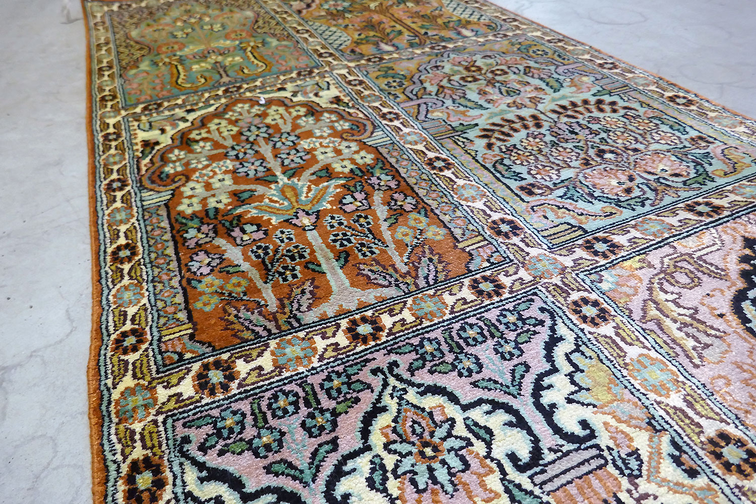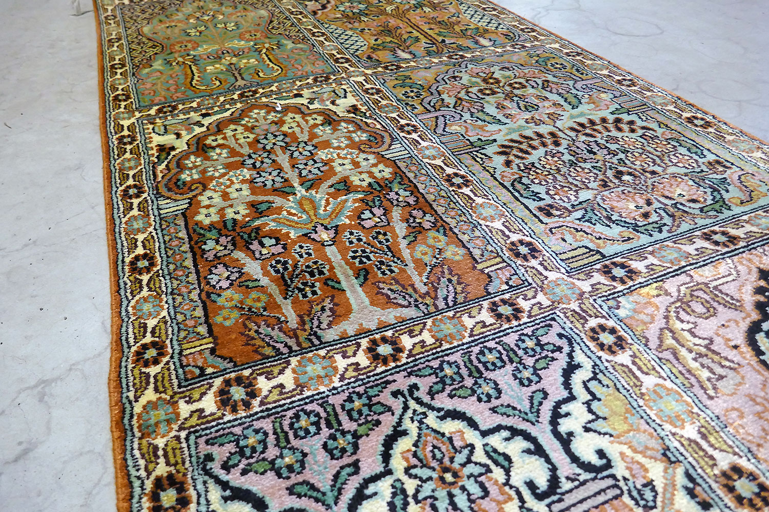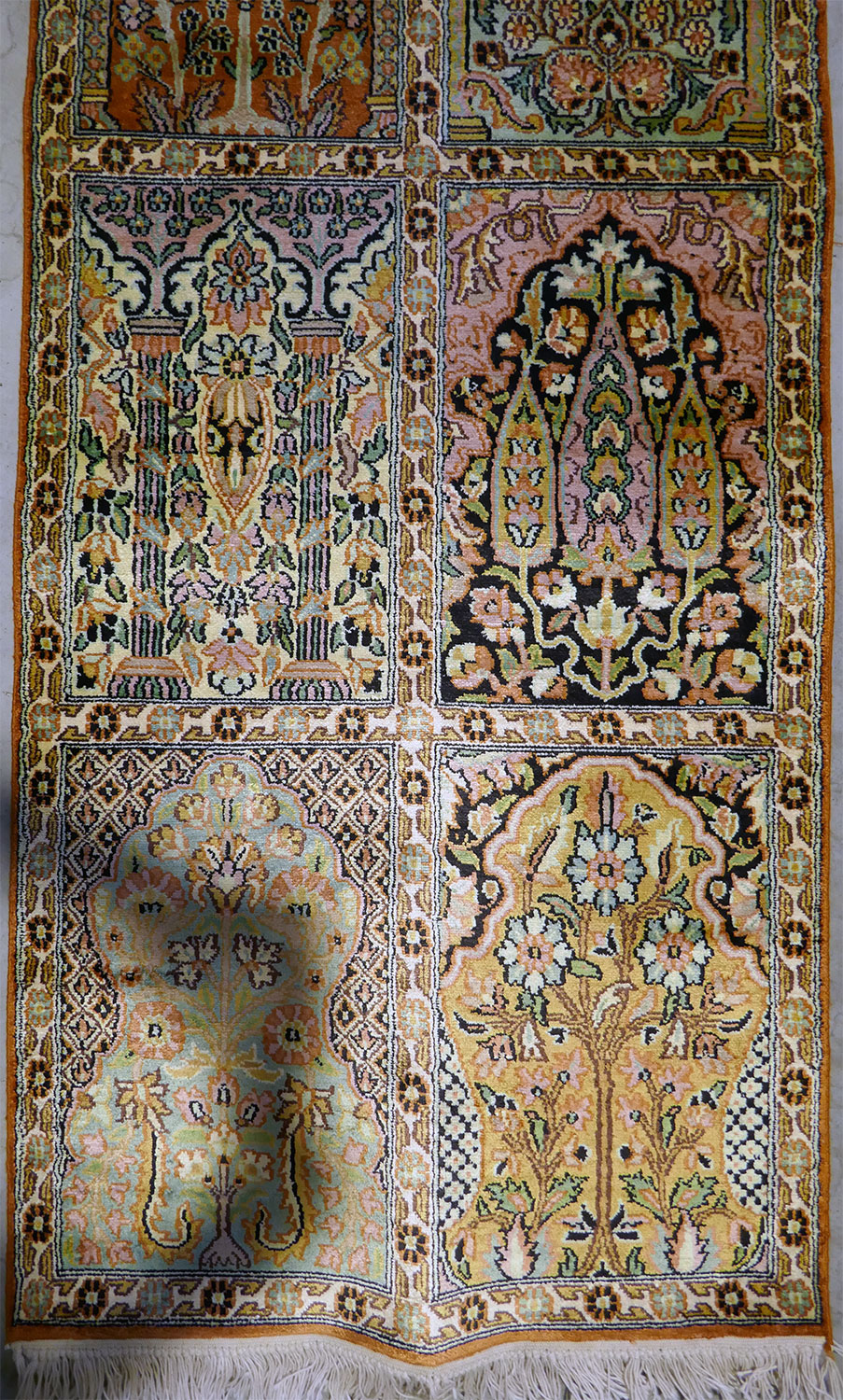 Dimensions : 170 x 65 cm -soie- Pays Inde - Épaisseur : 6 mm - Densité de nouage : 500.000 Nœuds au m² - Surface : 1.11 m² - Poids : 2.21 Kgs - Age : contemporain - Confection : Noué main - Forme : Tapis de couloirs - Type : Tapis Oriental